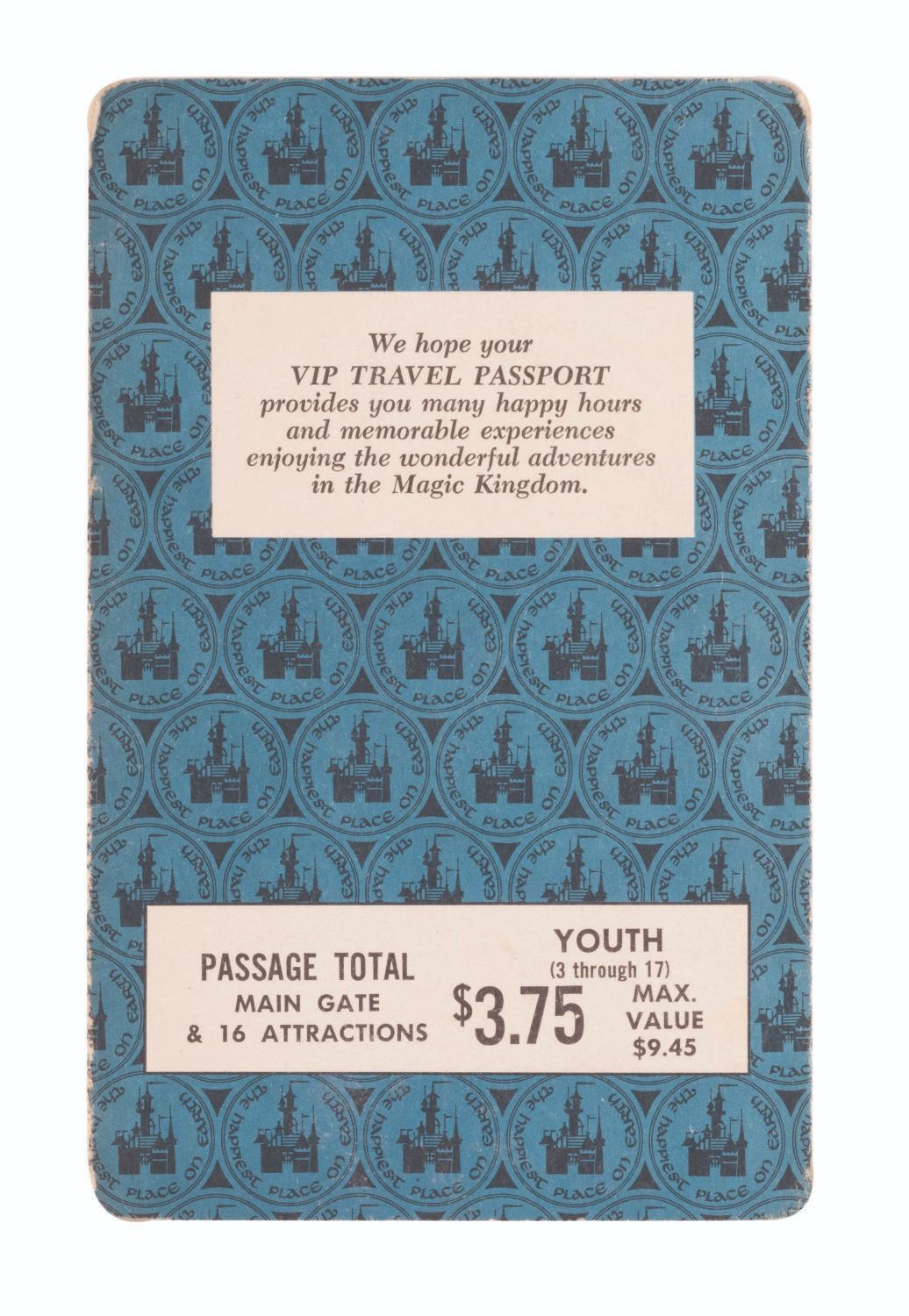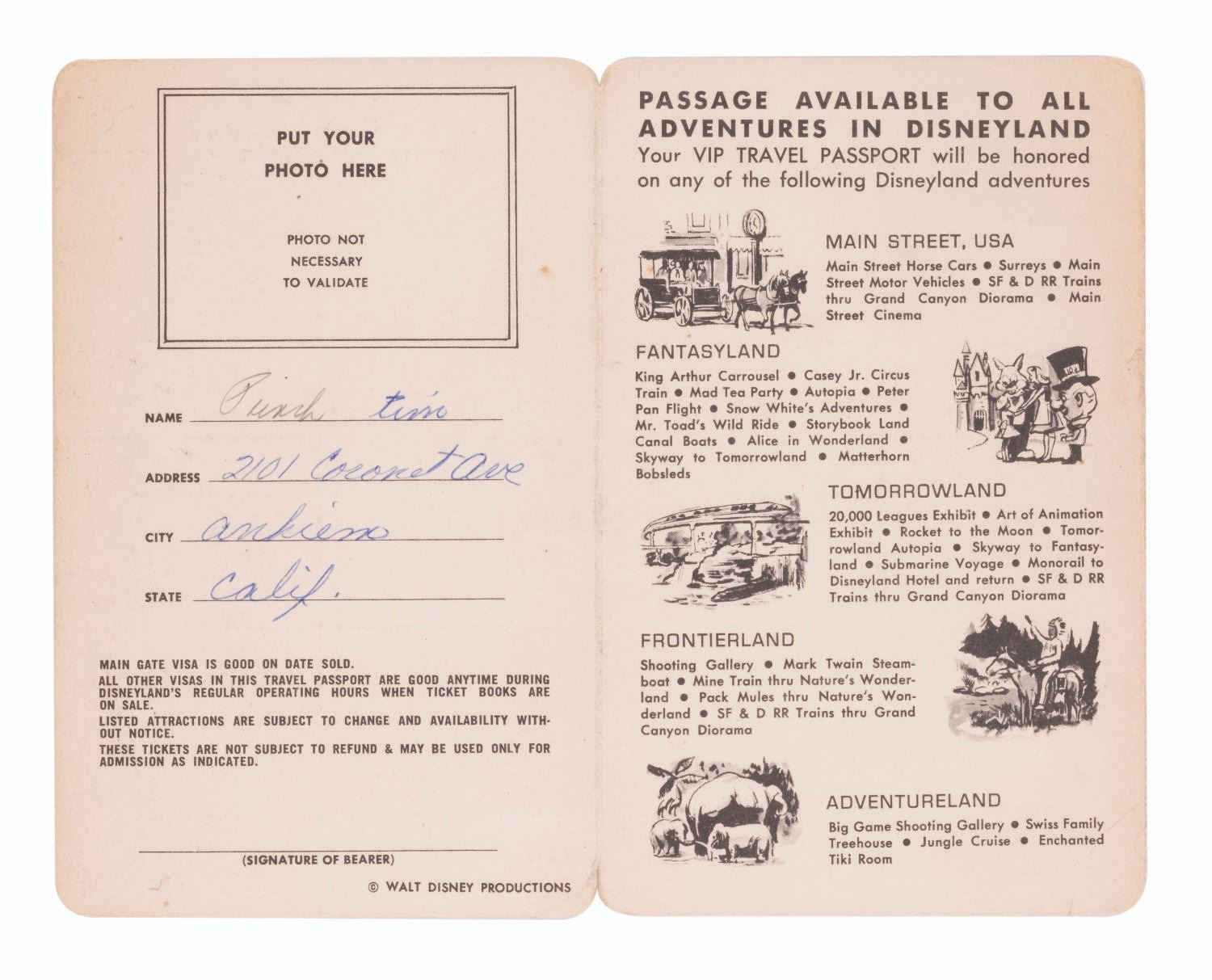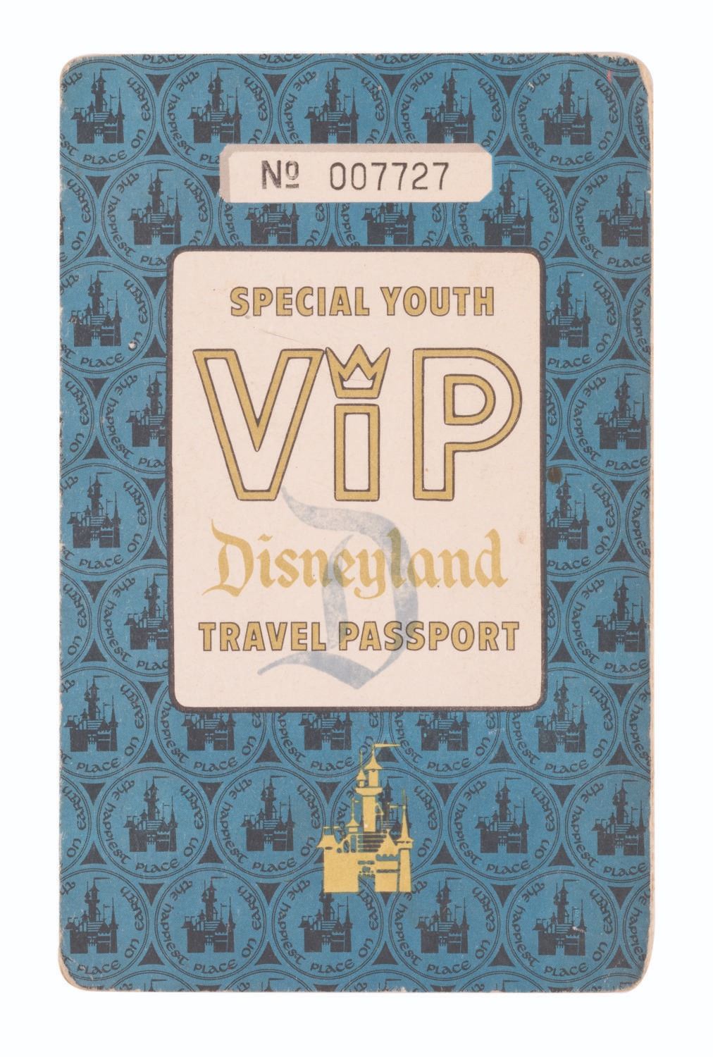 (Disneyland, 1960s) A Special Youth VIP Disneyland Travel Passport, featuring "passage available to all adventures in Disneyland." Measuring 3.75" x 6", the passport numbered 007727, is in good condition missing all of its ticket stubs, with creases, fading, and wear, and the name and address filled out in ink.