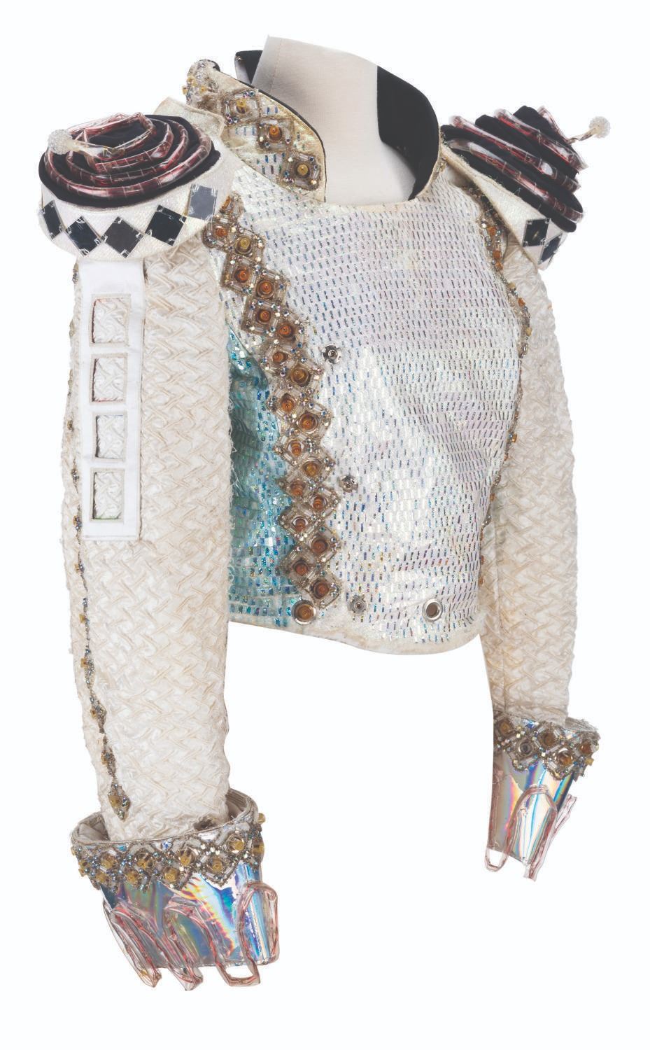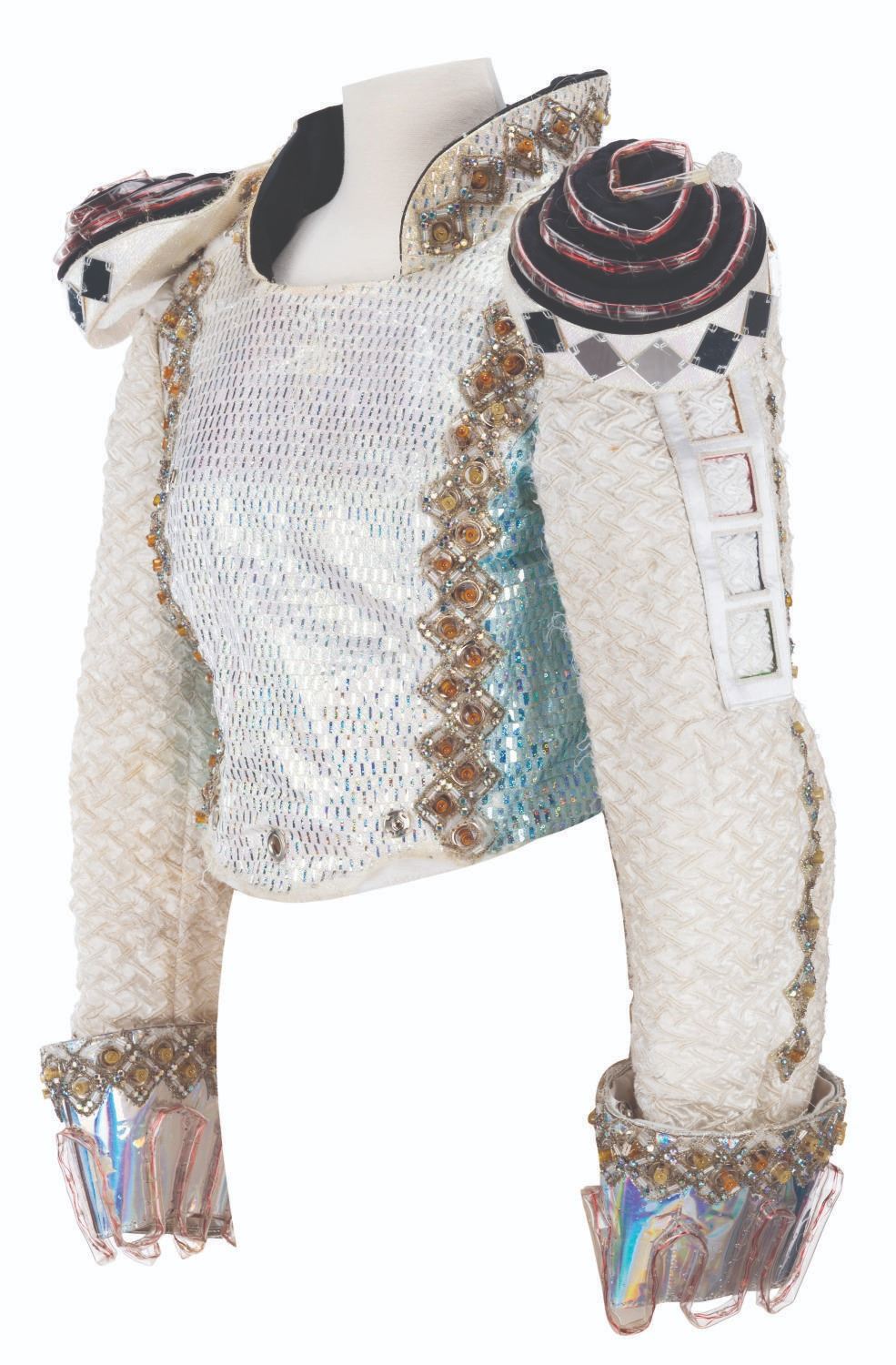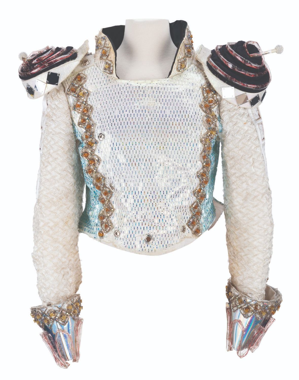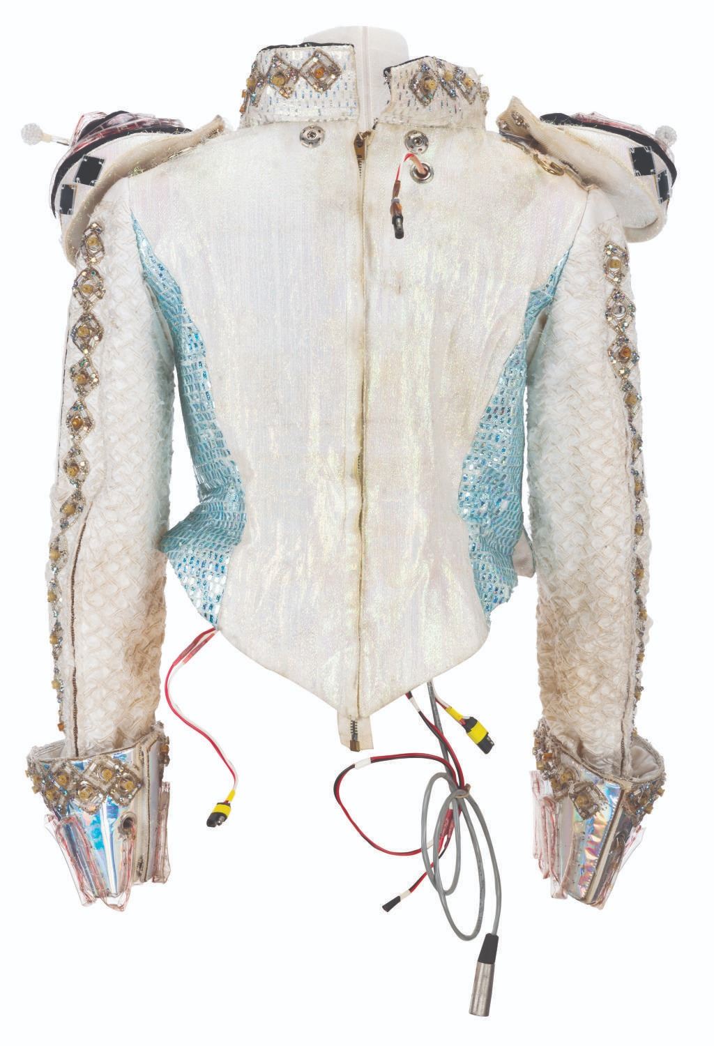 (Walt Disney World, 2000s) An elaborate jacket from the SpectroMagic Parade at Walt Disney World. The jacket was used by performers leading the title float of the parade. The jacket has a Walt Disney World Tag with the hand-written notations"Male,""I" and"#2" on the tag. The jacket has been wired with lights on the breast, sleeves, collar, cuffs, and shoulders. There are attachments on the back for an additional cape. The jacket retains all its wiring, but has not been tested for function. Overall it is in good condition with some wear and fraying to sleeves and yellowing to some lights.