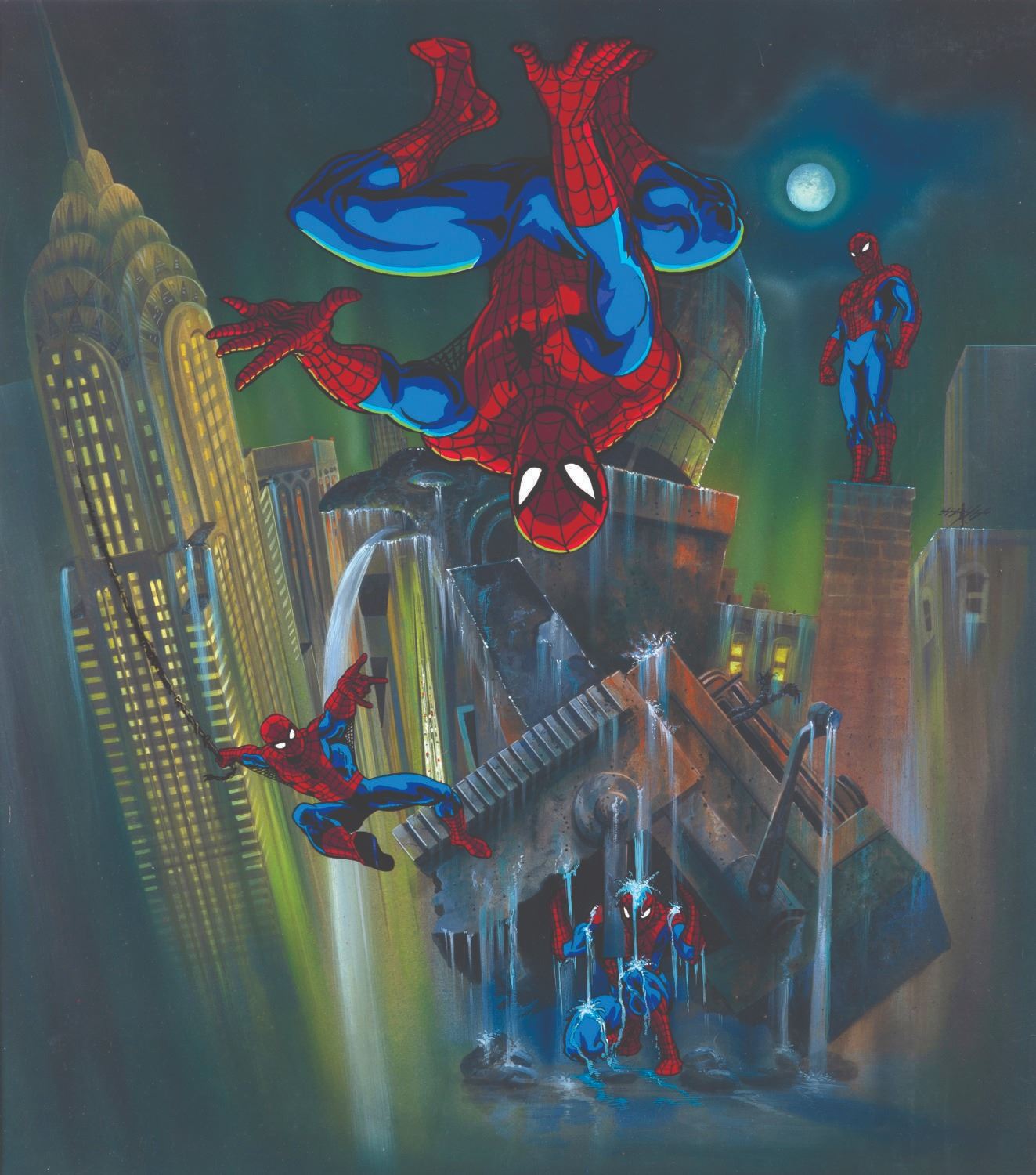 (FOX, 1990s) A very rare pitch cel for “Spider-Man: The Animated Series.” The art features recreations of an iconic panel from Spider-Man lore including those by Steve Ditko and John Romita Sr. The animated series ran on FOX for five seasons and first introduced the world to the Spider-Verse concept. Achieved on a 21” x 24” cel matted in a 26.75” x 29.75” custom frame, this unique piece of art is in very good condition with scratches and smudges.