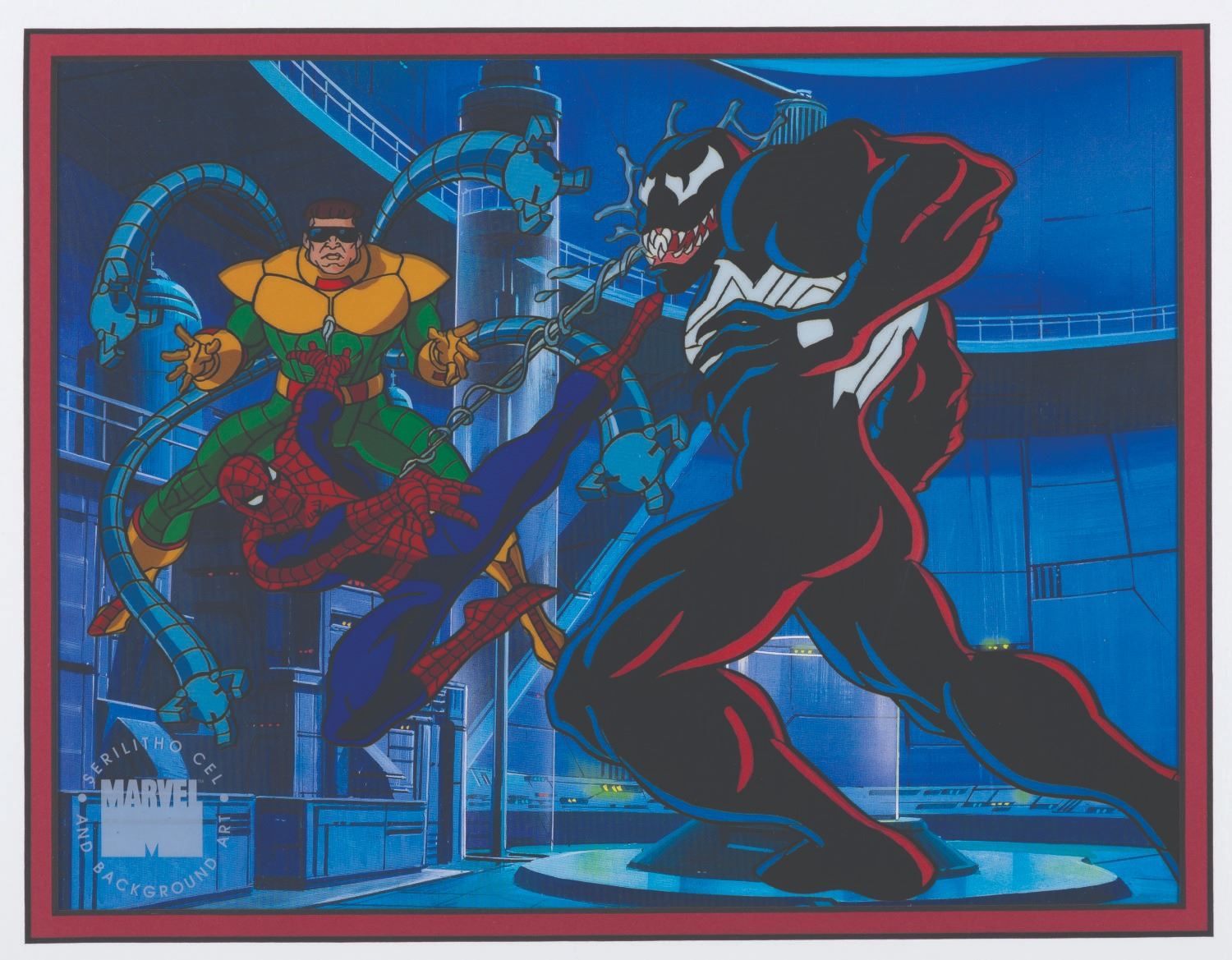 (Marvel, 1996) A serilitho cel of Spider-Man, Venom, and Doctor Octopus from “Spider-Man: The Animated Series." The characters have an image size of 7.5” x 10.25” on an 8” x 10.5” visible cel. The entire matted and framed piece measures 18.25” x 21.25”. The artwork is in fine condition with light scuffs to the frame.