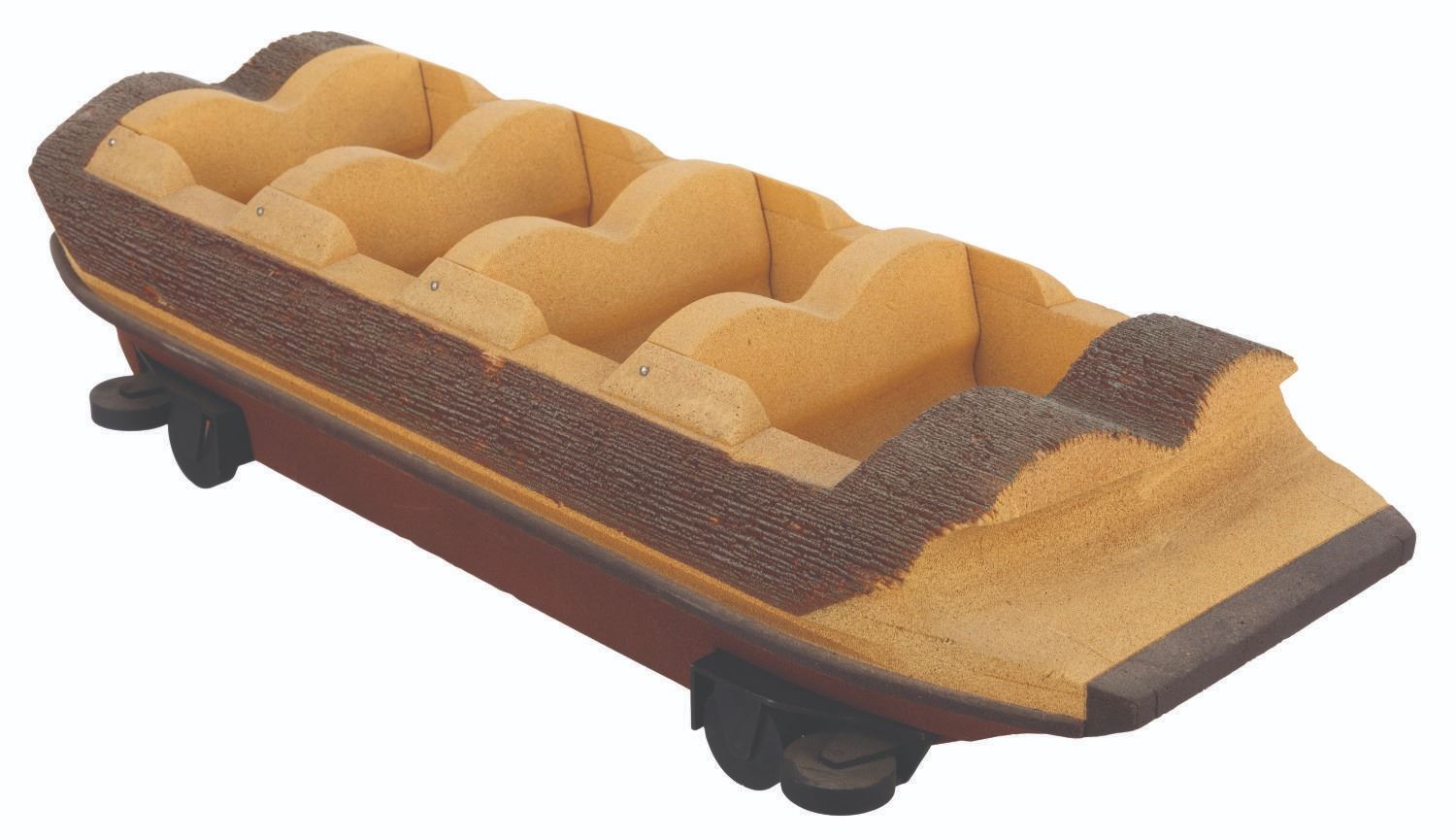 (Walt Disney World, 1992) A hand-crafted Splash Mountain ride vehicle concept model. Created by Walt Disney Imagineering for the Magic Kingdom version of the attraction, the log-shaped model is constructed of hand-carved foam held in place with metal pins. This model includes four rows that seat two Guests each, which differs from the original Disneyland version that seats one Guest per row. The "Song of the South"-inspired attraction closed at both U.S. parks in 2023, replaced by Tiana’s Bayou Adventure. Measuring 20.5" x 8.5" x 4.75" tall, the model is in very good condition with light wear.