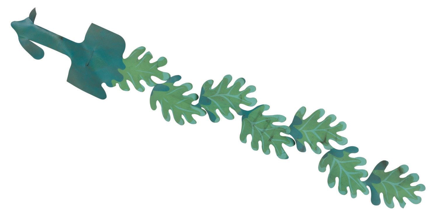 (Disneyland, 2000s) A leaf garland prop from show scenes of Splash Mountain at Disneyland. The garland of (7) hand-painted leaves is of the style used within the "Laughin' Place" show scene and was removed during a rehabilitation of the attraction. Measuring 54" long, the prop is in good condition with some paint loss, scuffs, and wear from Park-use.