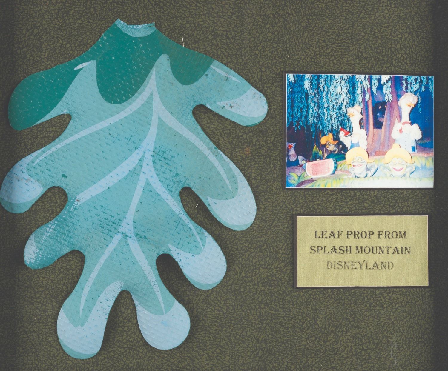 (Disneyland, 2000s) A leaf prop from Splash Mountain in Critter Country. The hand-painted leaf is of the style used within the "Laughing Place" show scene and was removed during a previous rehabilitation of the now-closed attraction. Measuring 5.5" x 7.5" in a 10.5" x 11.75" x 0.5" custom frame featuring a ride photo, the prop is in very good, Park-used condition with light signs of wear.