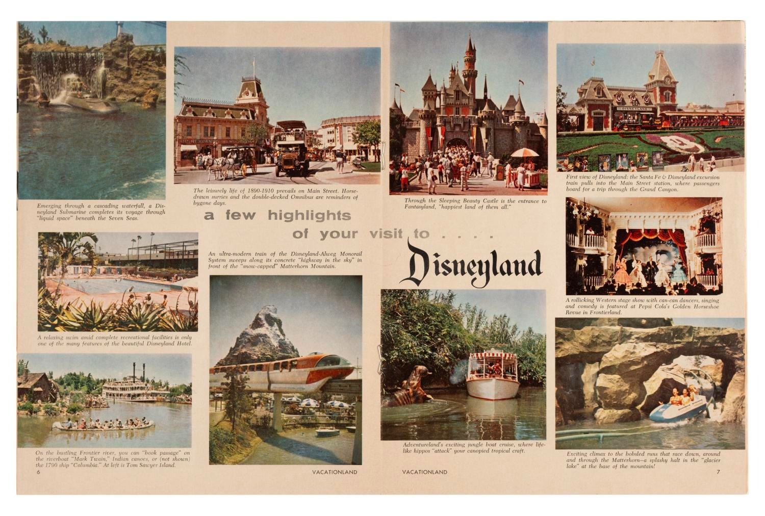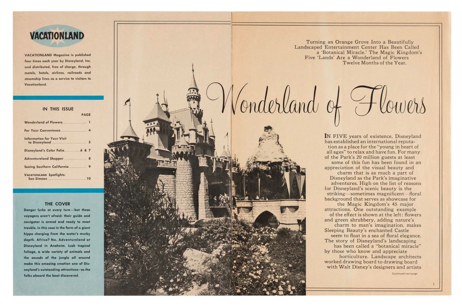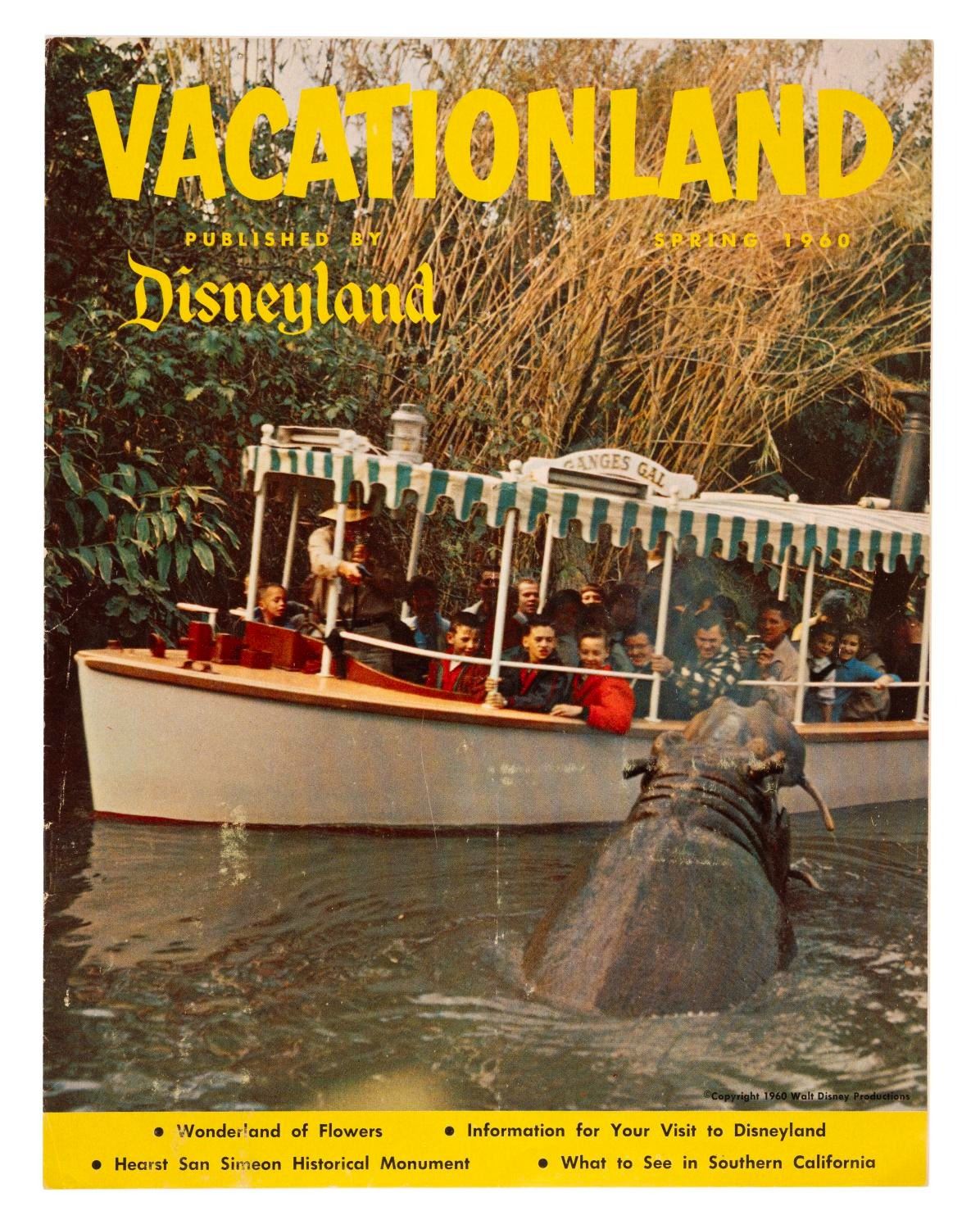 (Disneyland, 1960) A Spring 1960 issue of Vacationland featuring the Jungle Cruise on the cover. Measuring 8.25” x 10.75”, the magazine is in fair condition with heavy creases throughout, a light full vertical fold down the center, spots of color loss, scuffs, and wear.