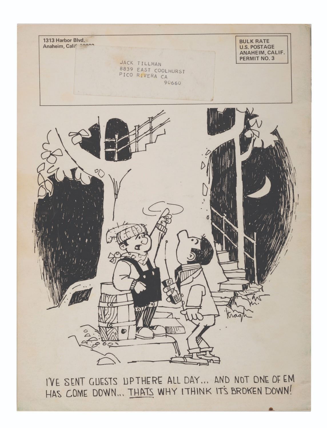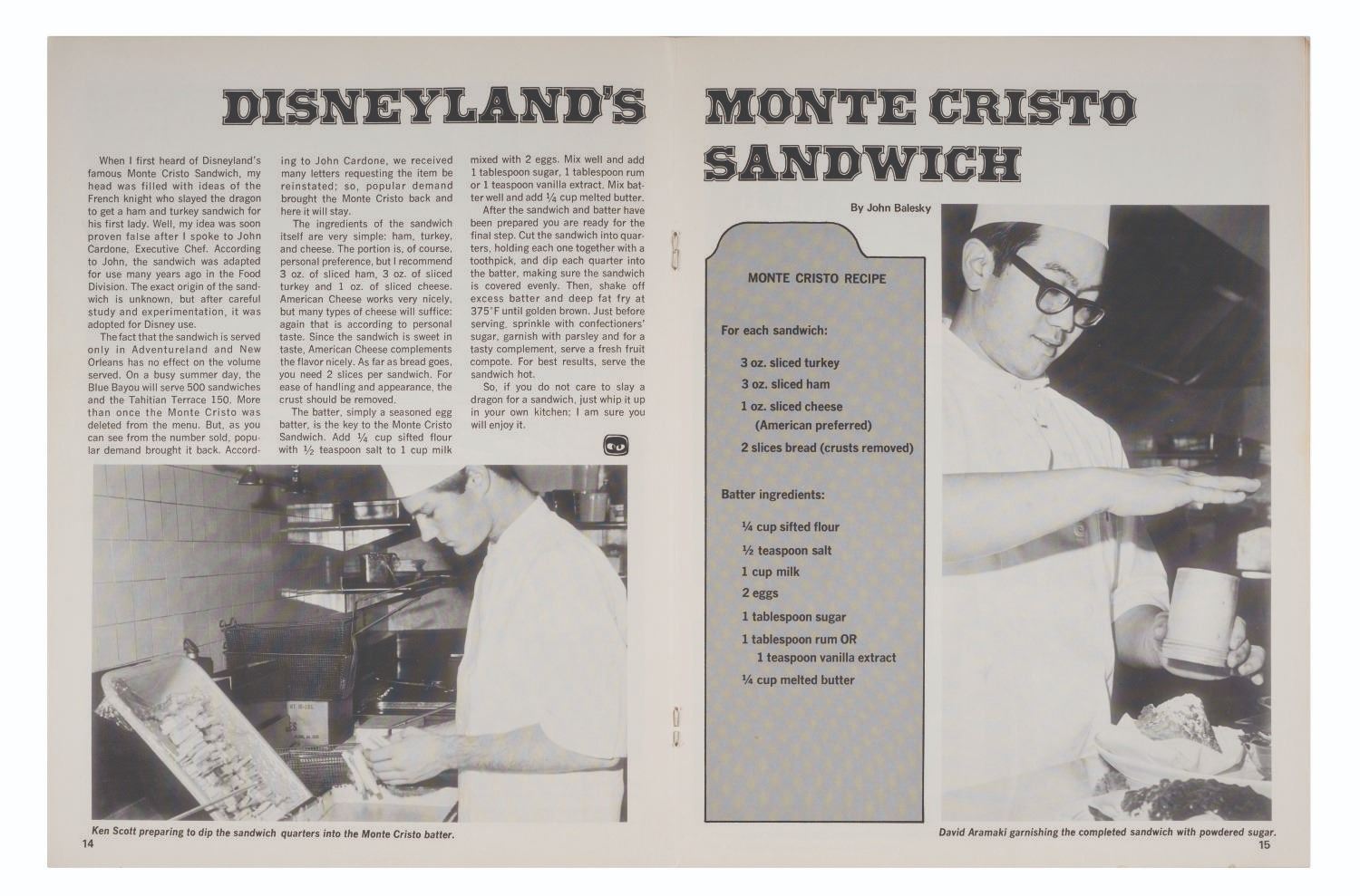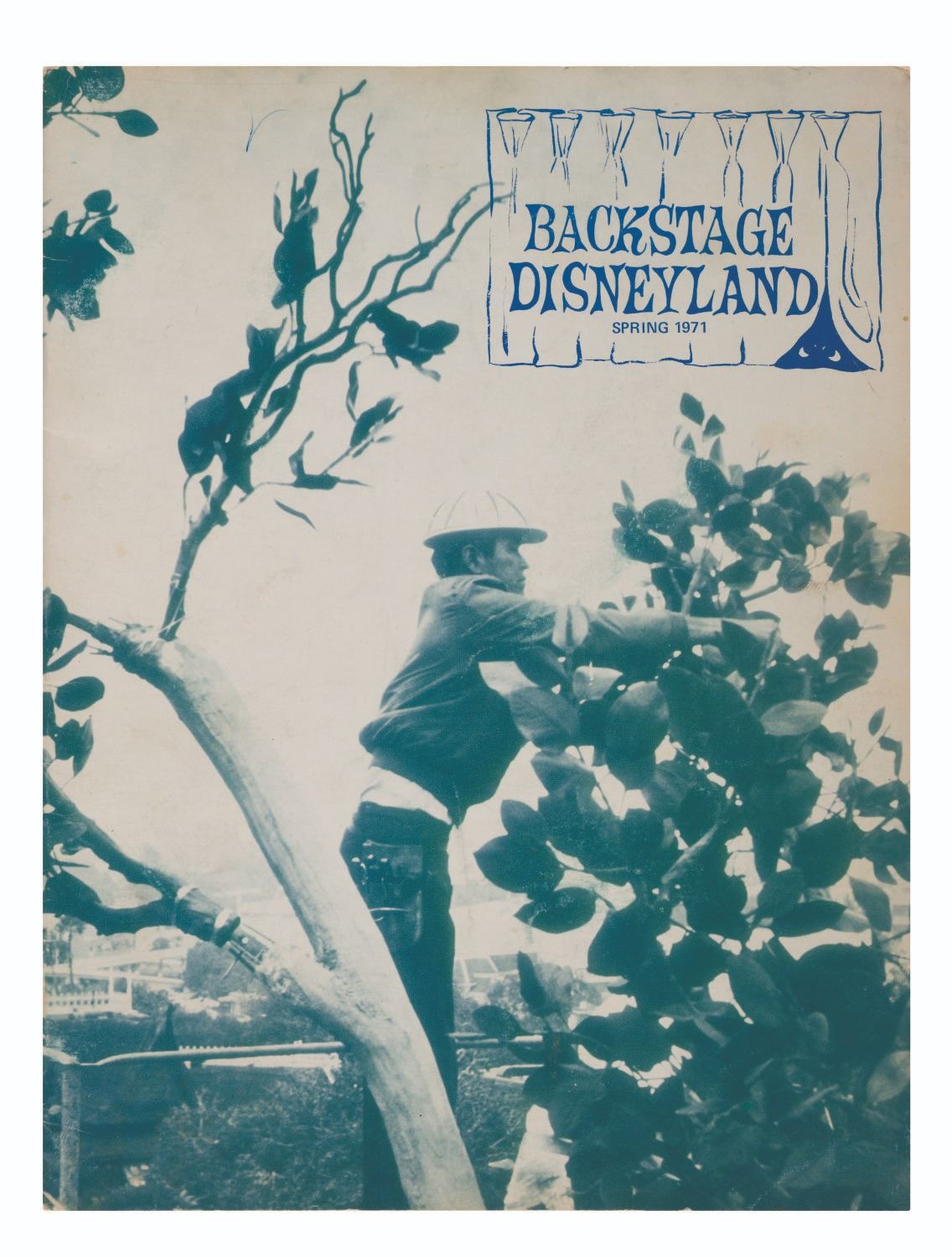(Disneyland, 1971) A spring 1971 issue of Backstage Disneyland, published by Disney University for Cast Members. This 28-page publication is filled with Cast Member inside gossip, including articles on rehab work for the Swiss Family Treehouse, the grass of Disneyland, and the Disneyland Monte Cristo sandwich recipe. The magazine is in good condition with handling wear mainly to the cover.