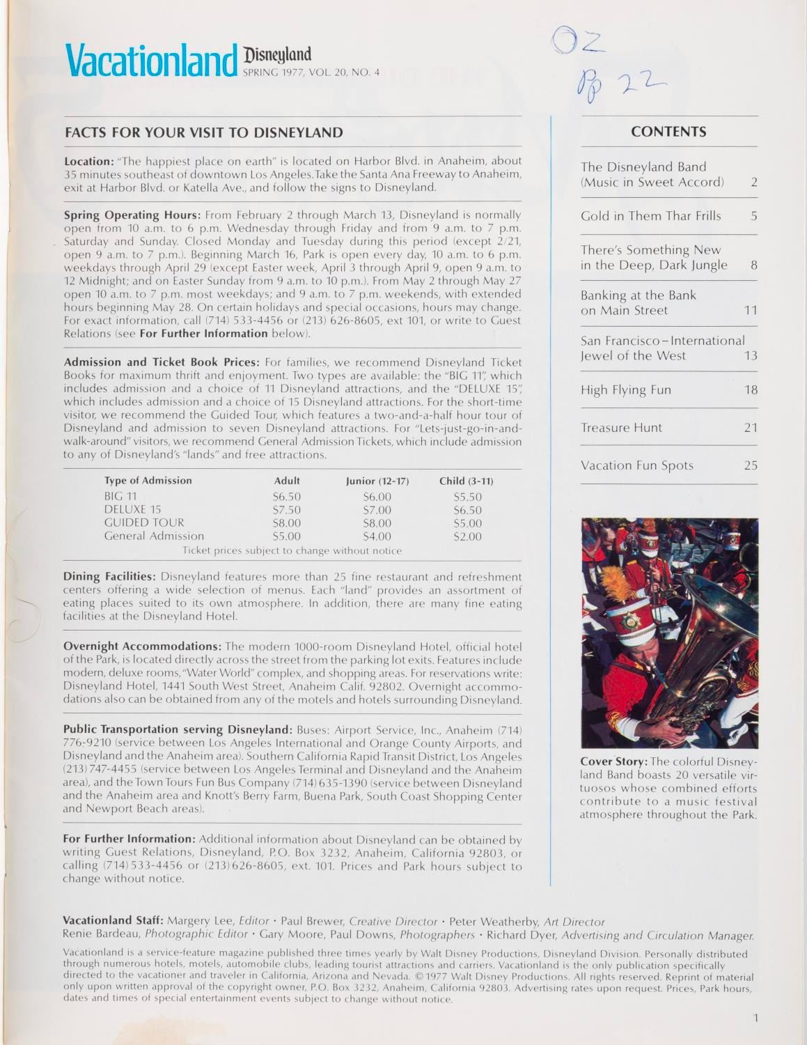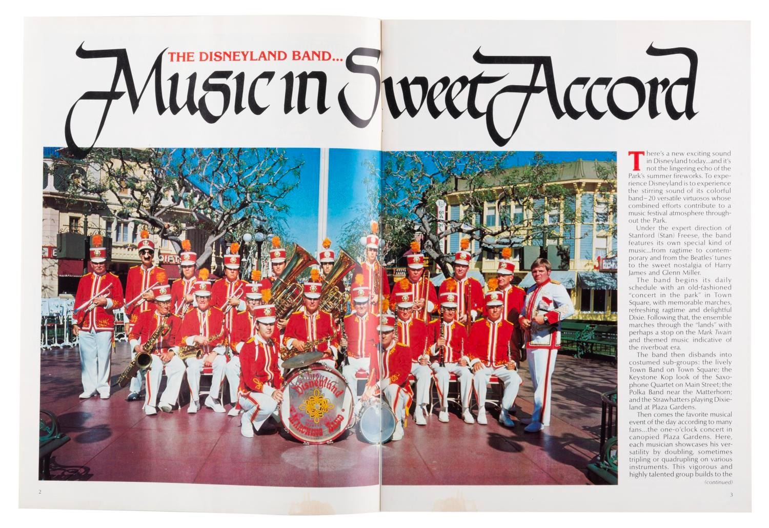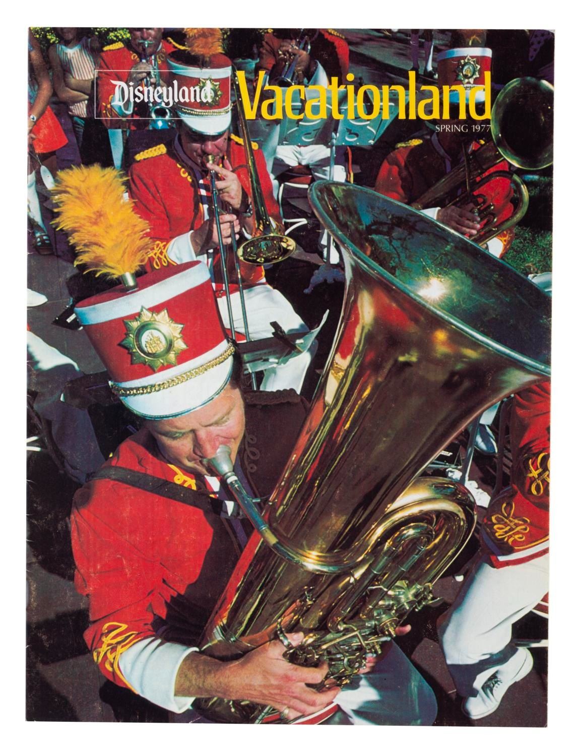 (Disneyland, 1977) A Spring 1977 issue of Disneyland Vacationland magazine featuring a cover story on the Disneyland Band. The magazine is in good condition with typical handling wear, and faint stains at the bottom edge of some pages.
