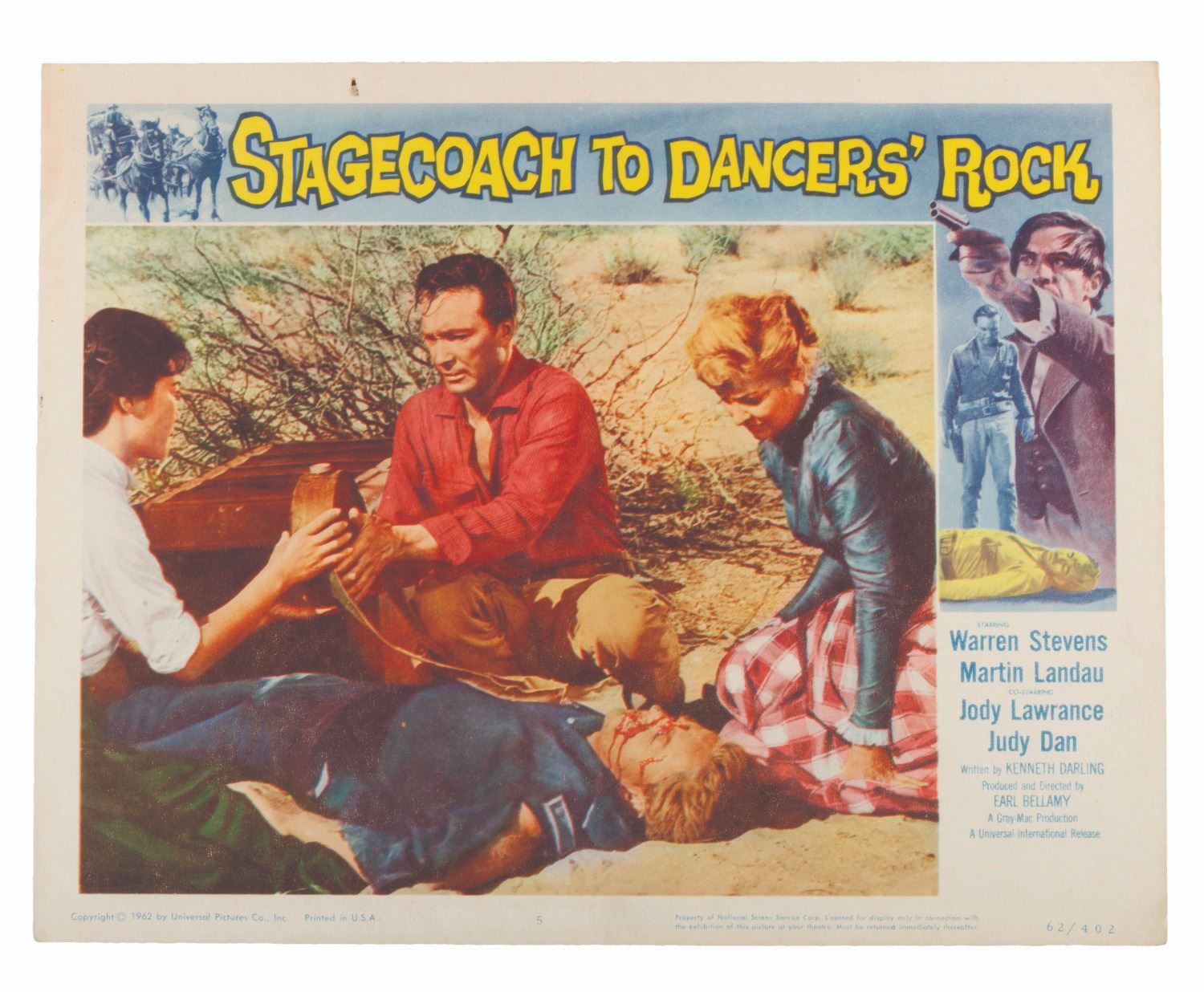 (Universal, 1962) A lobby card from the Western film "Stagecoach to Dancer’s Rock. " Measuring 11 " x 14 ", the lobby card is in very good condition with discoloration from age and light wear.