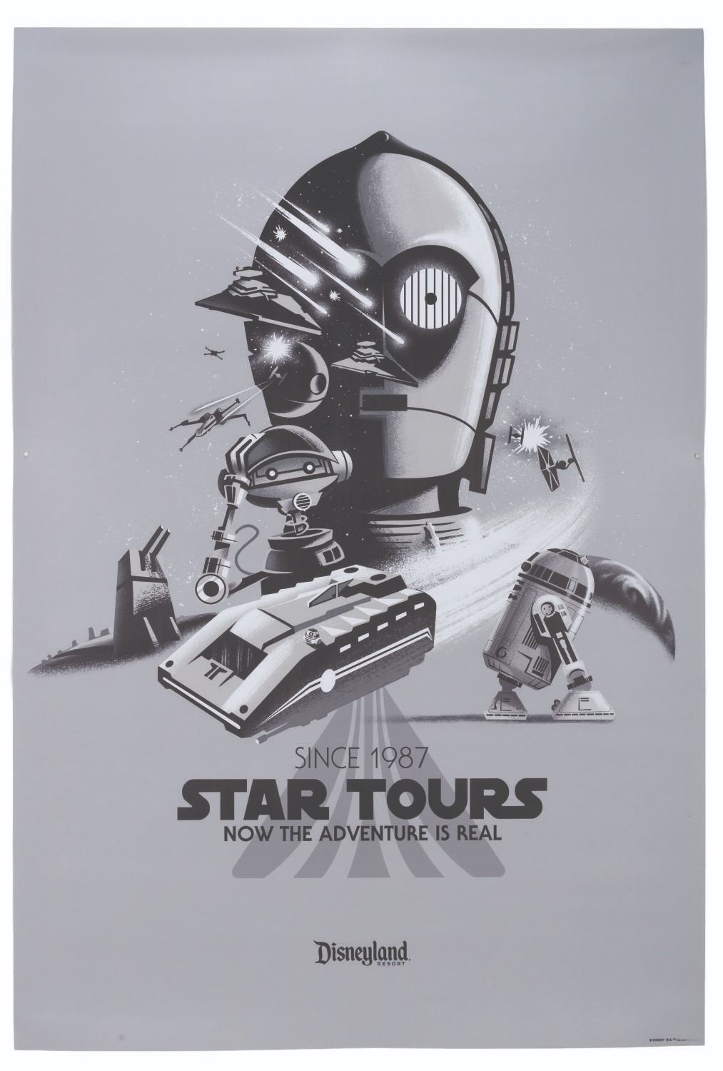 (Disneyland, 2017) A Star Tours attraction poster commemorating the space flight simulator's 30th anniversary with stylish character collage artwork by Ron Cohee and Richard Terpstra. The poster was released as part of the Through the Years collection and was only available at the 2017 D23 Expo. Measuring 36" x 54", the poster is in very good condition with light edge wear and minor creasing near the bottom from storage.