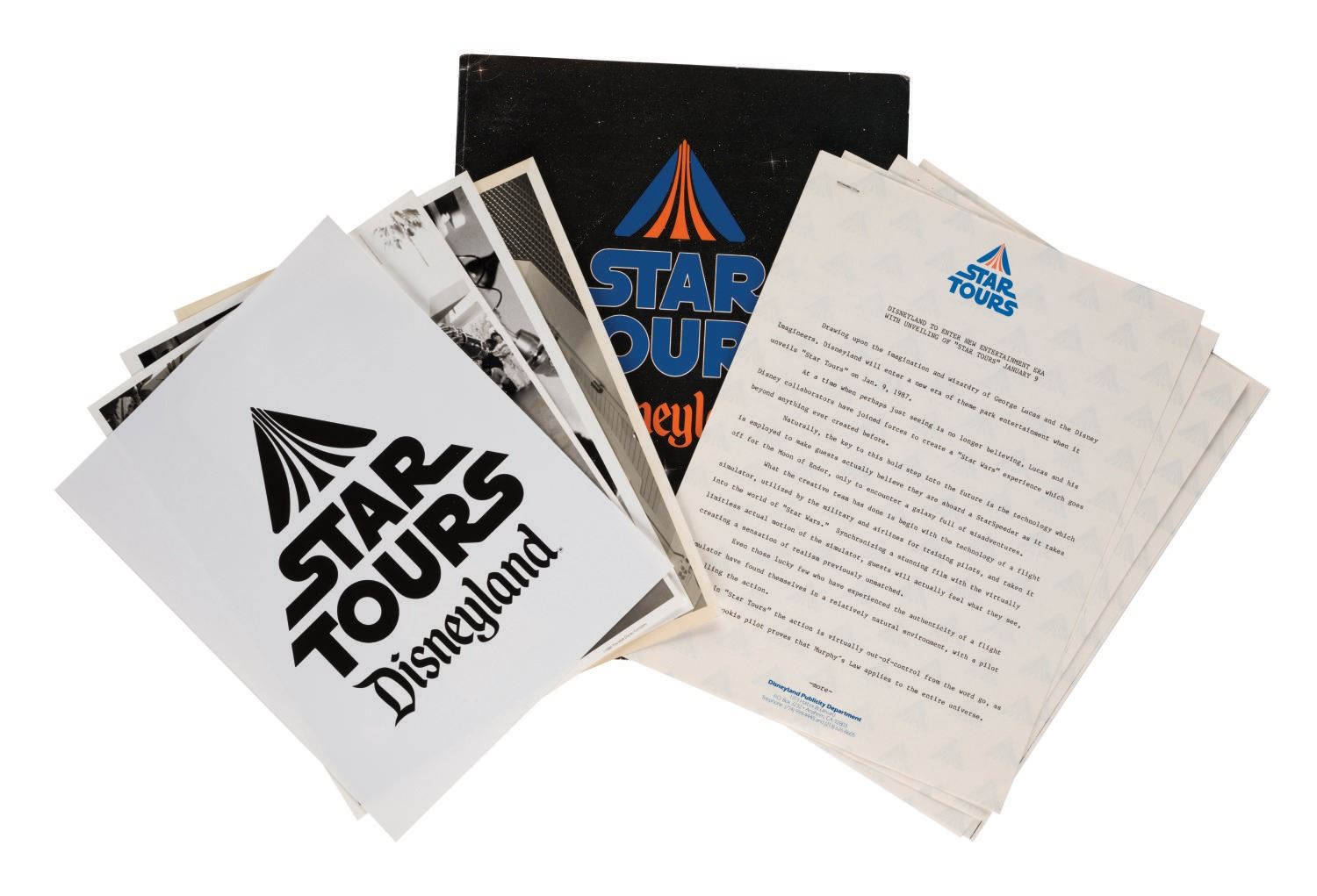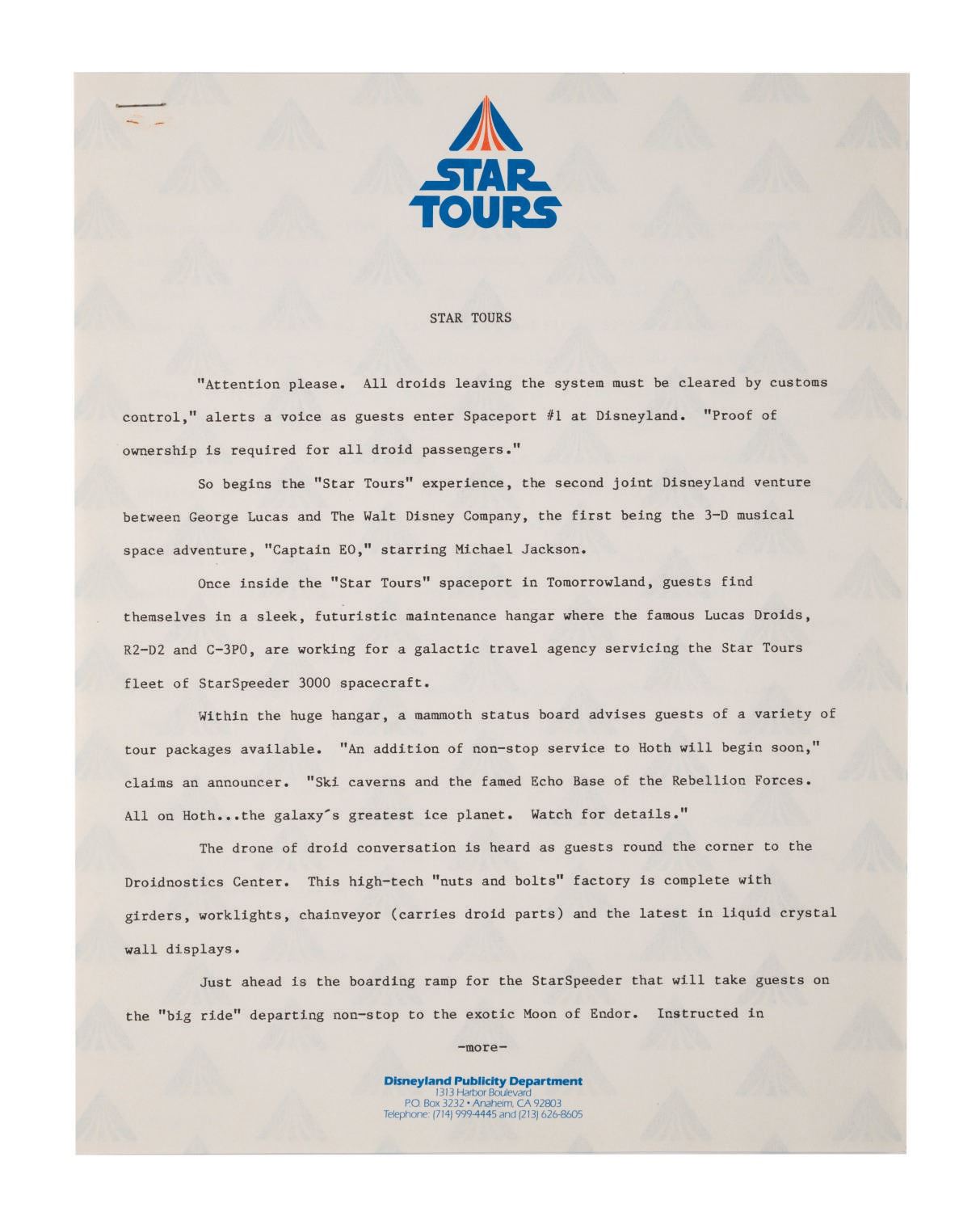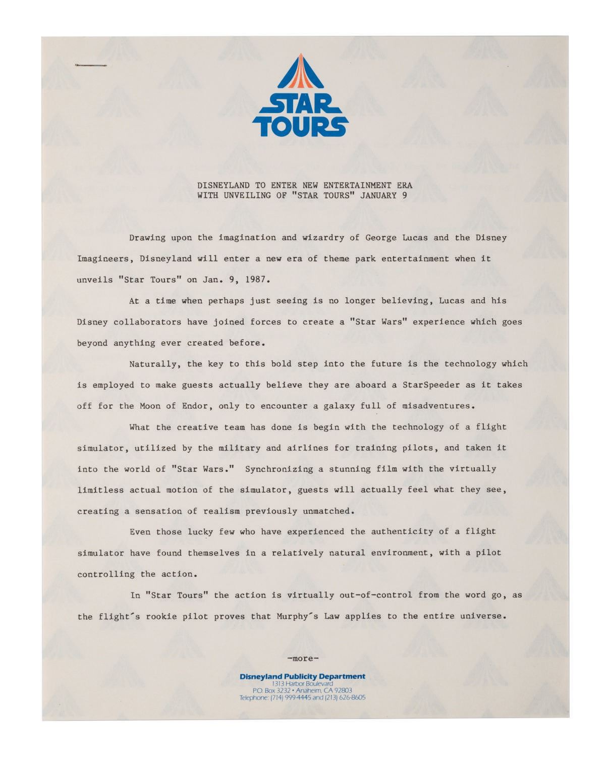 (Disneyland, 1987) A press kit created for the opening of of Star Tours at Disneyland. Among the contents are (4) promotional photos with captions, the story of bringing George Lucas' Star Wars to Disneyland, and descriptions of the preshow and show. Measuring 9.25"x12", the folder and contents are in used, good overall condition.