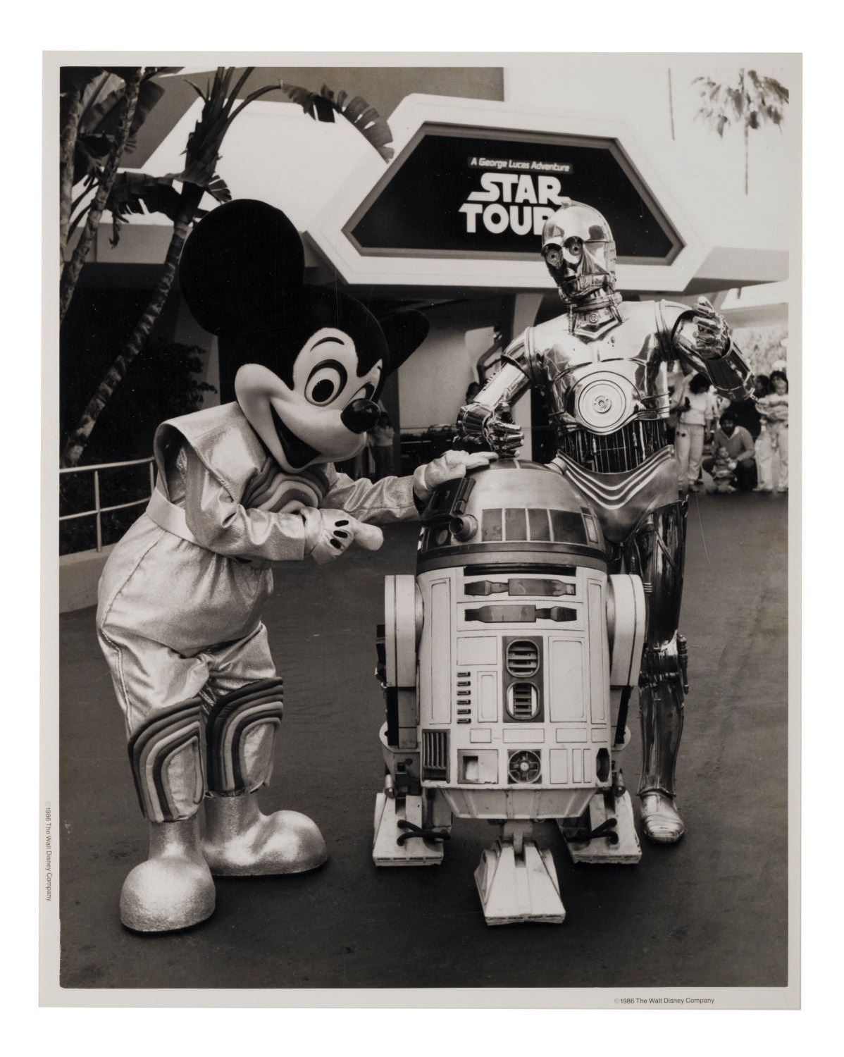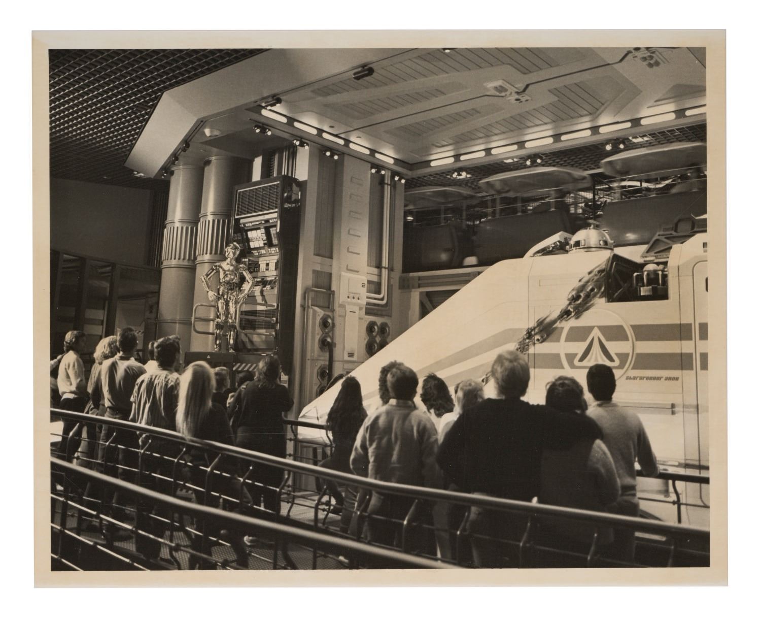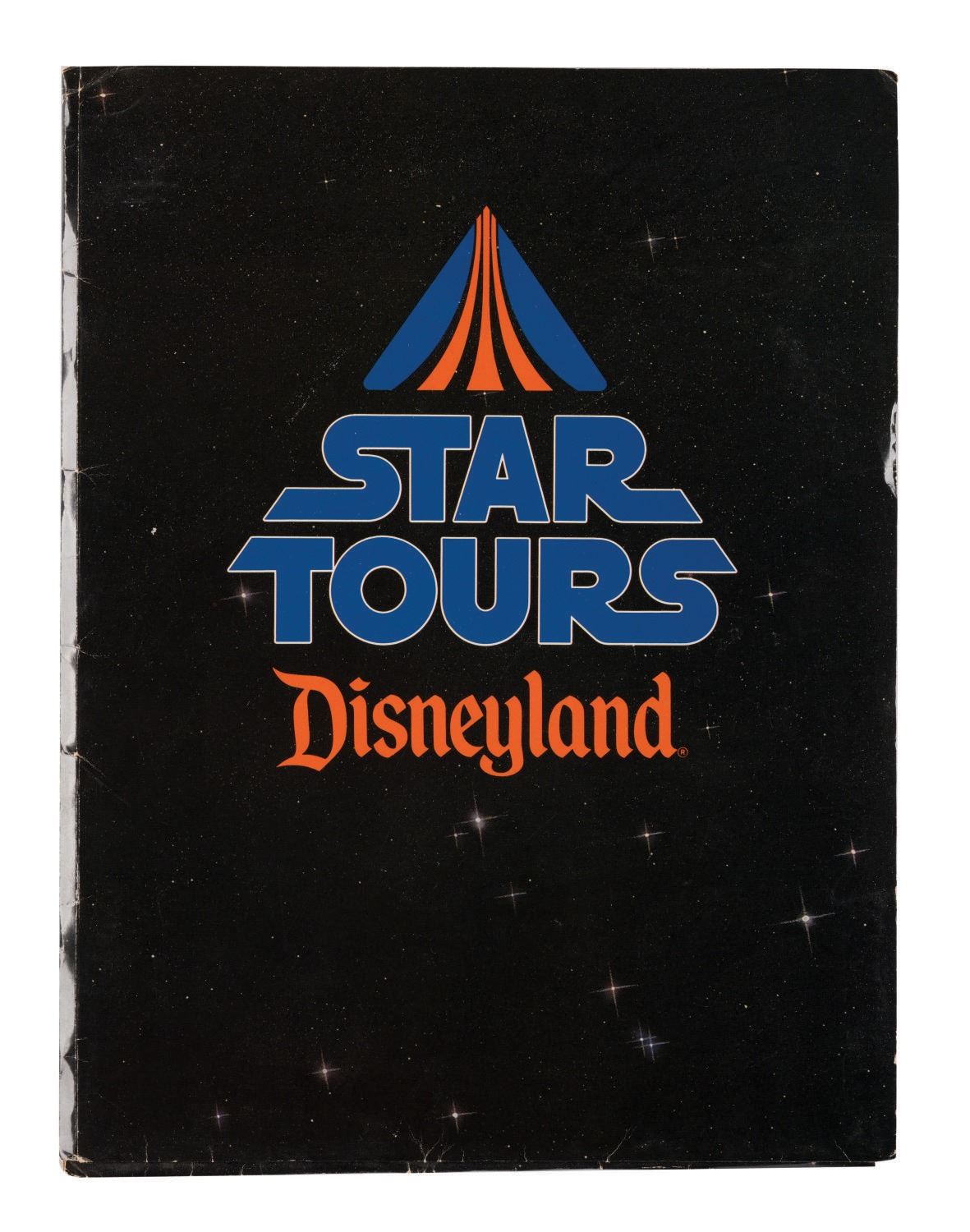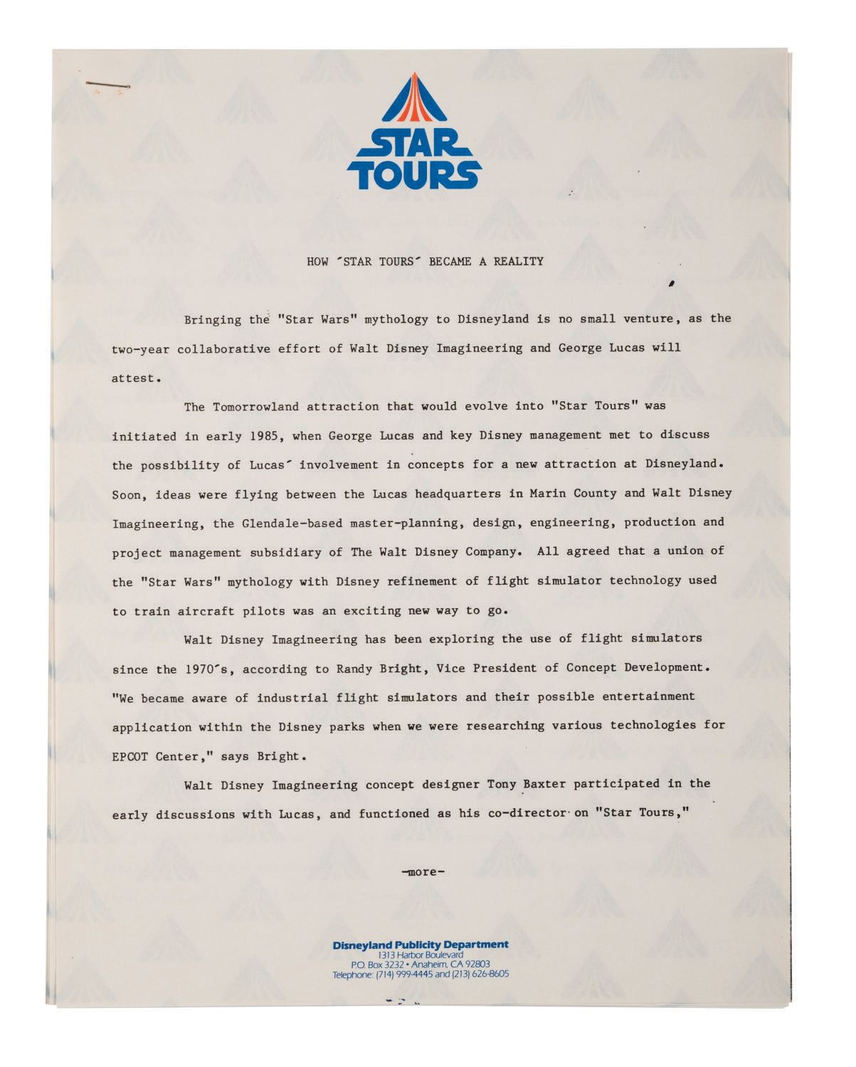 (Disneyland, 1987) A press kit created for the opening of of Star Tours at Disneyland. Among the contents are (4) promotional photos with captions, the story of bringing George Lucas' Star Wars to Disneyland, and descriptions of the preshow and show. Measuring 9.25"x12", the folder and contents are in used, good overall condition.