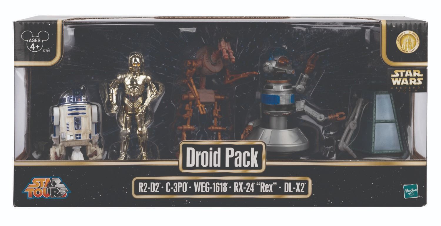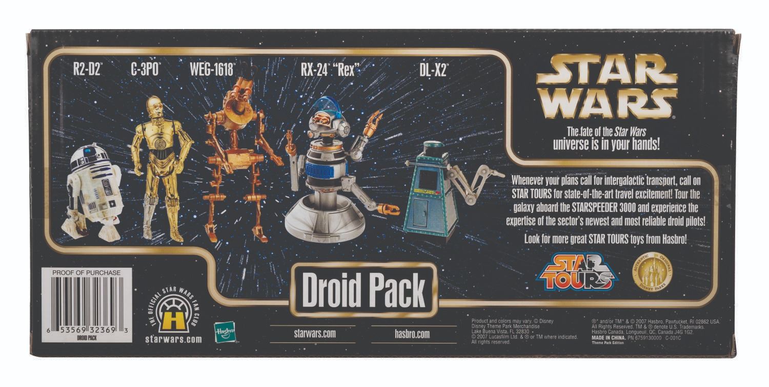 (Disney Parks/Hasbro, 2007) A Star Tours Droid Pack Figure Set. This set of five action figures includes R2-D2, C-3PO, WEG-1618, RX-24, and DL-X2 as featured in the popular Disney Parks attraction. This set of 3.75"-scale figures was exclusively released through nearby merchandise locations at Disney Parks. The figures are in fine condition within their original 13"x6"x3" box.