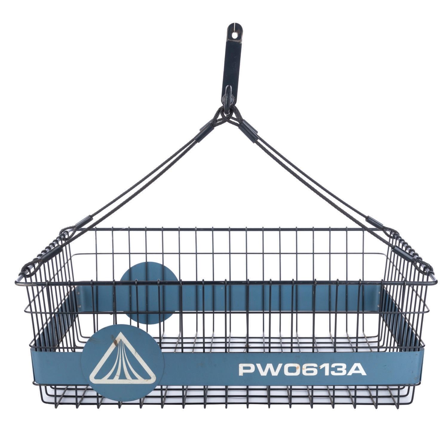 (Disneyland, 1980s-90s) An original Droid Shop metal basket prop from Star Tours at Disneyland. This basket was one of several that could be seen throughout the Droid Shop maintenance show scene of the attraction's preshow queue. Decorated on both sides with the Star Tours logo, the basket is designated "PW0613A" and "PW0613I" on each side. Measuring 24"x18" and 8" deep, the basket is in very good condition with scuffs, paint chips, and light wear.