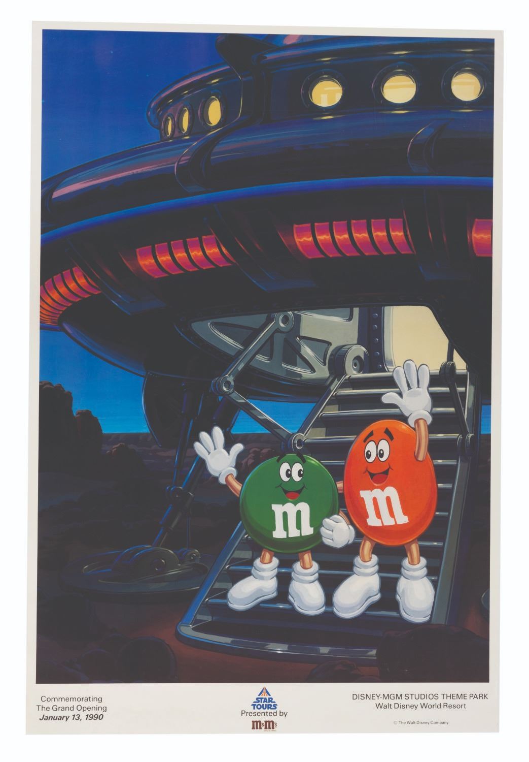 (Disney-MGM Studios, 1990) A Star Tours grand opening poster featuring M&M’s, the official sponsor of the attraction. Measuring 24" x 36", the poster was stored rolled and is in good condition with light edge wear and creasing.