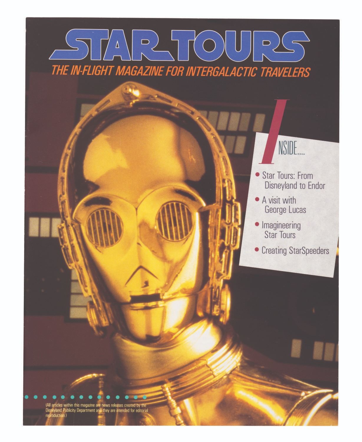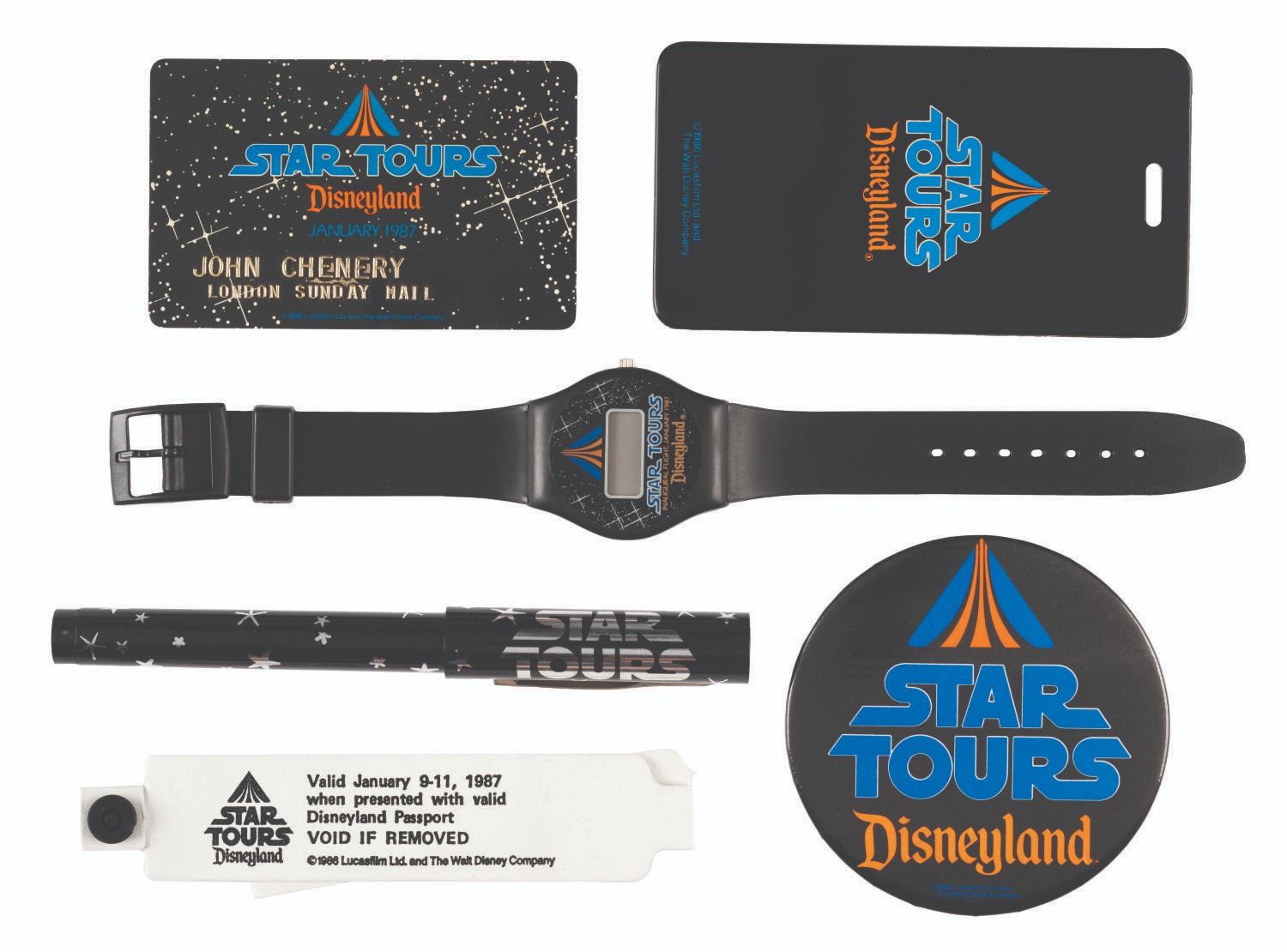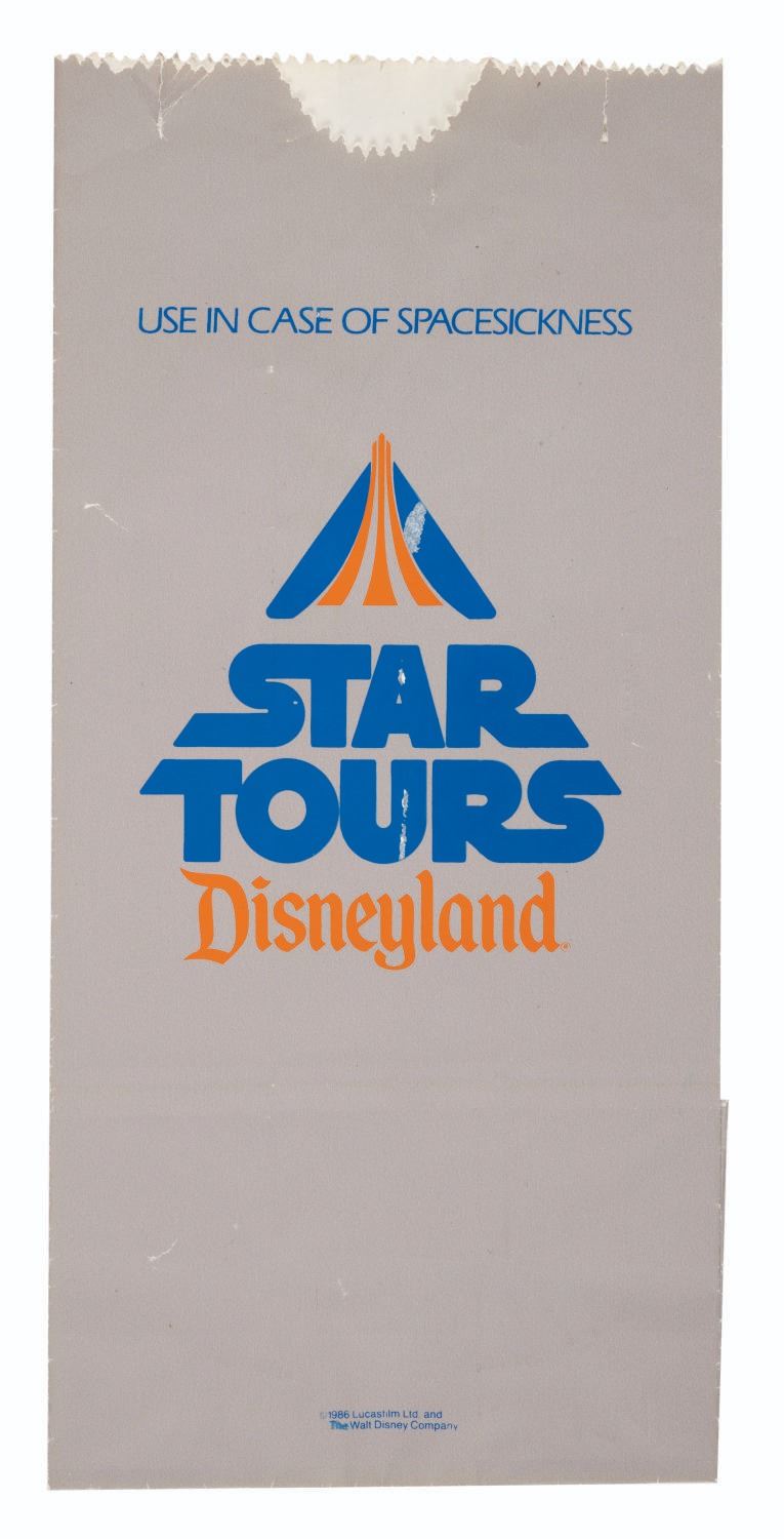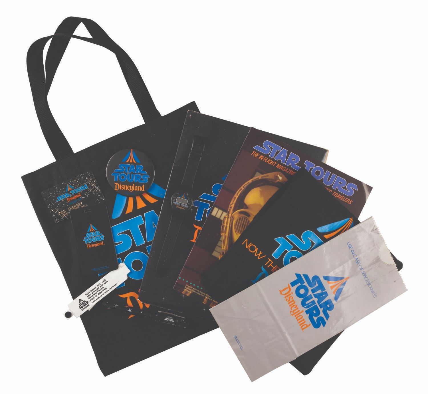 (Disneyland, 1987) A very rare gift package given to members of the press who attended the "Interplanetary Launch" event on January 8, 1987. This 12- piece set includes a Press Kit (containing photos and releases), a large Star Tours "The Adventure is Real" T-Shirt, "In Case of Sickness" paper bag, "In Flight Magazine," wrist band, button, digital watch, luggage tag, Star Tours pen, and personalized Press Card dated January 1987. The pieces measure various sizes within a 12"x13.5" tote bag. This incredible set of press materials from the Inaugural Flight event is the most complete we have seen and is in very good condition with light wear from use.