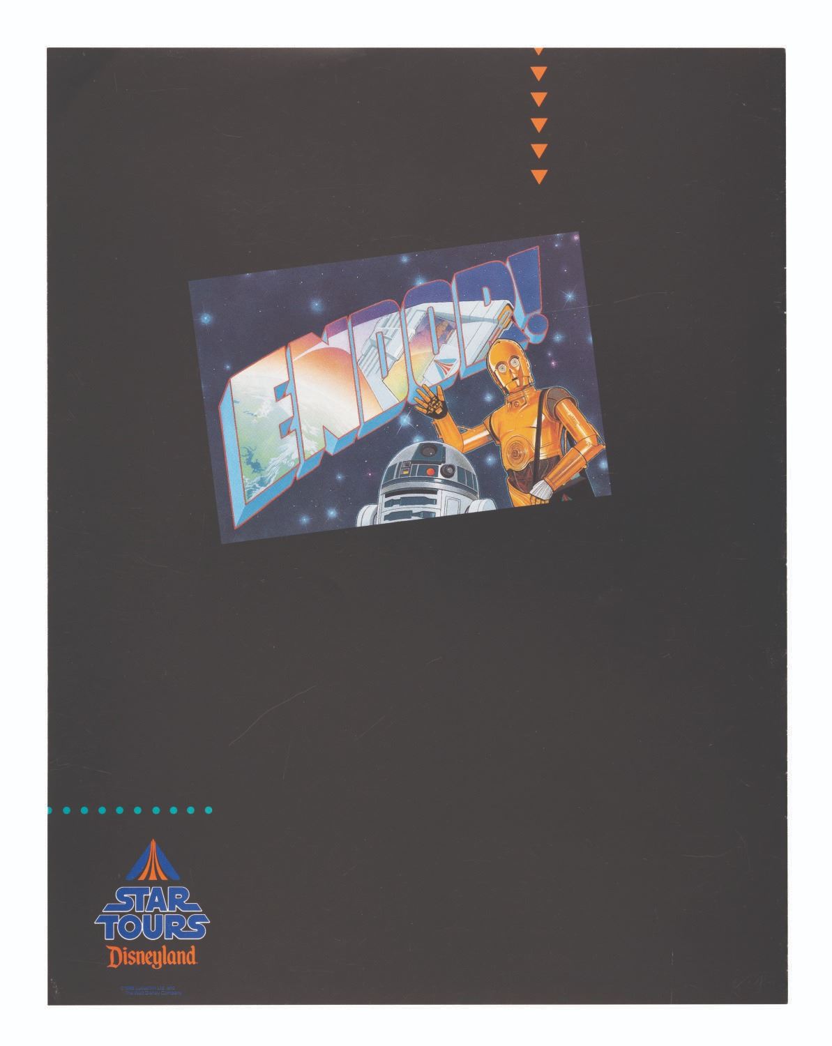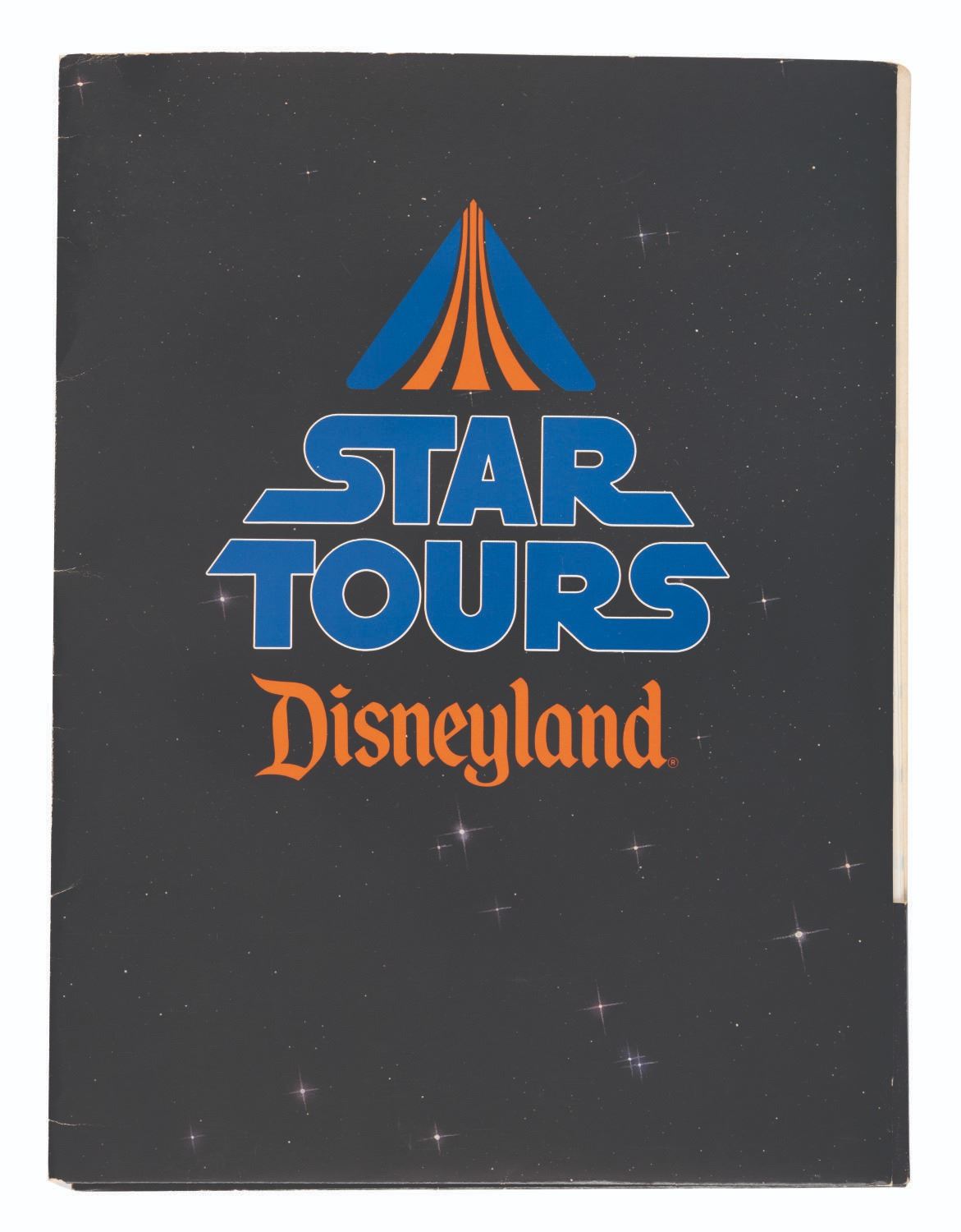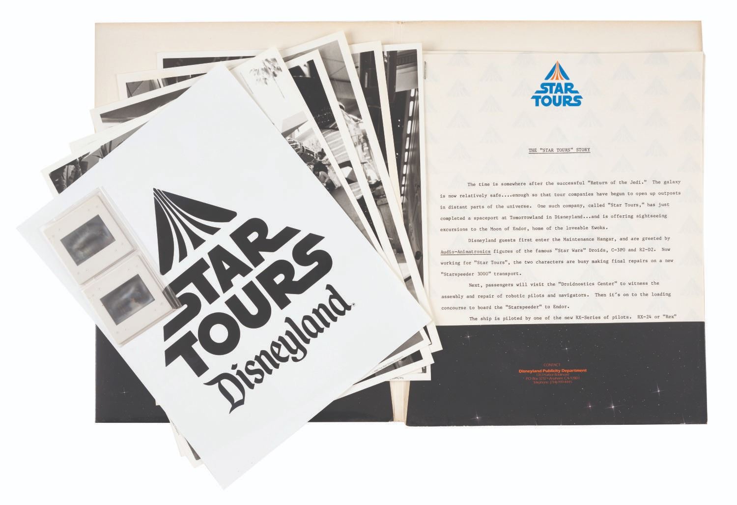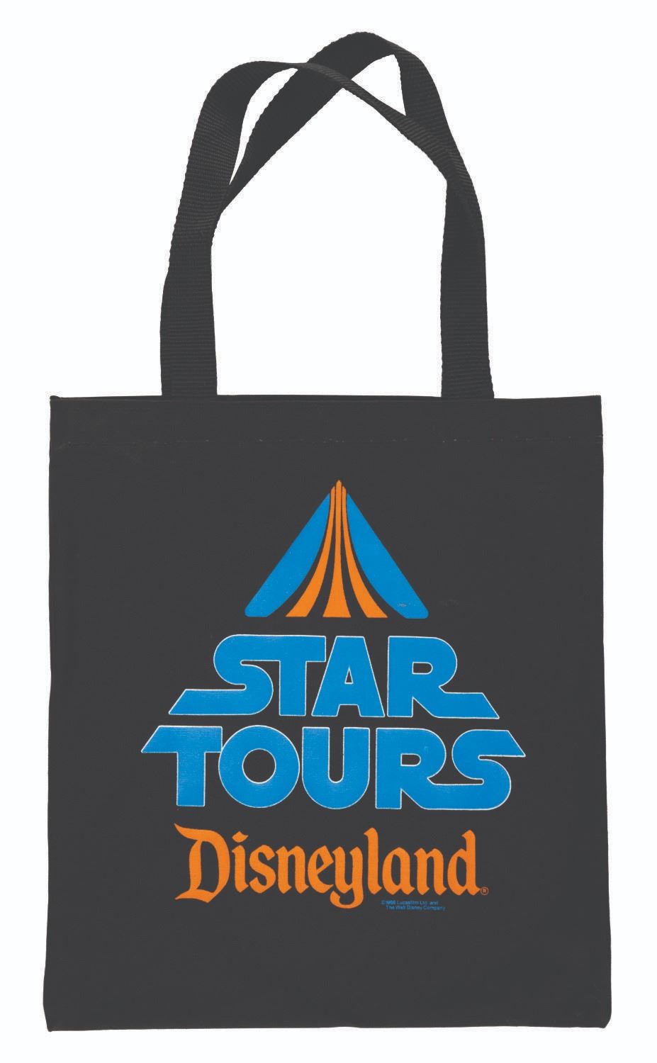 (Disneyland, 1987) A very rare gift package given to members of the press who attended the "Interplanetary Launch" event on January 8, 1987. This 12- piece set includes a Press Kit (containing photos and releases), a large Star Tours "The Adventure is Real" T-Shirt, "In Case of Sickness" paper bag, "In Flight Magazine," wrist band, button, digital watch, luggage tag, Star Tours pen, and personalized Press Card dated January 1987. The pieces measure various sizes within a 12"x13.5" tote bag. This incredible set of press materials from the Inaugural Flight event is the most complete we have seen and is in very good condition with light wear from use.