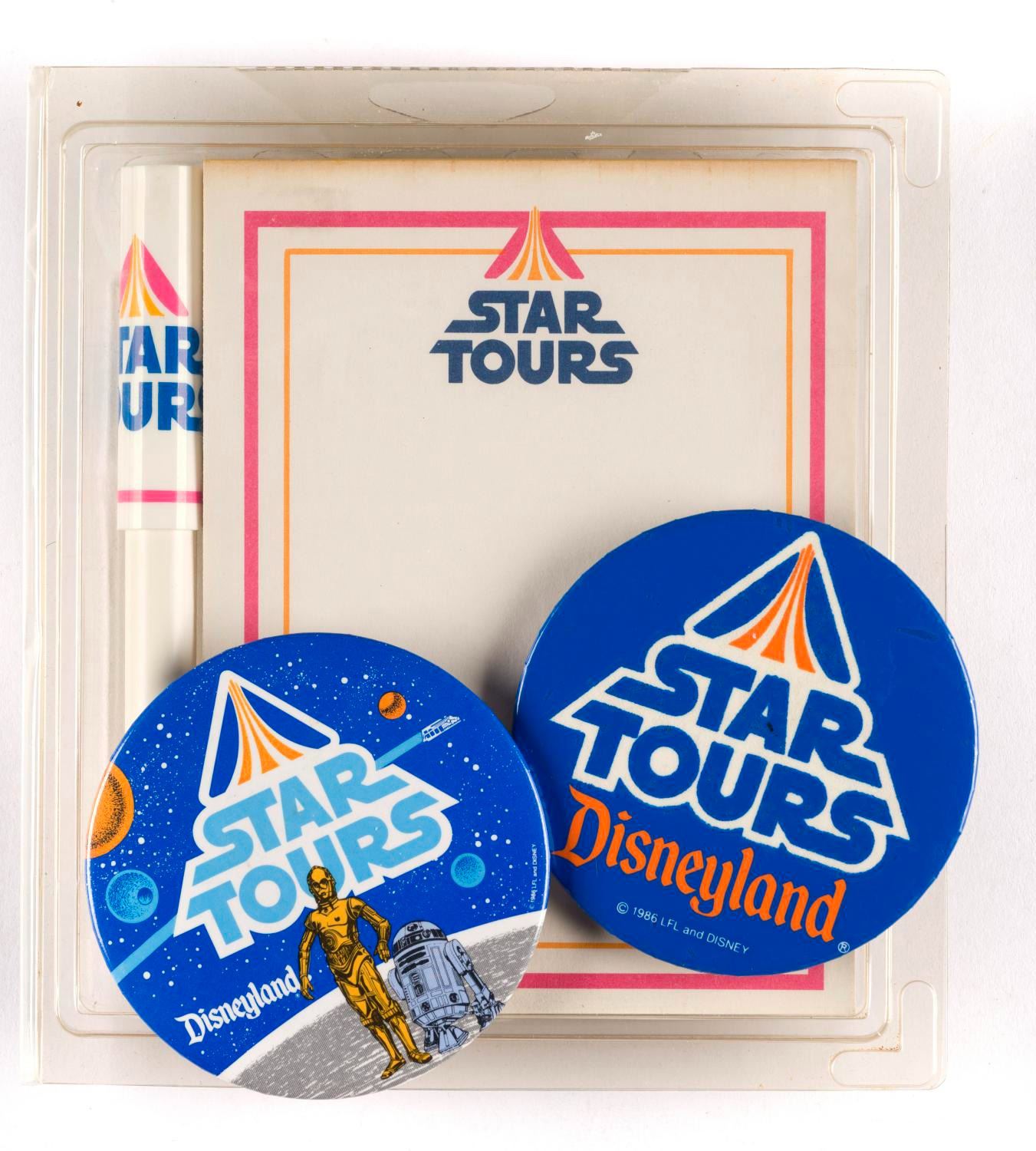 (Disneyland 1987) A Star Tours notepad and pen with two buttons. All are in fine unused condition.