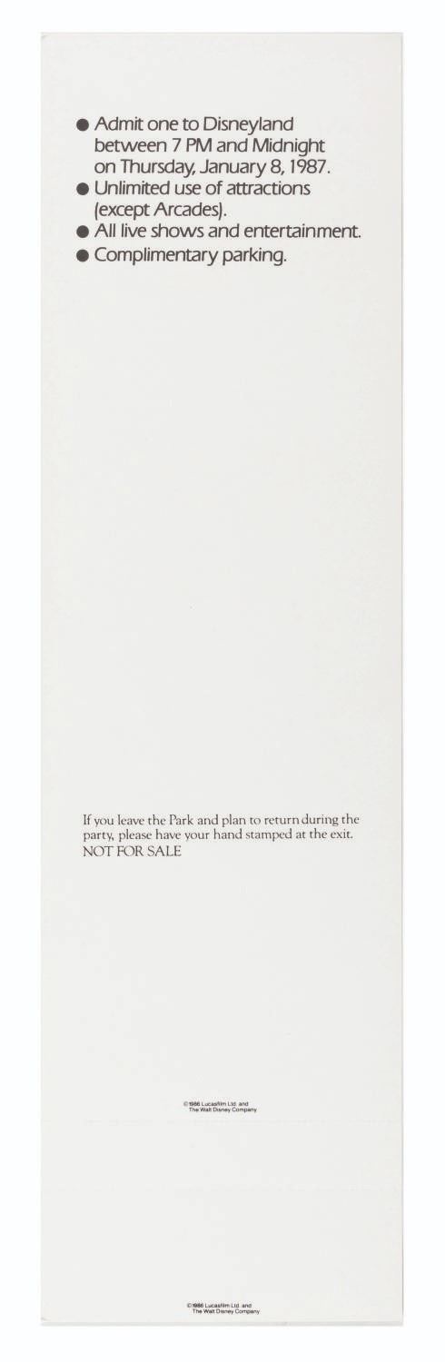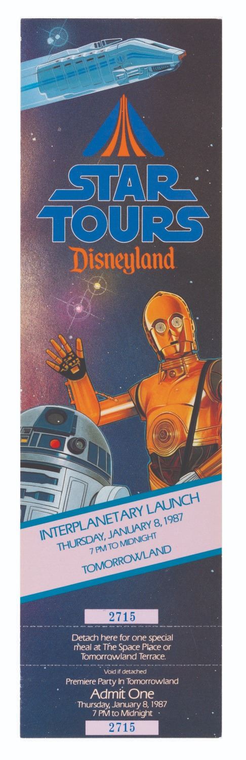 (Disneyland, 1987) A complete admission ticket to the Interplanetary Launch of Star Tours on January 8, 1987, with stubs for a meal and premiere party in Tomorrowland. Numbered “2715," the ticket measures 12.5" x 3.5" and is in very good condition with light edge wear.