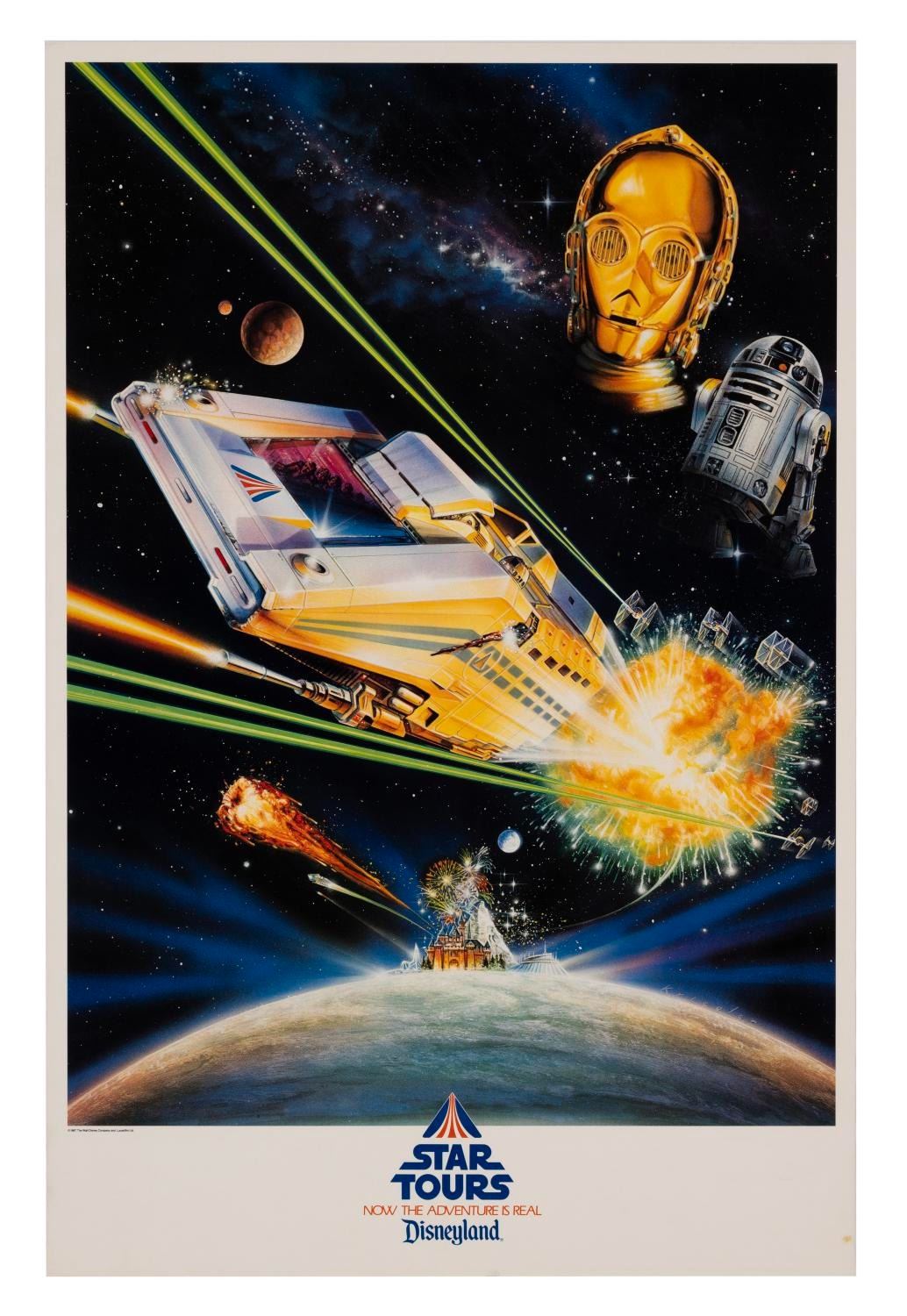 (Disneyland, 1987) A very rare souvenir poster from the opening day of "Star Tours," featuring C-3PO, R2-D2, and a Starspeeder. Measuring 20" x 30", the poster is in very good condition with only a few small spots of soiling on the edge, light handling wear, and scuffing on the reverse.
