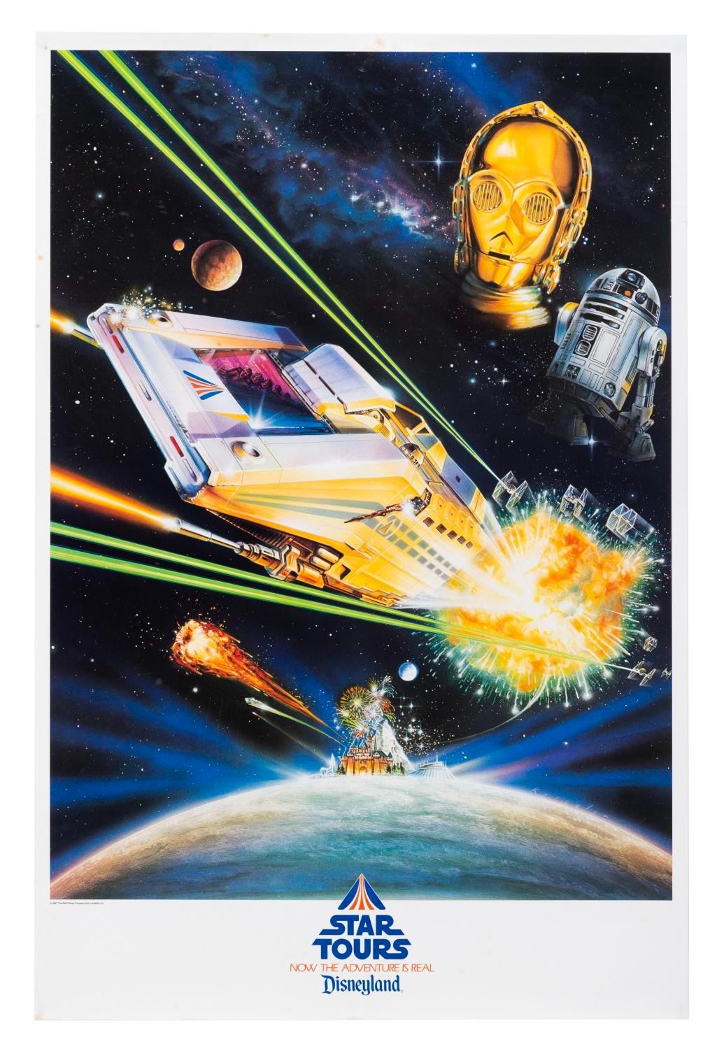 (Disneyland, 1987) A very rare early souvenir poster from Star Tours, featuring C-3PO, R2-D2, and a Starspeeder. Measuring 20" x 30" with an image size of 19" x 26", the poster displays in very good condition with light spotting in the border areas, and a 0.25" tear in the right edge.