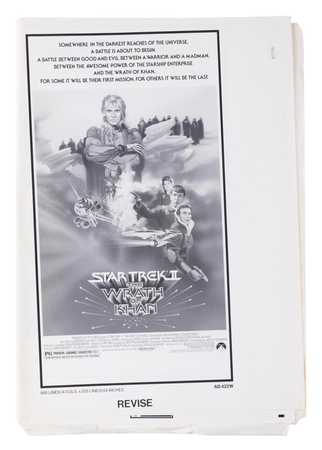 (Paramount, 1982) A pressbook for "Star Trek II: The Wrath of Khan" featuring Ricardo Montalban returning as Khan Noonien Singh. The book includes layouts of all sizes for theaters to publish local ads. With 18 stapled pages measuring 18" x 25" open, the pressbook is in good condition with an original vertical fold through the center, light wear typical of production use, and creases and folds along the bottom edge of some pages that do not affect the artwork.