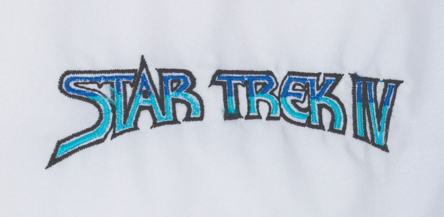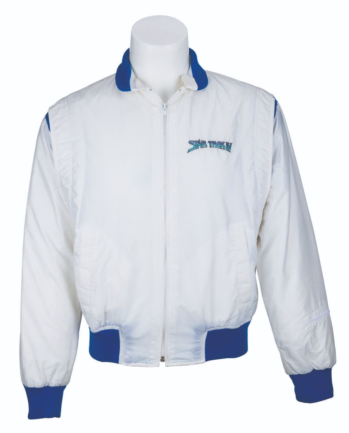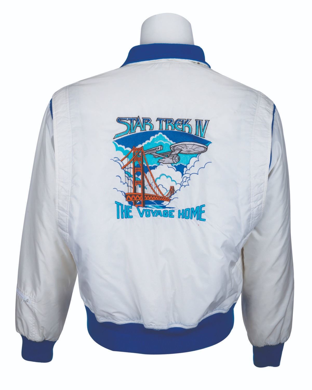 (Paramount, 1986) A rare jacket for the cast and crew of"Star Trek: The Voyage Home." This jacket was not issued to the general public, but was designed and issued exclusively to the production staff and actors who worked on and appeared in the film. This puffer bomber jacket is embroidered with the title Star Trek IV on the front left, and a beautiful 8.5"x8.5" embroidery of the film's title and Enterprise over the Golden Gate Bridge on the back. This size L jacket measures 19" shoulder to shoulder and 27" tall. The jacket is in very good condition, with very slight wear and (2) tiny red spots below the back embroidered piece.