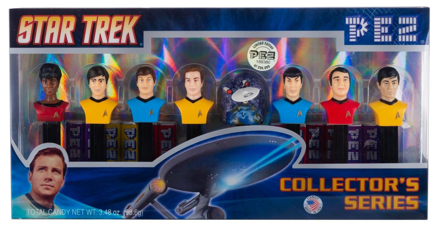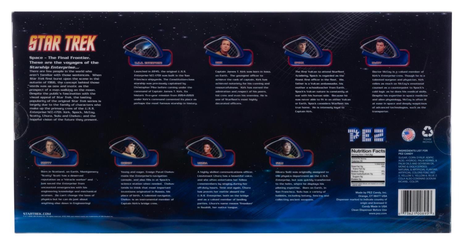 (PEZ Candy Inc., 2008) A Pez "Star Trek" Collector's Series set including dispensers of Kirk, Spock, McCoy, Scotty, Uhura, Sulu, Chekov, and the USS Enterprise. The set includes 12 packs of PEZ candy sold for collecting purposes only. The dispensers are in fine condition, sealed in the very good condition box showing light handling wear.