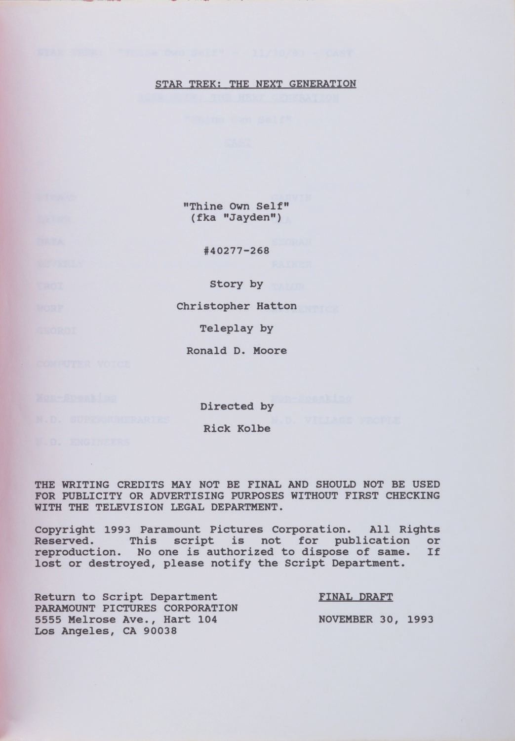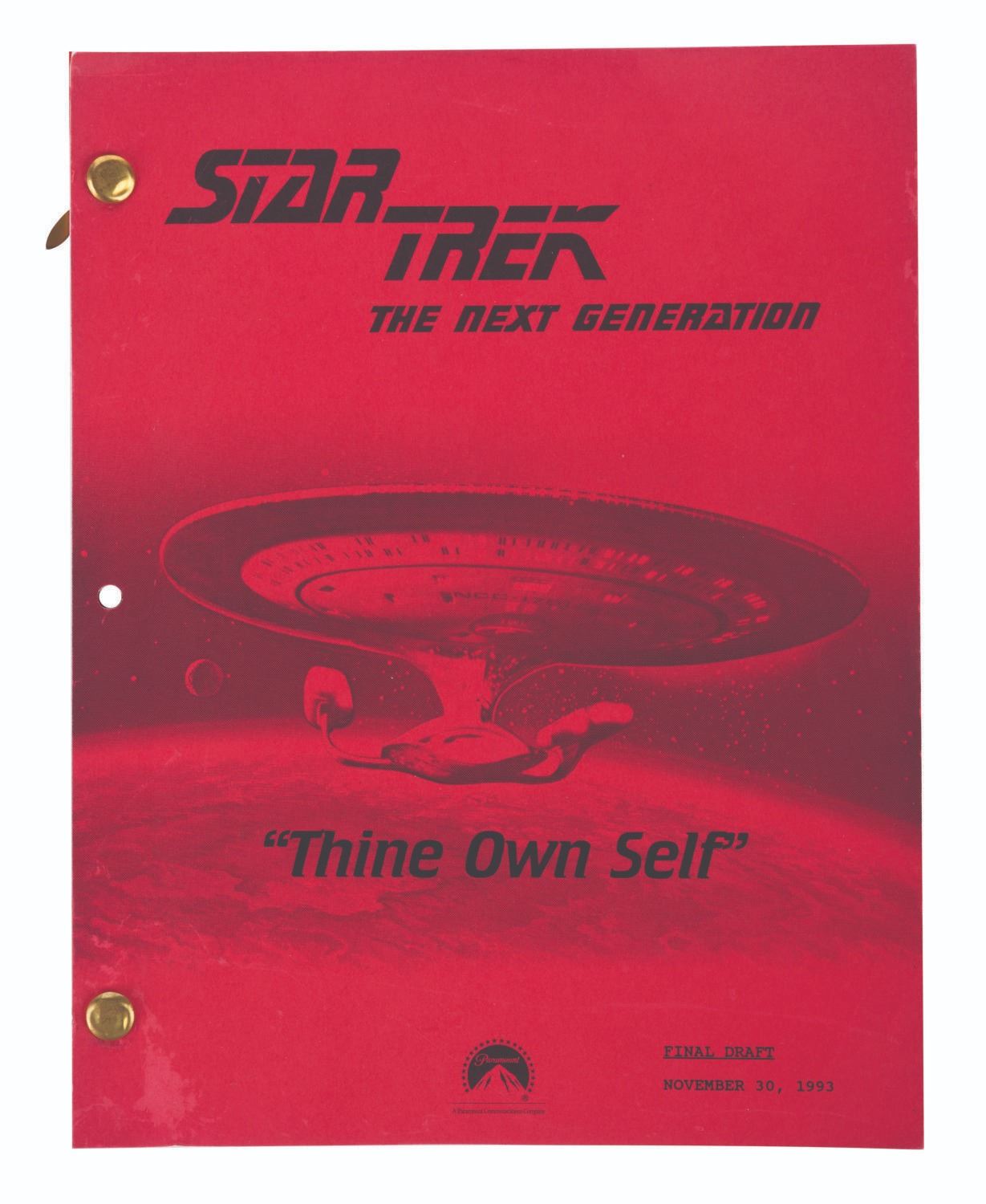 (Paramount, 1993) A final draft script and call sheet for the"Star Trek the Next Generation" seventh season episode"Thine Own Self." This episode finds Data stranded with amnesia on a pre-industrial world. Measuring 8.5"x11", the script is in good condition, with light wear from handling.