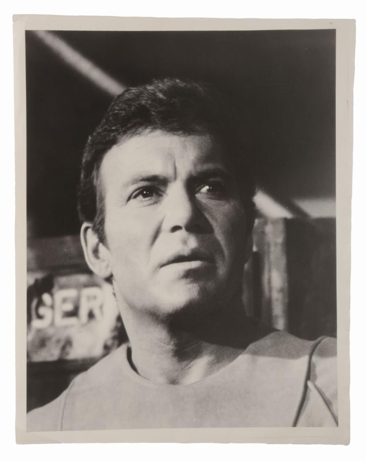 (Paramount, 1979) A large photo of William Shatner as Captain Kirk from "Star Trek: The Motion Picture." This large photo from Bill Wallen's collection was used for promotional artwork for the film. Measuring 20" x 16", the photo is in good overall condition with some creasing around the border and handling wear from production use, and the right edge cut wide at the top.