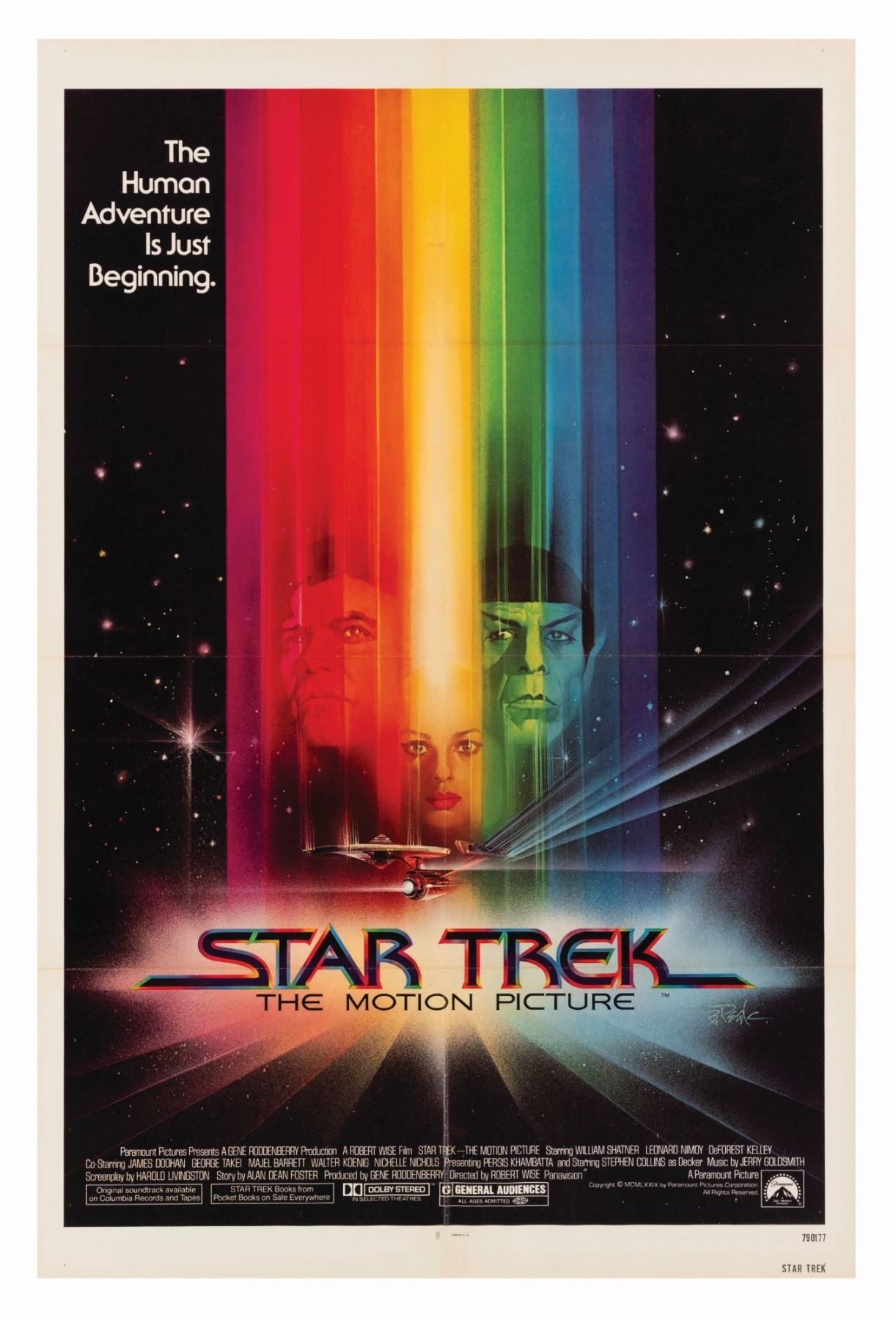 (Paramount, 1979) A one-sheet poster for the theatrical release of "Star Trek: The Motion Picture,” designed by Bob Peak. Measuring 27” x 41”, the poster displays in very good condition with light wear and creases along the original folds, and light separation at the center fold points.