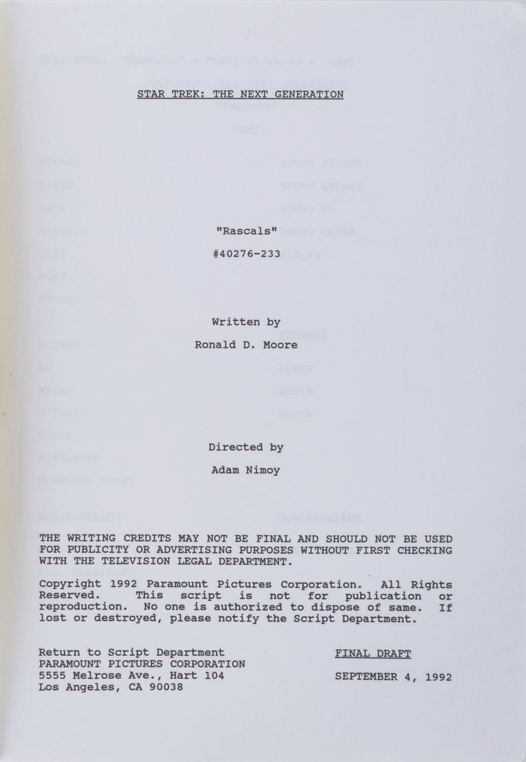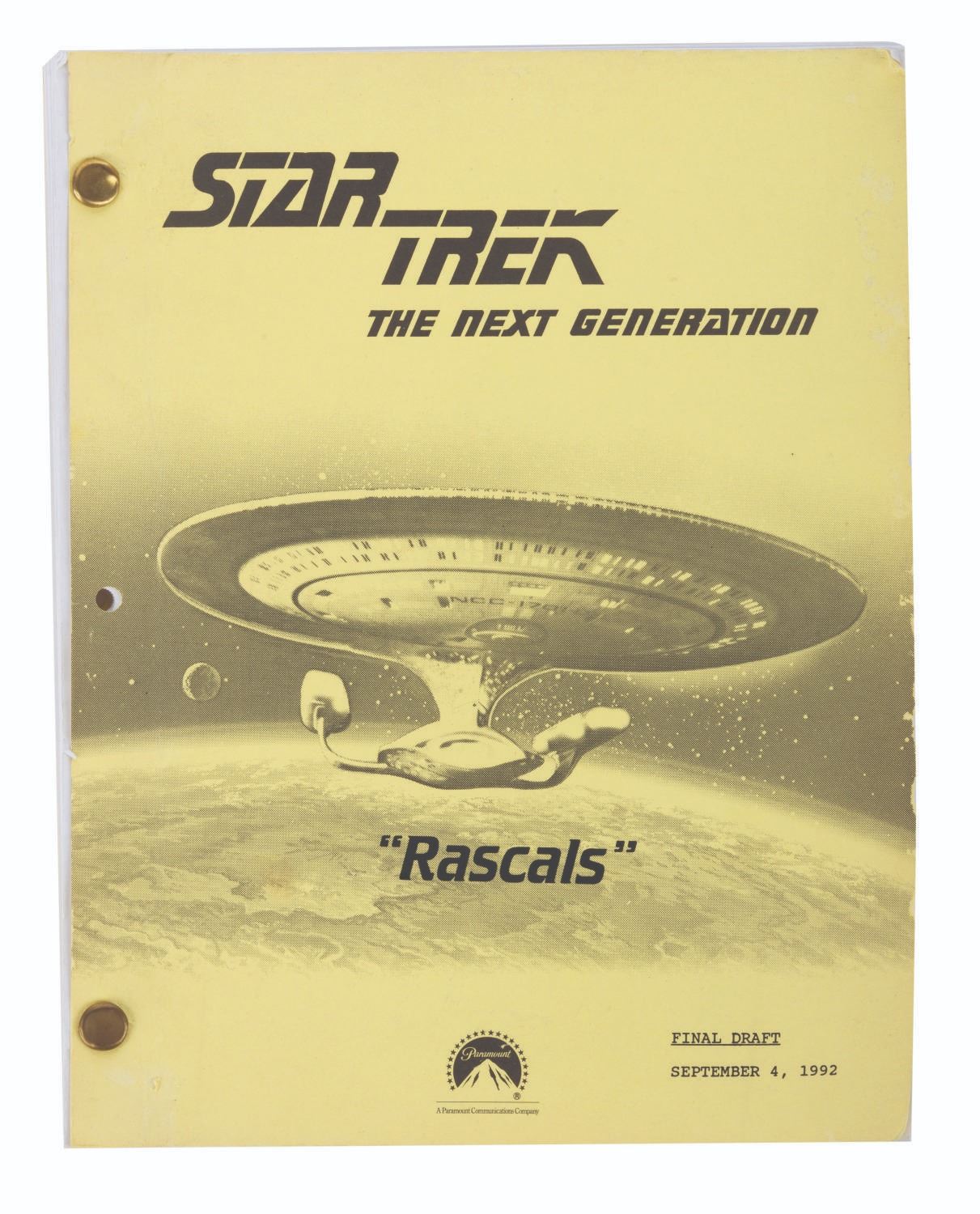 (Paramount, 1992) A final draft script for the"Star Trek the Next Generation" seventh season episode"Rascals." In this infamous episode a transporter accident turns Picard, Guinan, and other crew members into children. Measuring 8.5"x11", the script is in fair condition, with wear to the cover including chipping at edges.