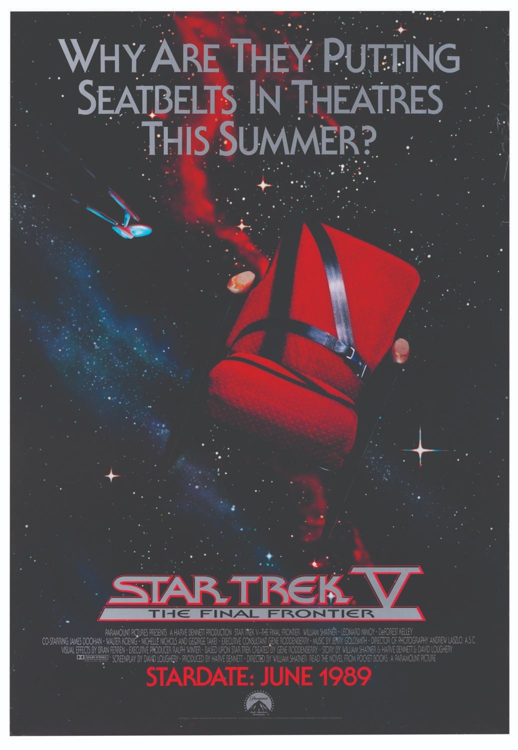 (Paramount, 1989) A rare advance one-sheet for "Star Trek V: The Final Frontier." Measuring 27" x 39.75", the poster is in good condition with light handling wear, and creasing to the top edge of the right side and two .5" tears to the edge.