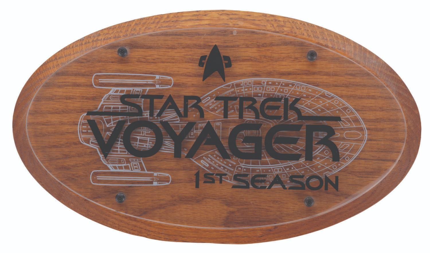 (Paramount, 1995) A very rare"Star Trek Voyager" first season cast and crew gift plaque. Plaques such as this one were made each year of the series exclusively for the cast and crew and were never available to the public. Constructed of wood and acrylic, the plaque measures 6.25"x11"x1" and is in very good condition, with some light scuffs from handling.