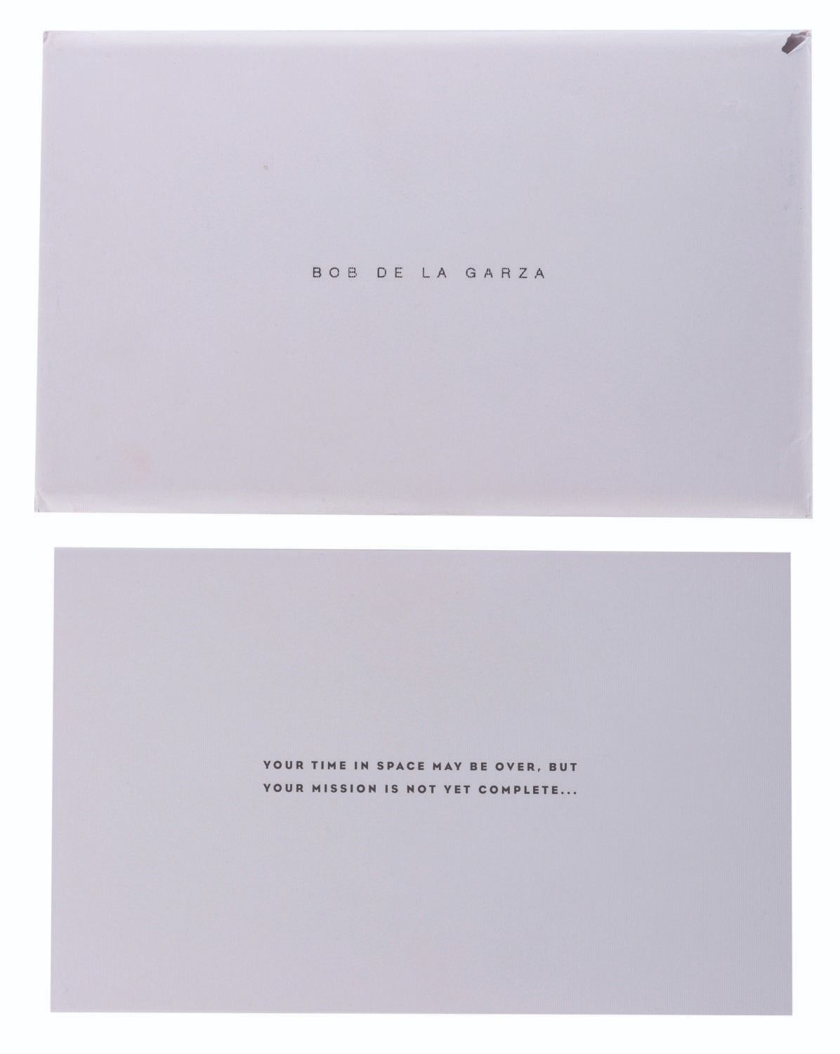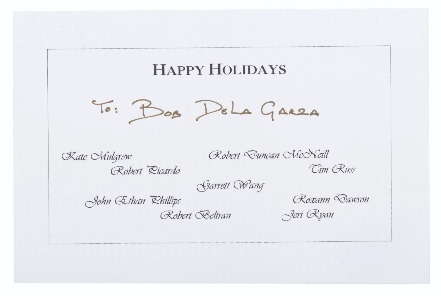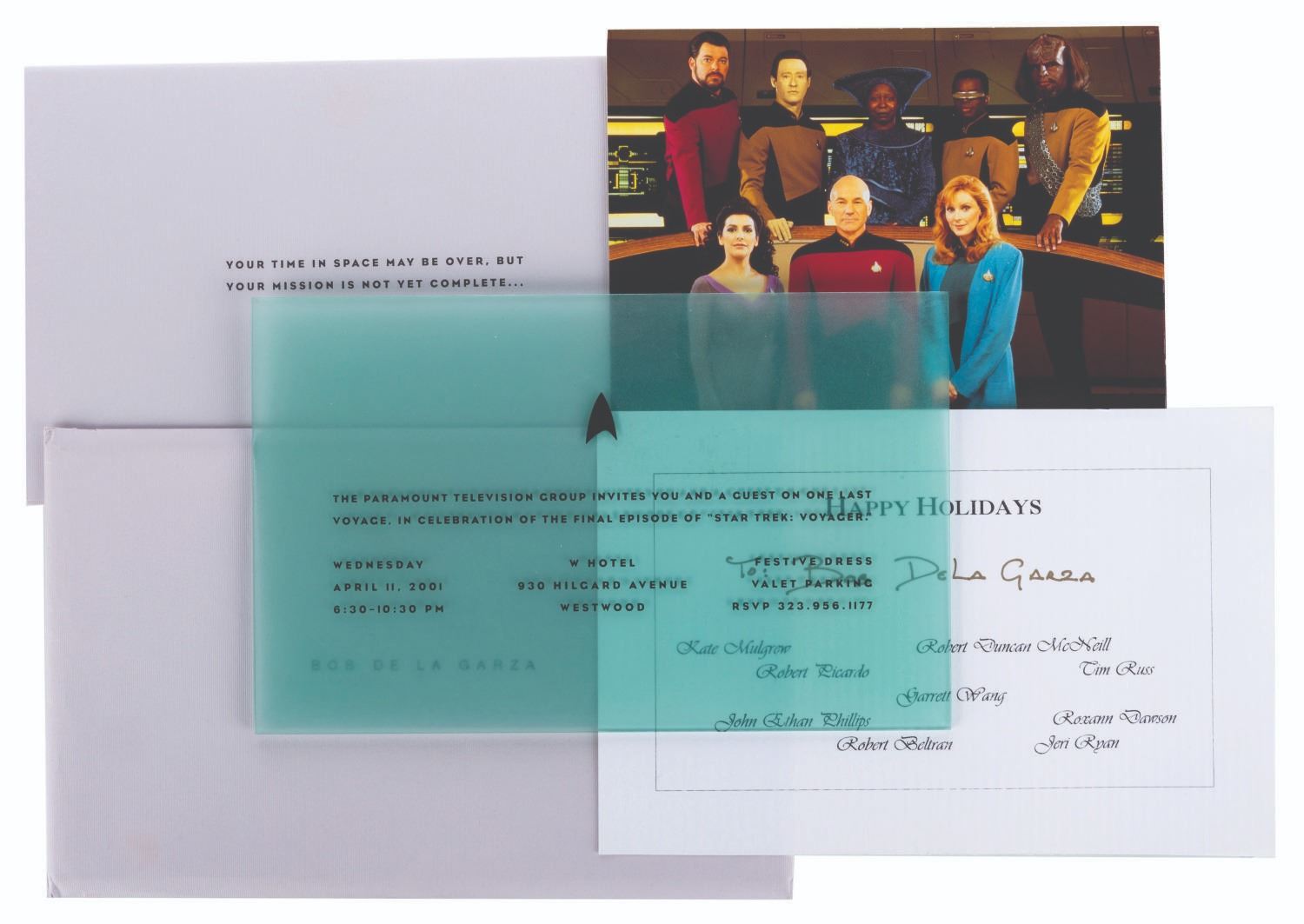 (Paramount, 2001) An original invitation to “Endgame,” the final episode of “Star Trek: Voyager,” addressed to an assistant property manager, Bob De La Gurza. In the episode “Projections” Gurza’s name can be seen on a crew manifest list. Also included is a holiday card addressed to Gurza from the show's cast. The card and invitation measure 8.75" x 5.5", and are in fine condition, the card having very light wear towards the top left with small staple holes. The original envelope is in good condition with light edge wear from age.