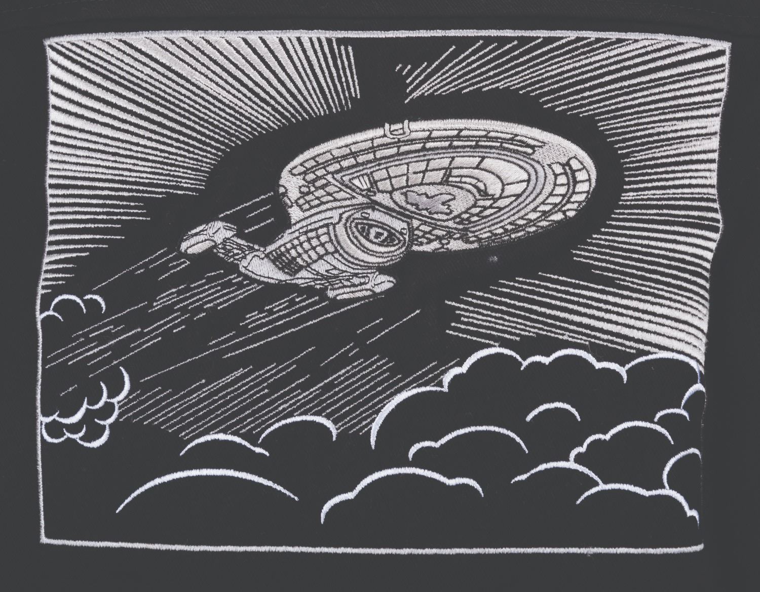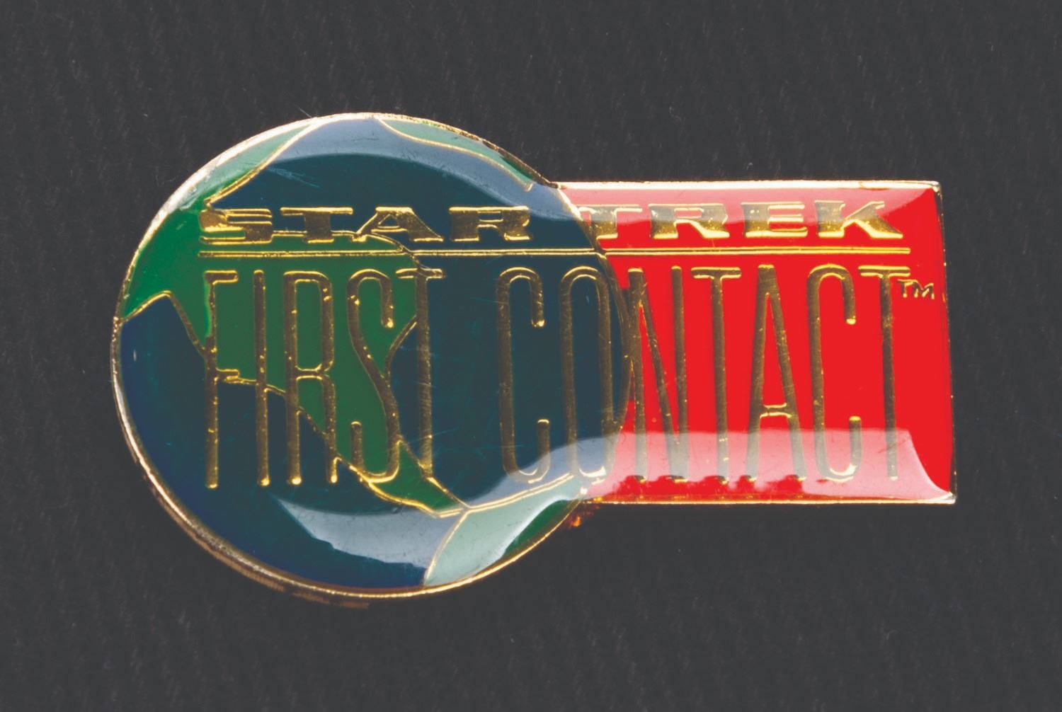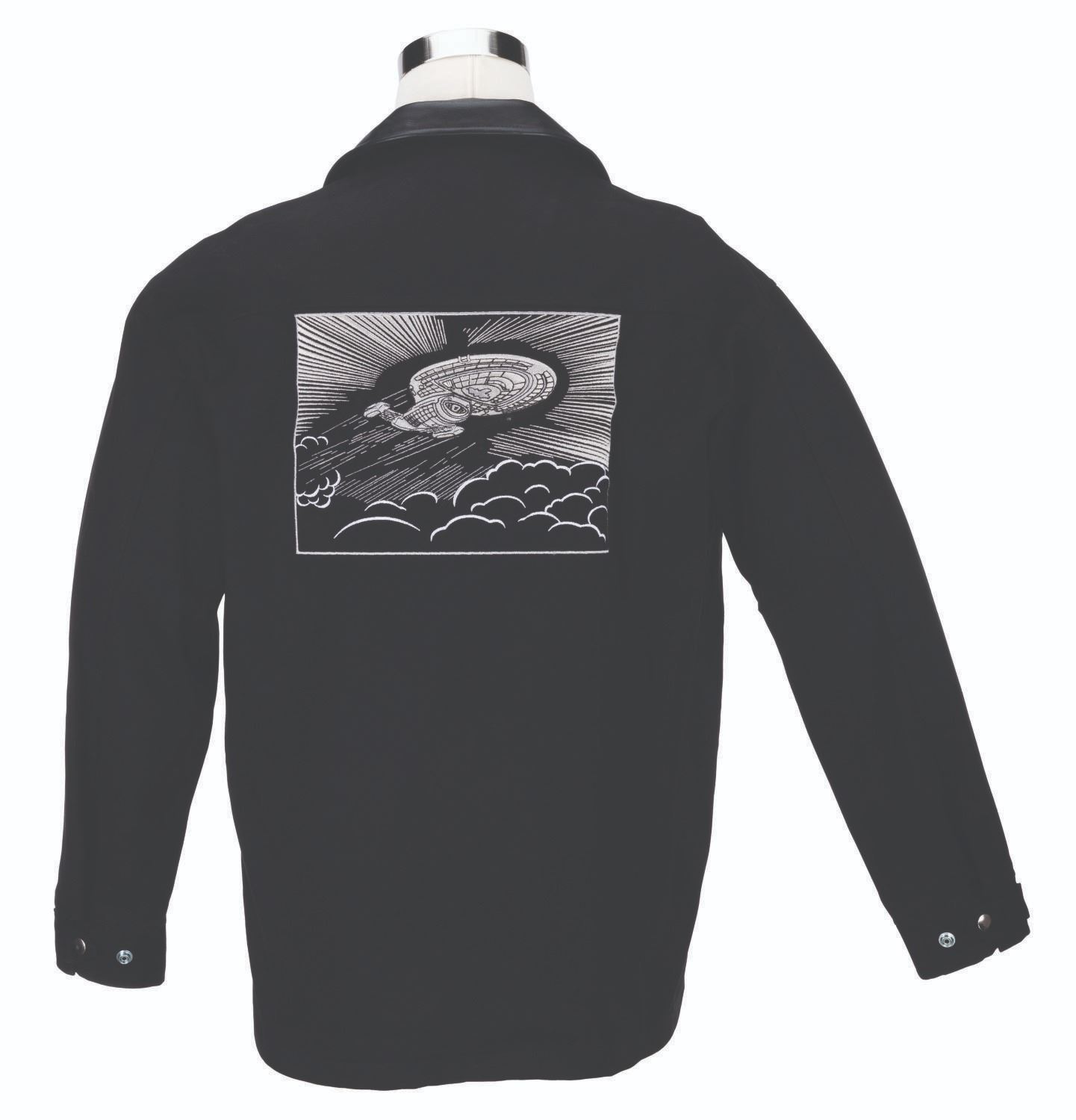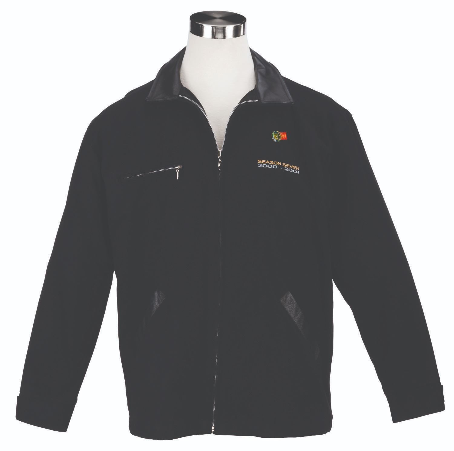 (Paramount, 2000-01) A cast and crew jacket for the seventh and final season of "Star Trek: Voyager." The jacket features an embroidered USS Voyager on the back, a "Star Trek: First Contact" pin, and a leather collar and pockets. Labeled a size L, the jacket is in very good condition with light wear and stains on the interior, which do not affect the outward appearance.