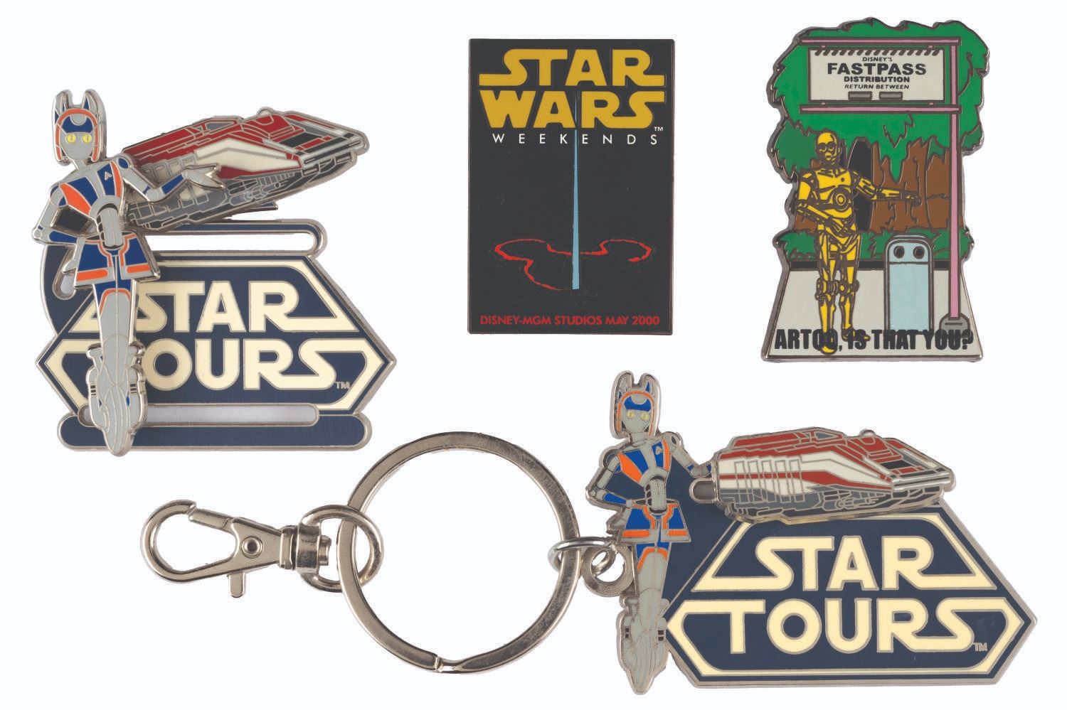 (Disneyland/ Disney-MGM Studios, 2000-2011) A Star Tours - The Adventures Continue keyring and slider pin featuring the Starspeeder Hostess, Aly San-San. Also included are a 2009 Fastpass pin, and a May 2000 Star Wars Weekends pin. Measuring up to 1.5" x 5", the pins and keychain are in very good condition with light handling wear.