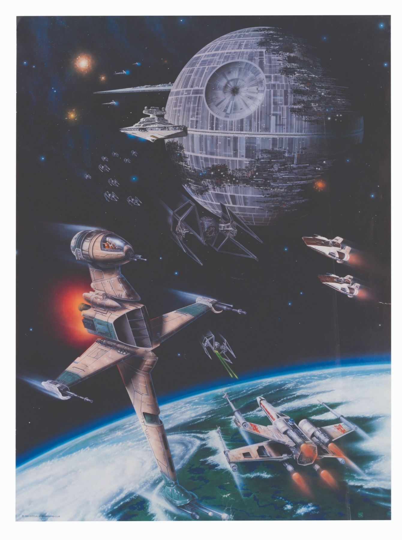 (LucasFilm Ltd., 1983) A poster for the Official Star Wars Fan Club featuring the X-Wing, TIE-Fighter, A-Wing, B-Wing, TIE-Interceptor, and the Death Star. Measuring 20” x 27", the poster is in fair condition with tears along the right edge, heavy creasing, and folds.