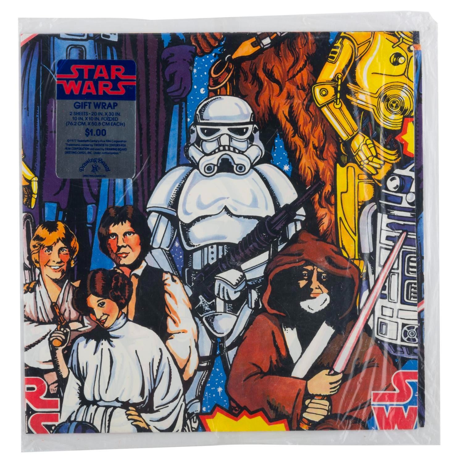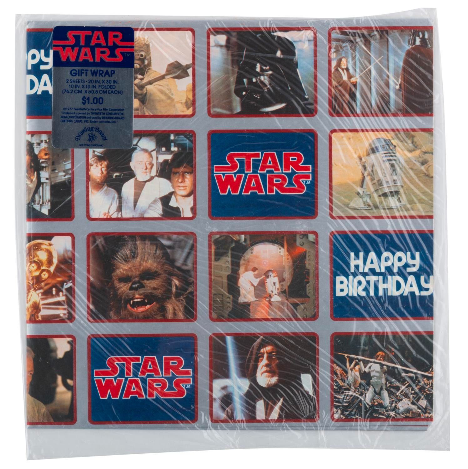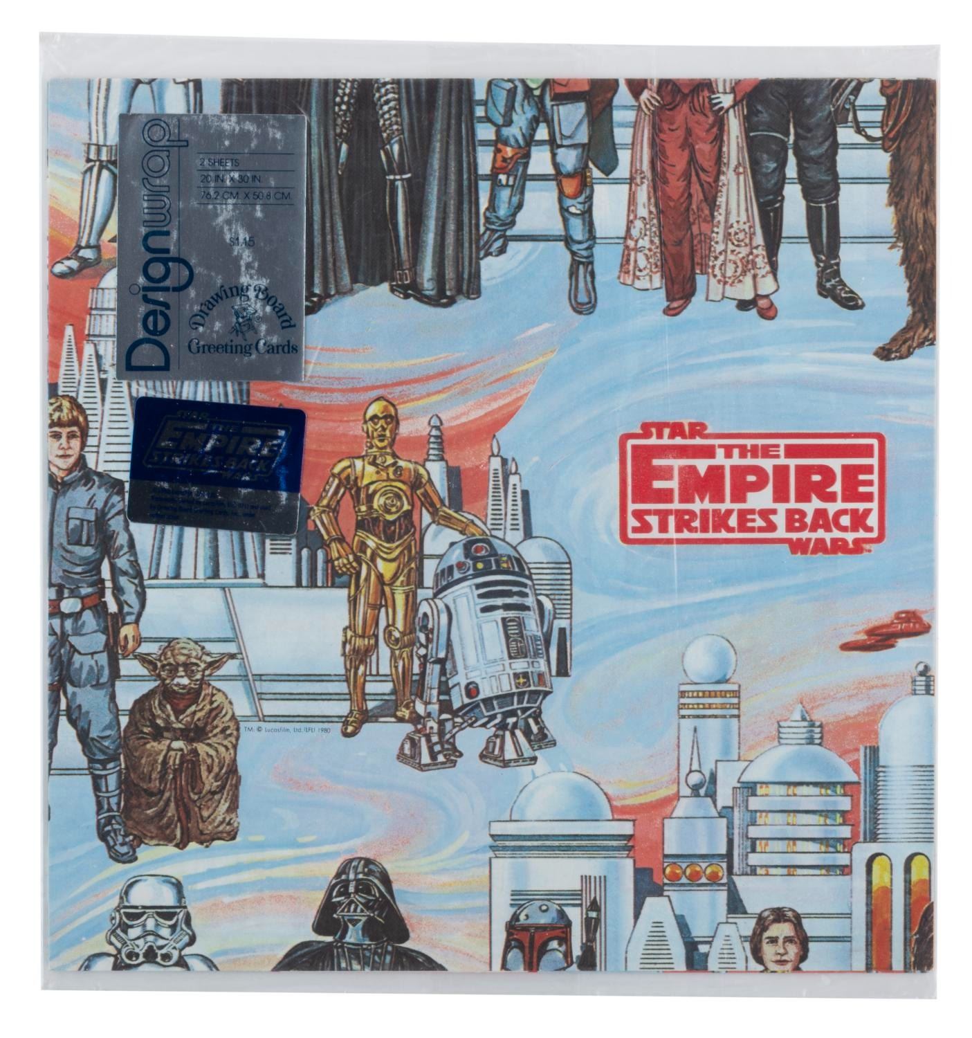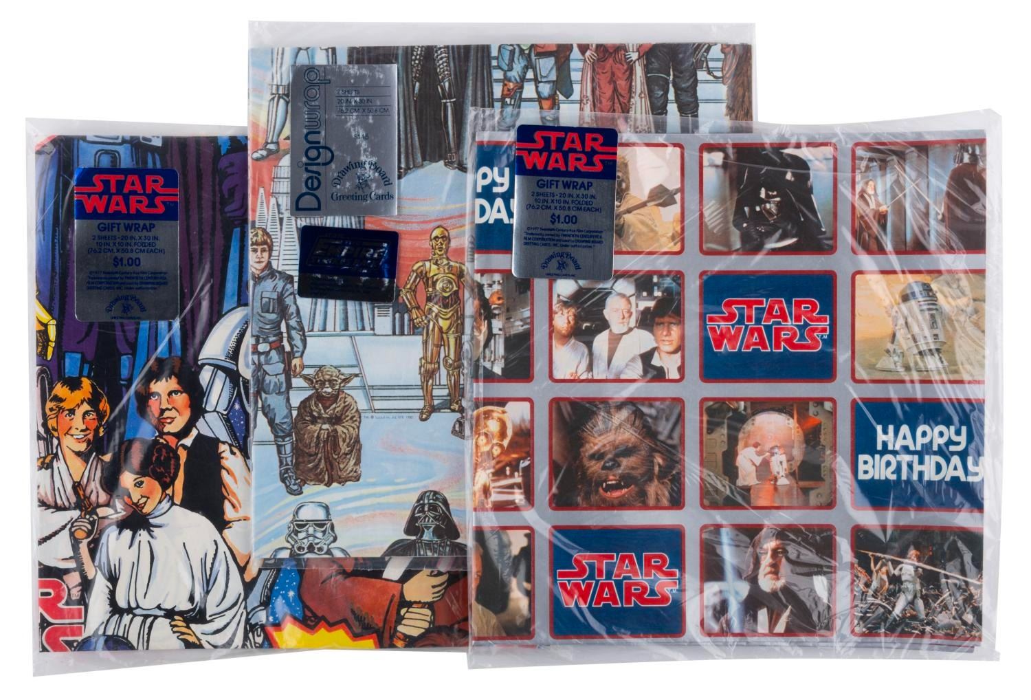 (Drawing Board, 1977-80) A collection of three unopened packages of Star Wars and “The Empire Strikes Back” gift wrap paper. Each package contains two sheets of 20” x 30” paper. Measuring 10” x 10”, the paper is in fine condition with a curve from storage to one “Star Wars” package, and light handling wear to the outer packages.