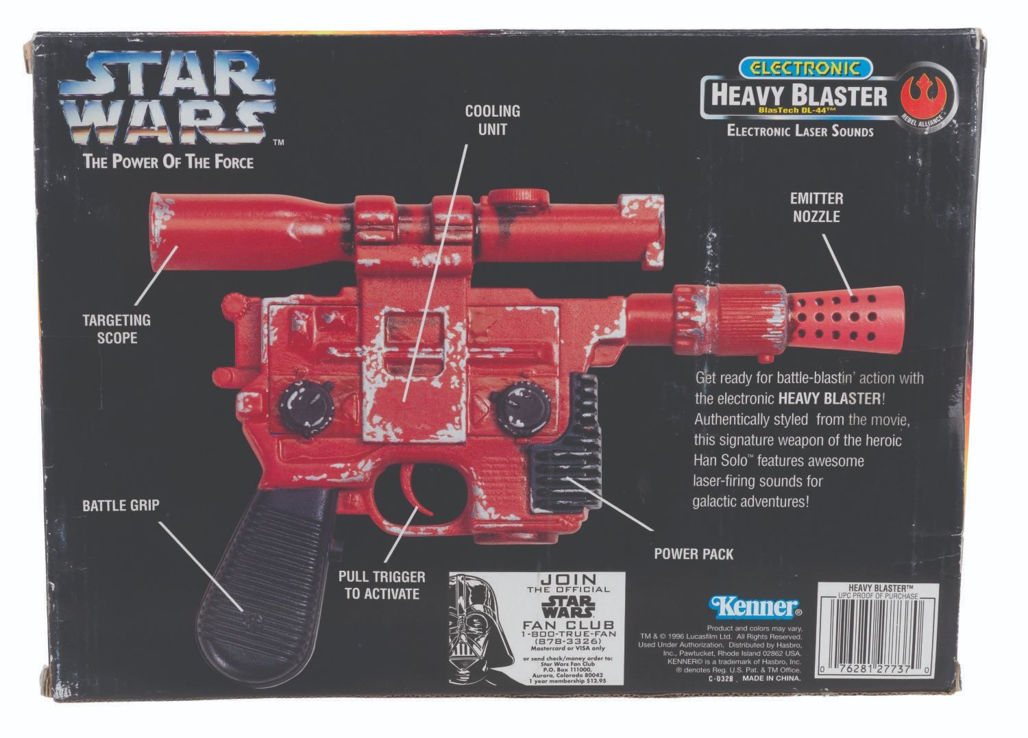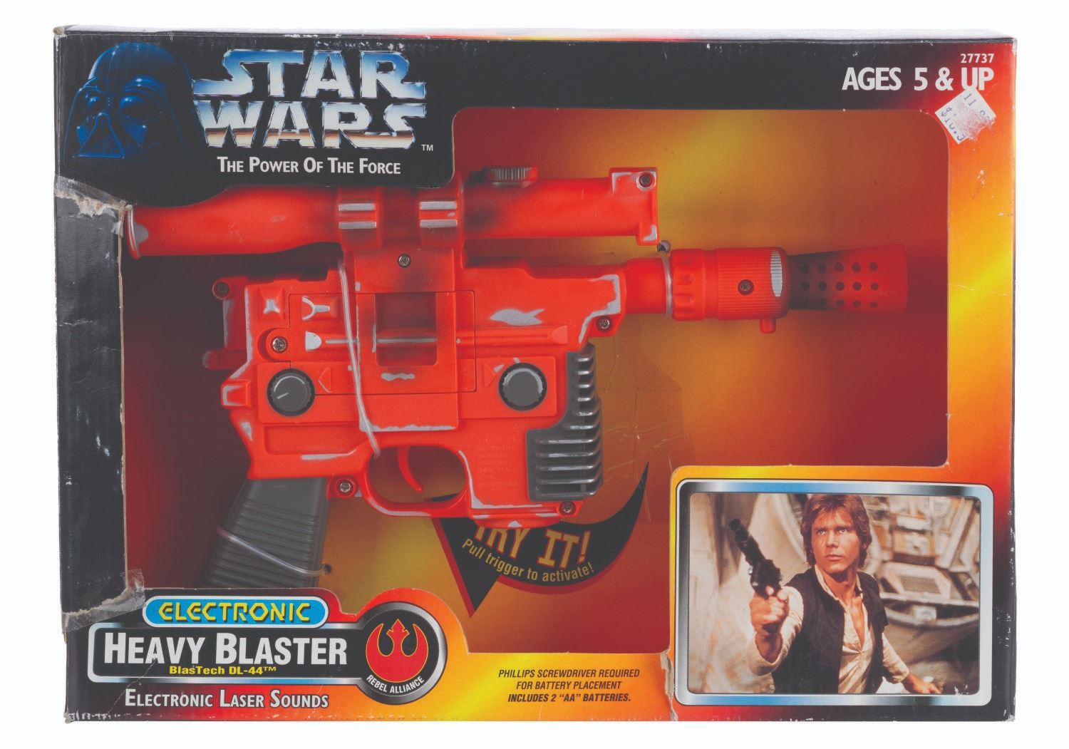 (Kenner, 1996) A Star Wars: The Power of the Force Electronic Heavy Blaster in its original packaging. The red blaster is intentionally distressed to replicate the style of the scrappy Rebel Alliance in the films. The electronic laser sounds did not work when tested, likely requiring 2 new AA batteries (not included). Measuring 6.5” x 10” in its original packaging, the unopened blaster is in very good condition with light scratches and wear, while the packaging exhibits creases, tears, wear, and tape from repair.