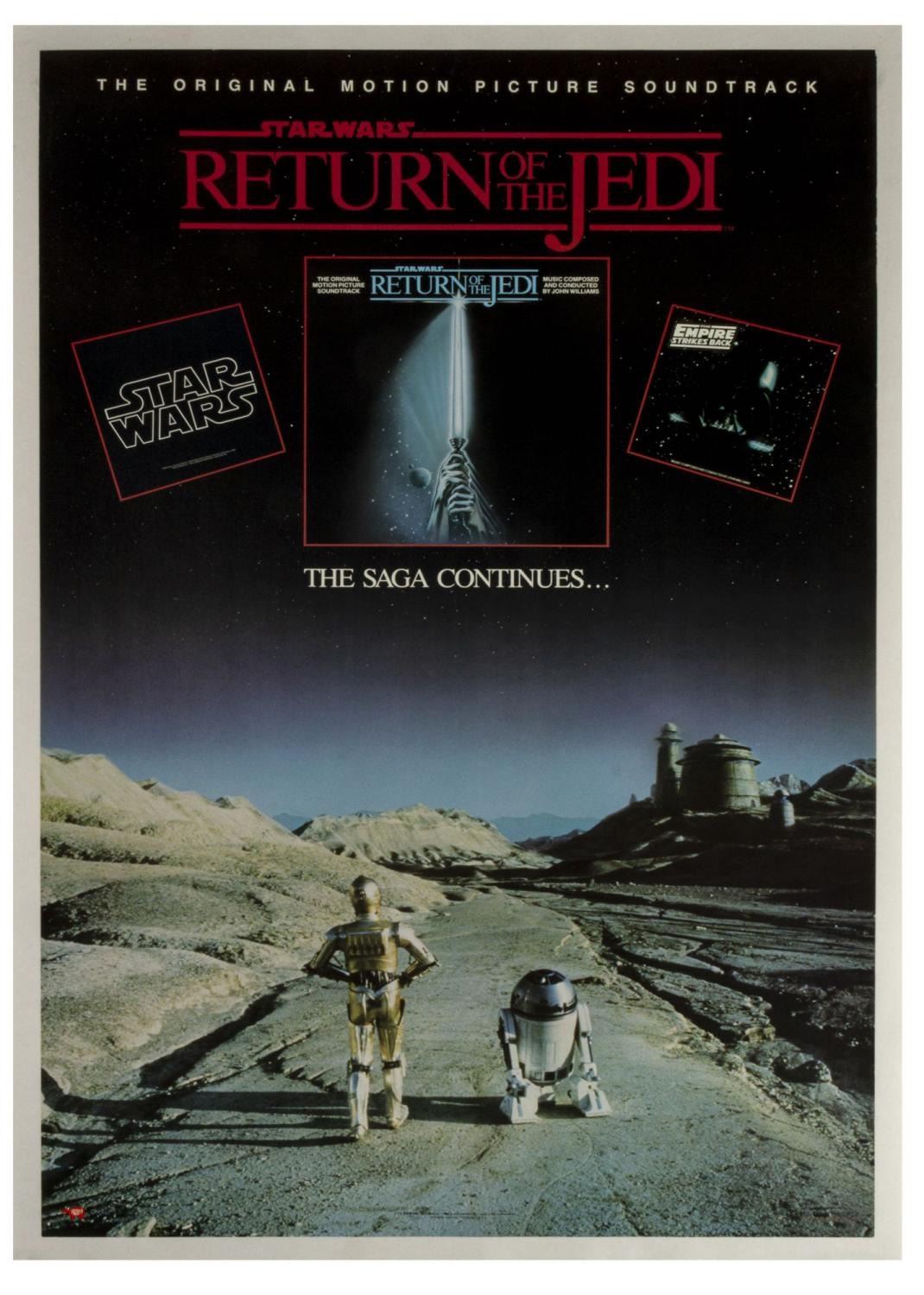 (RSO Records, 1983) A poster for the release of the original motion picture soundtrack for “Return of the Jedi” with music by renowned composer John Williams. Measuring 22.5” x 33”, the poster is in very good condition, linen-backed for preservation, with some wear around the edges.