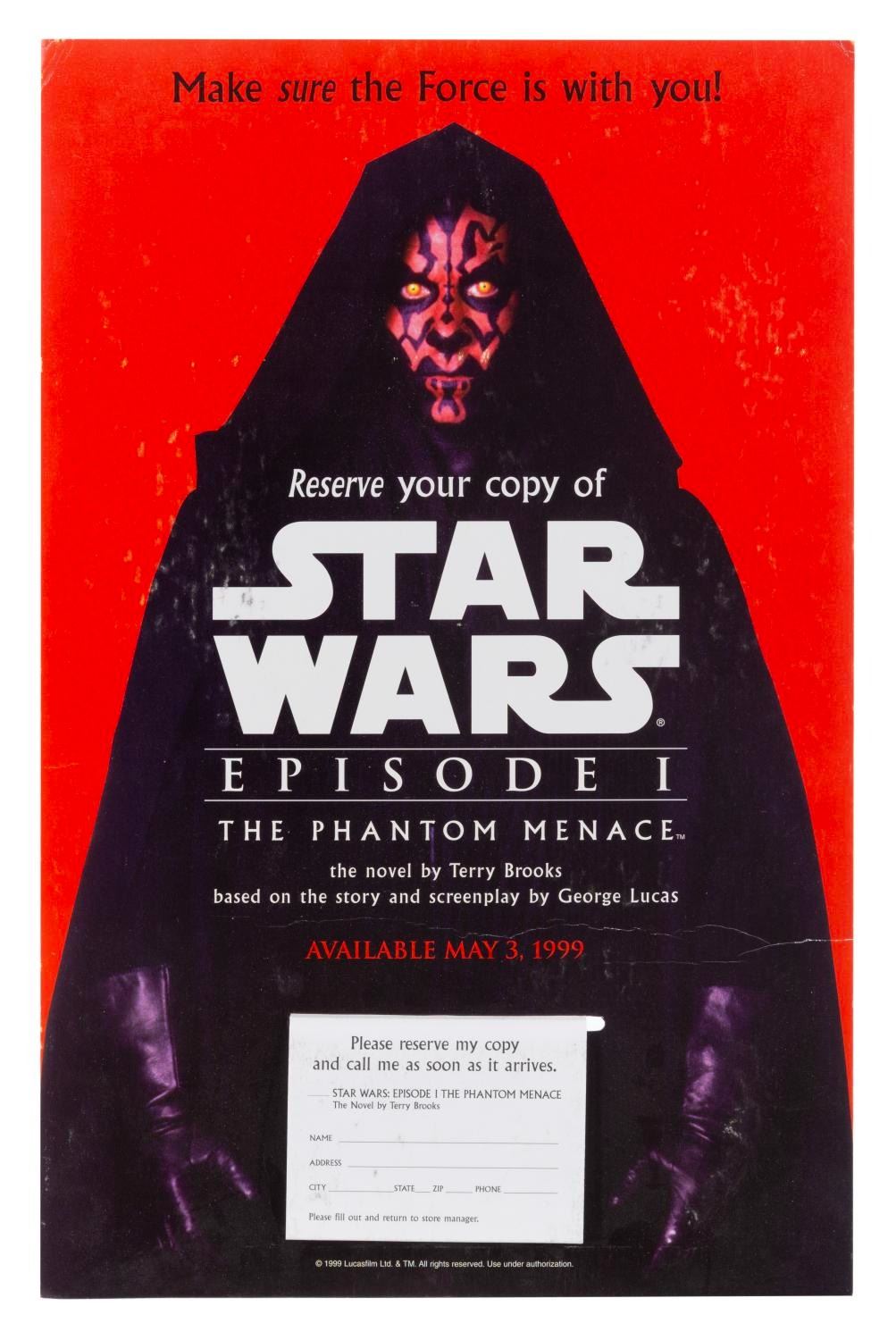 (Del Ray, 1999) A “Star Wars: The Phantom Menace” novelization release display with a pad of blank reservation forms. Measuring 11” x 17” x 6” deep, the display is in good condition with surface and corner wear, and a heavy 8” crease along the lower third.