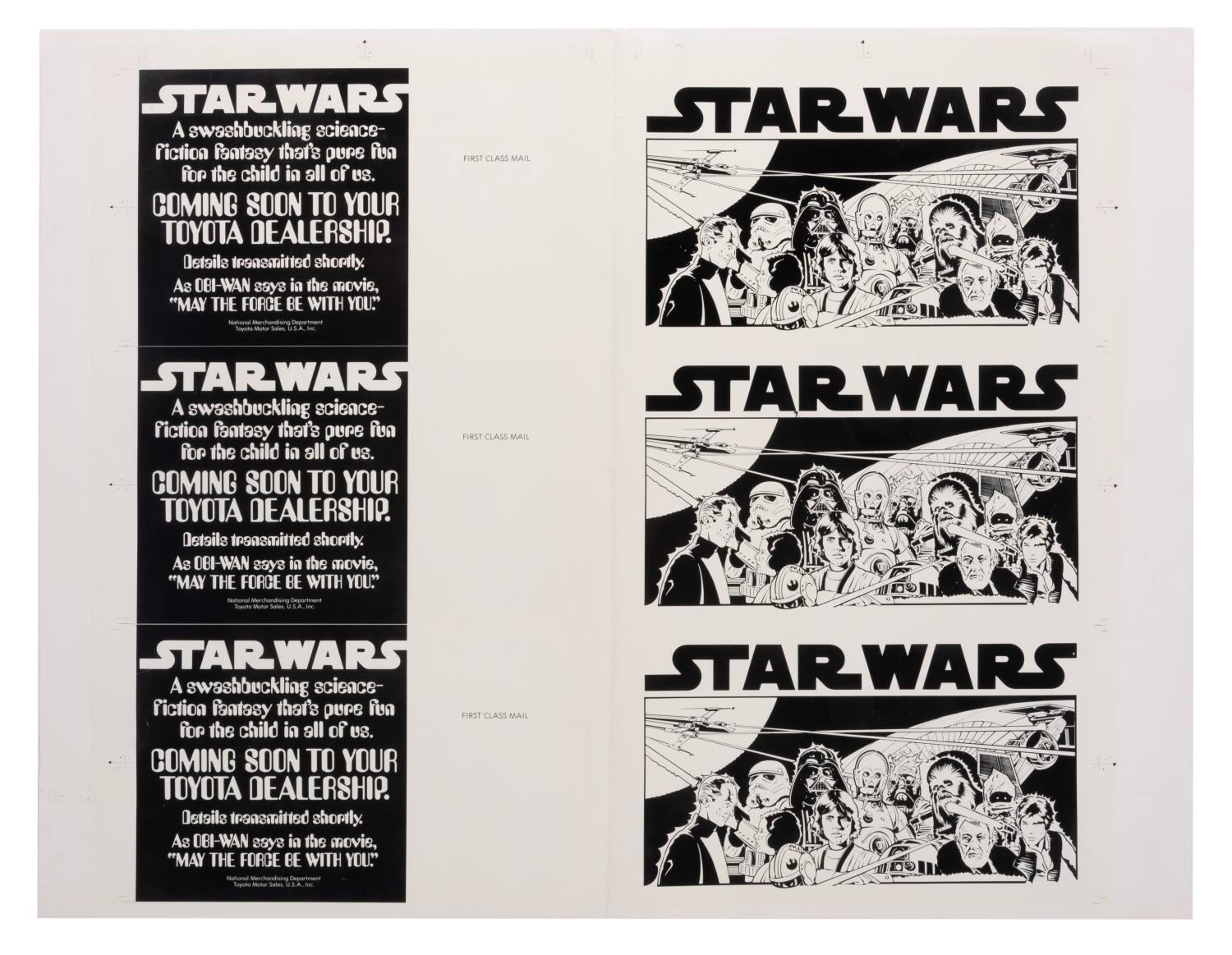 (20th Century Fox, 1977) A double-sided, uncut printer's proof sheet from a "Star Wars" promotional campaign with Toyota Dealerships. The large 20" x 26" sheet is folded in half down the center, with each image measuring 6.25" x 9.75". The proof is in good condition with some creasing and edge wear throughout from use.