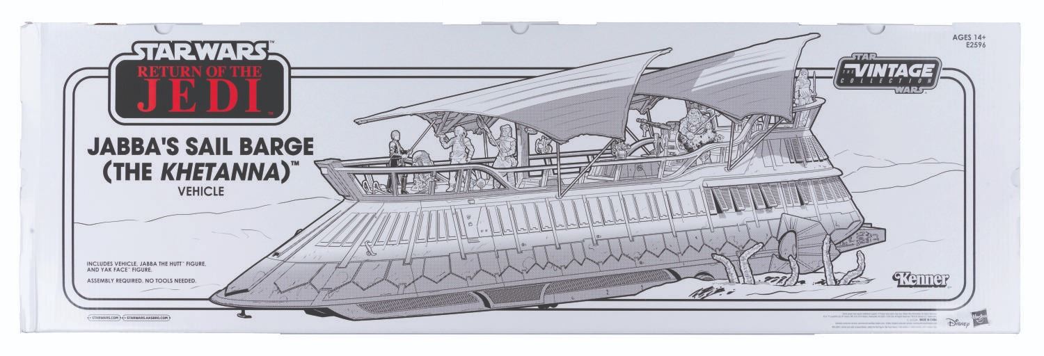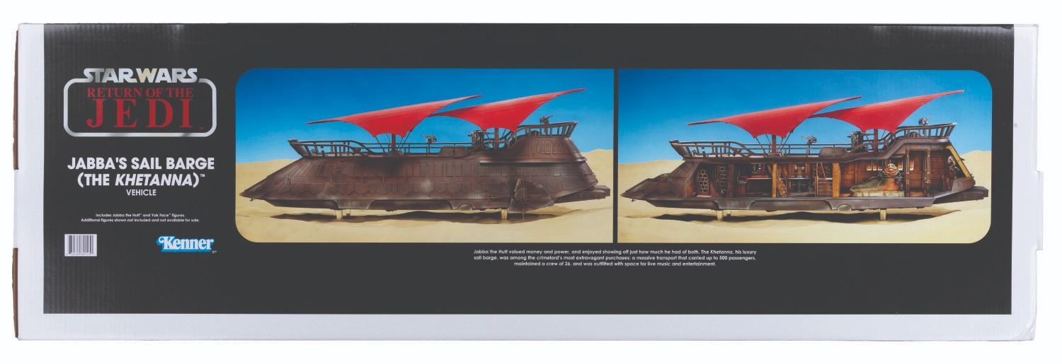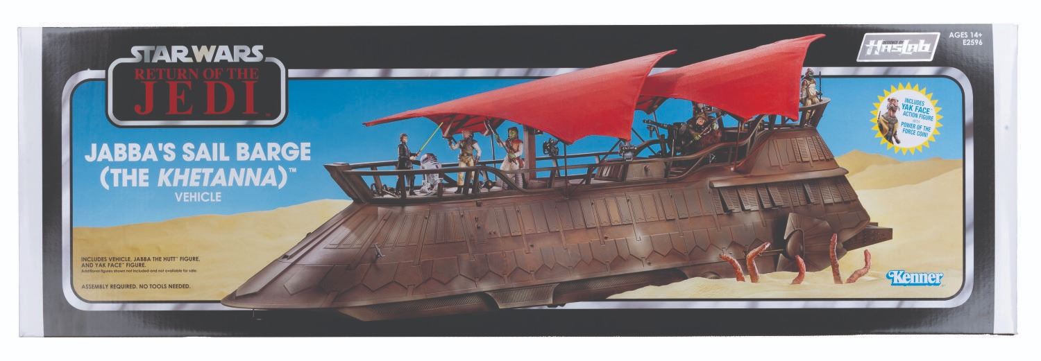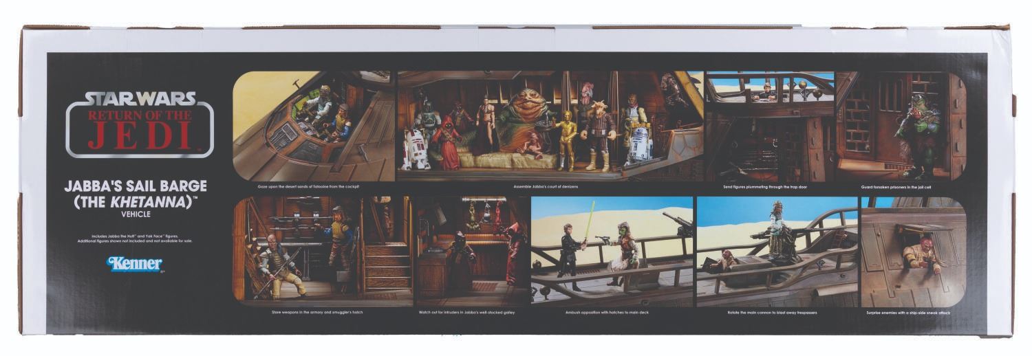 (Hasbro, 2019) A rare Star Wars The Vintage Collection Jabba’s Sail Barge (The Khetanna). Memorably featured at the beginning of “Star Wars: Episode IV - Return of the Jedi,” the barge marked the final resting place of Jabba the Hutt, as he was strangled to death by a famously gold bikini-clad Princess Leia. This exquisitely detailed 1:1 scale model barge was created by Hasbro via the crowdfunding platform HasLab and was released in a limited edition to backers only. Accessible interior and exterior decks, cloth sails, rotating cannons, a sliding prisoner’s cell door, and operational shutters in Jabba’s Lounge are just a few of the finely crafted details that make this hard-to-find collectible an immersive and impressive piece of Star Wars history. Included in the box are the barge, Jabba the Hutt and Yak Face figures, and a 64-page booklet titled “Jabba’s Sail Barge (The Khetanna): Behind the Workbench,” which chronicles the development of both the film’s barge scene and the toy itself. Assembly is required, though no additional tools are needed. The Khetanna is the largest Star Wars product that Hasbro made—ever. In its original box measuring 16” x 52” x 16”, the massive unopened barge is assumed in fine condition.