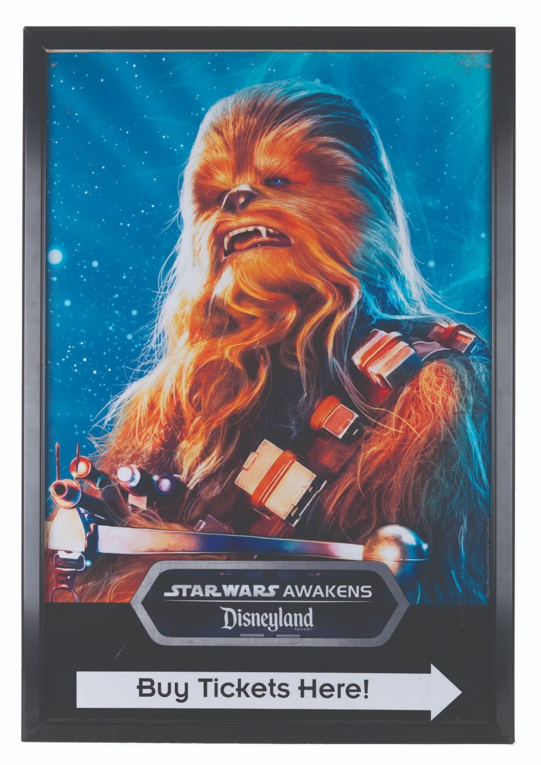 (Disneyland, 2015) A double-sided Disneyland ticket sales sign featuring Chewbacca from Star Wars on one side, and Olaf from "Frozen" on the other. Measuring 24" x 36", the poster displays in good Park-used condition with typical edge wear and light scuffs, and holes to the corners from display.