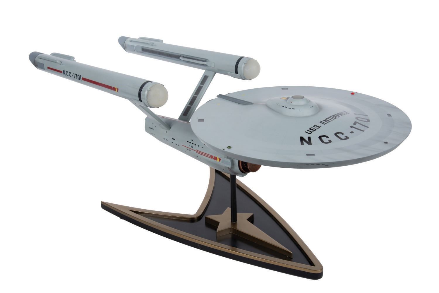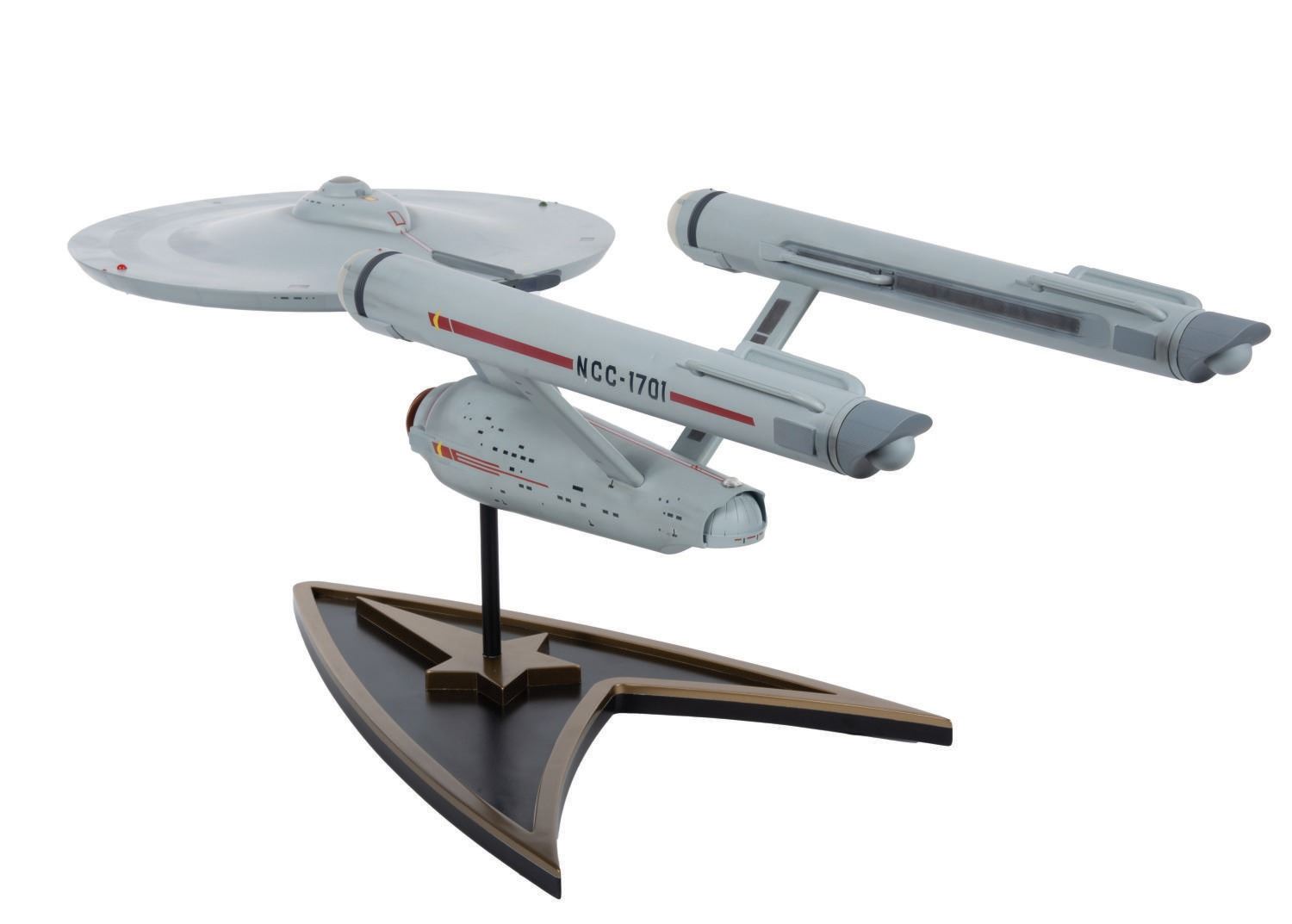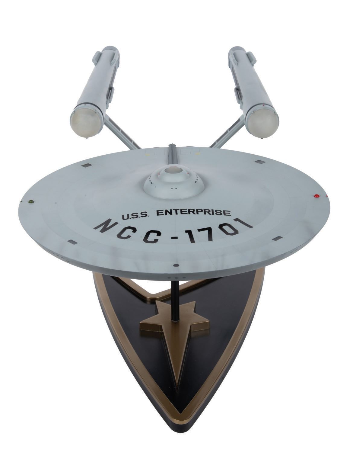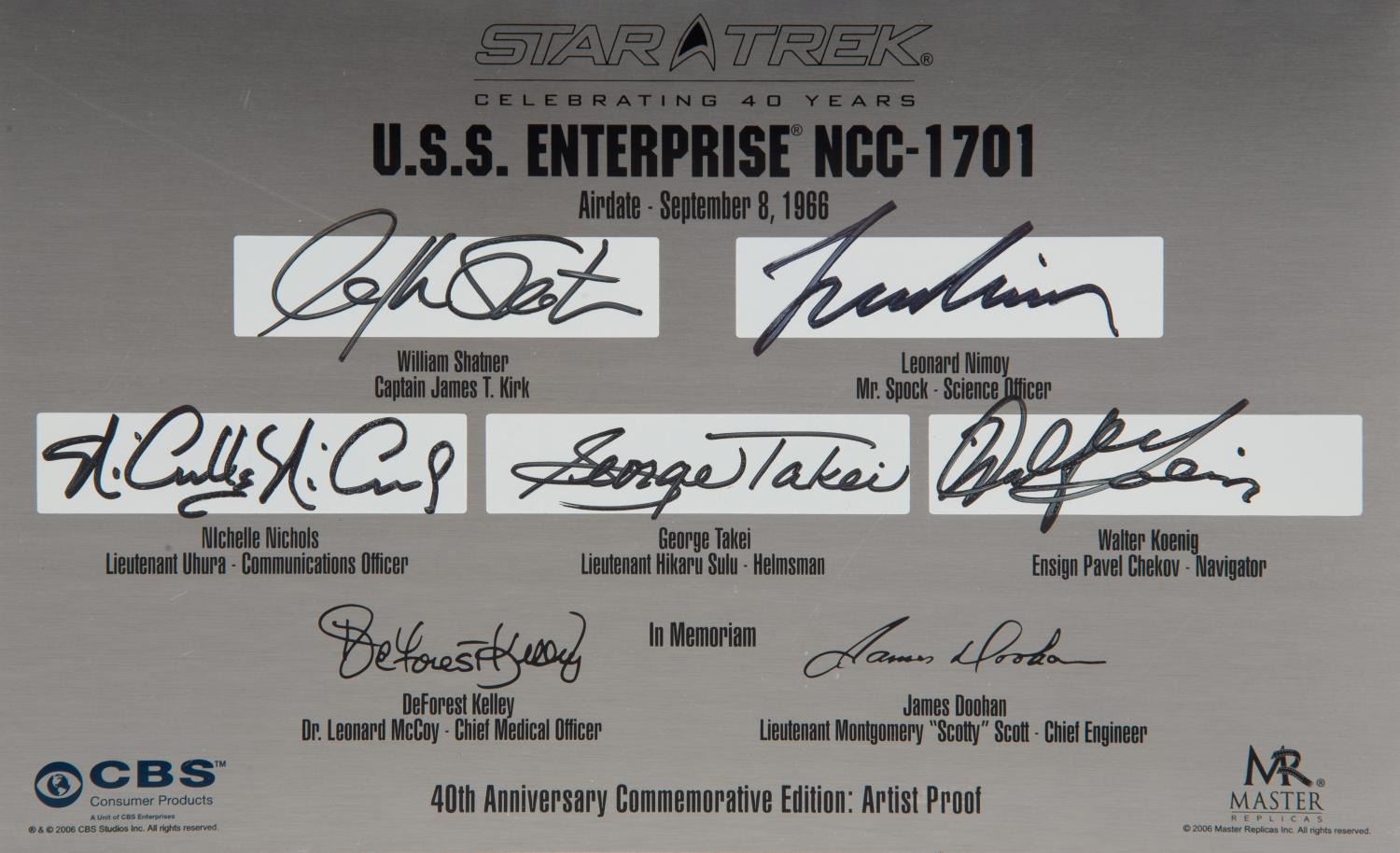 (Master Replicas, 2006) A rare, Static Test Sample of the 40th Anniversary Commemorative Edition U.S.S. Enterprise model by Master Replicas. This rare "Static" Factory Test Sample features "Black Weathering" paint details and does not include the electronic features found in later prototypes and final models. The prototype box contains hand-cut styrofoam packaging. The replica comes with a plaque signed by William Shatner (Captain James T. Kirk), Leonard Nimoy (Mr. Spock), Nichelle Nichols (Lieutenant Uhura), George Takei (Lieutenant Sulu), and Walter Koenig (Ensign Chekov). Measuring 32" long, 14.5" at its widest, 8" tall (and 13.5" tall, atop base), the replica is in fine condition.