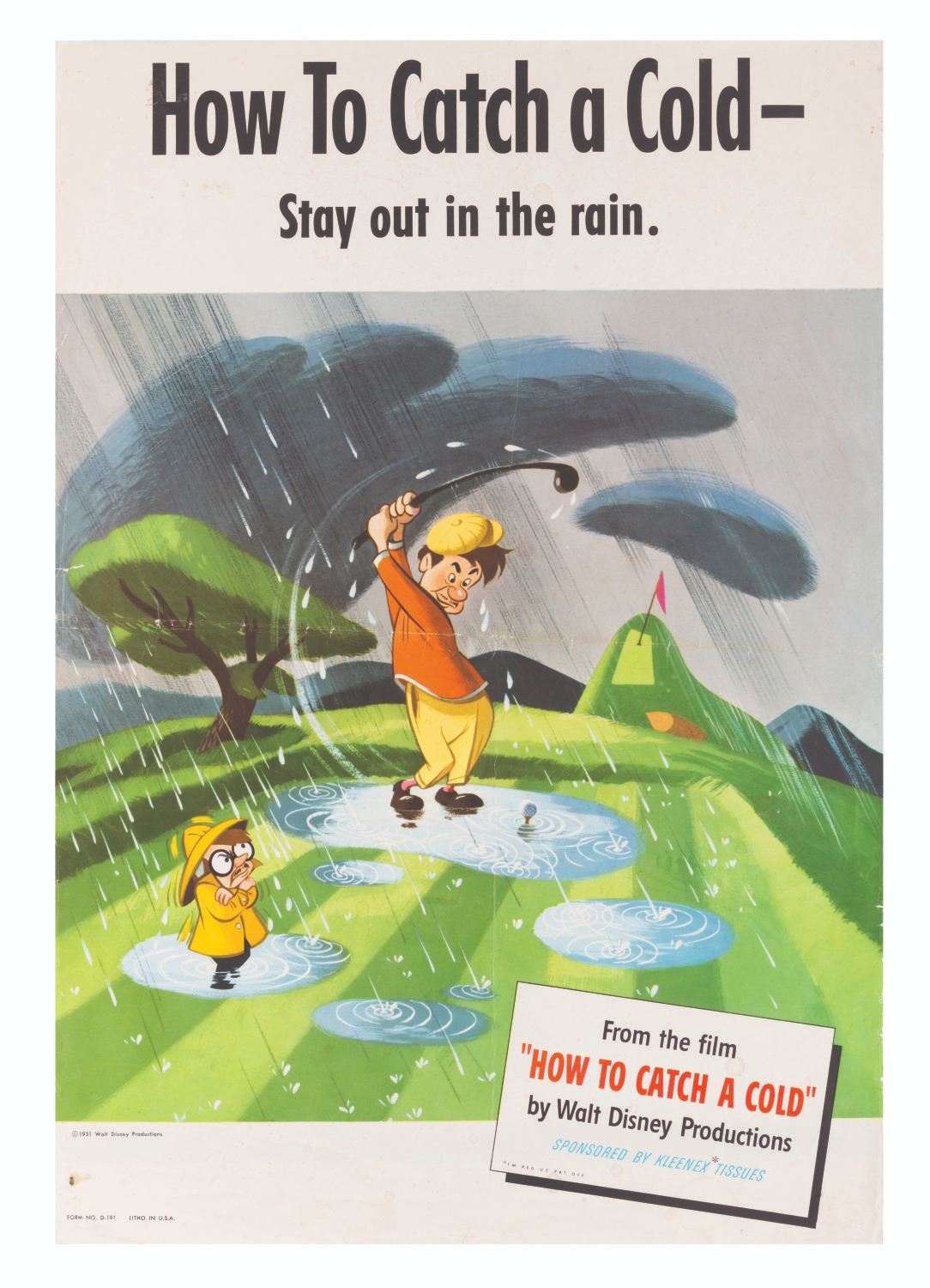 (Disney, 1951) A promotional poster for the Disney animated educational short “How To Catch a Cold.” A series of six different posters for the film were produced with information on how to catch, spread, and cure a cold. Measuring 14” x 20”, the poster is in fair condition with edge wear including small tears, creasing, discoloration from age, pinholes, stains, and a horizontal fold at the center.