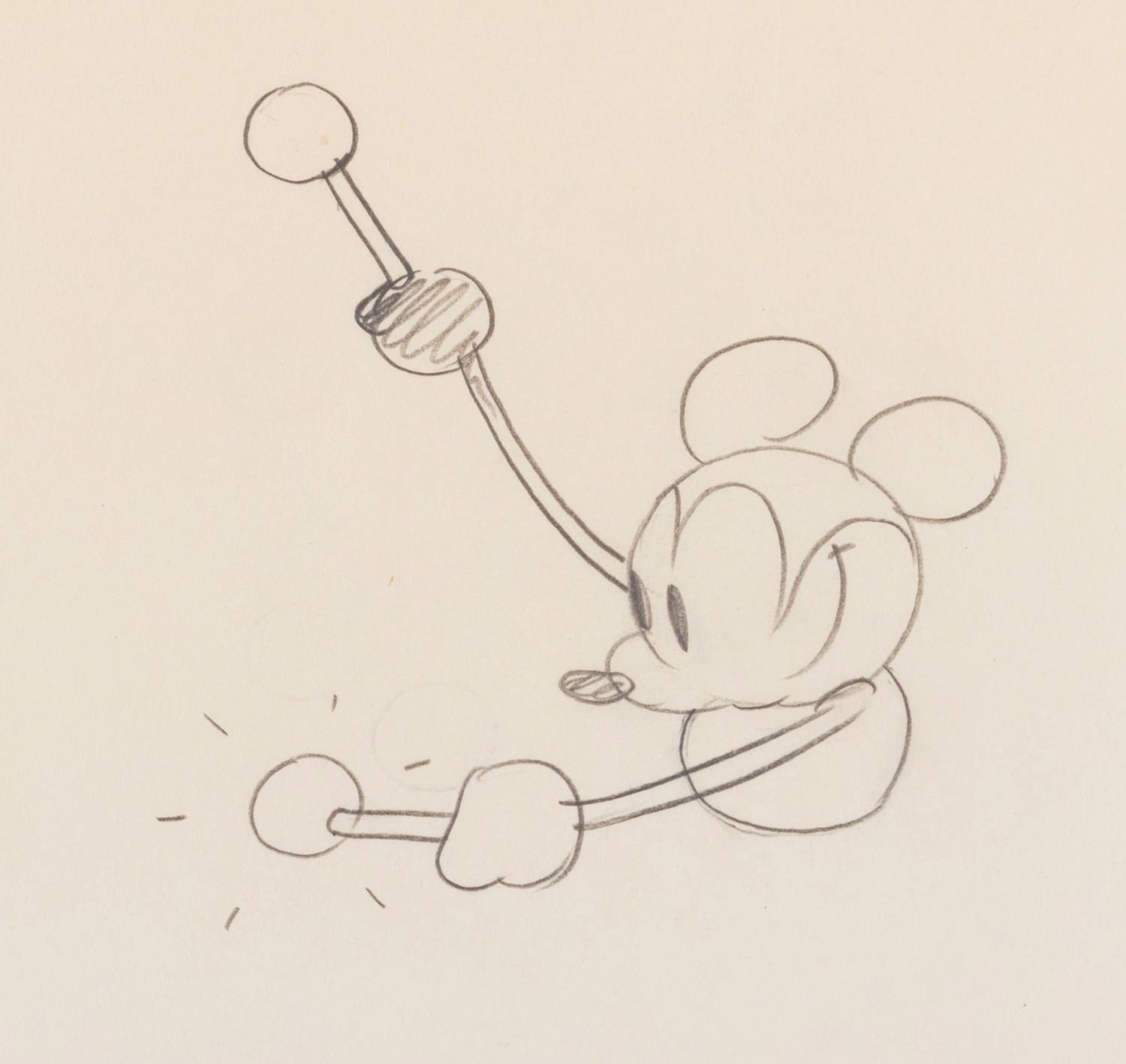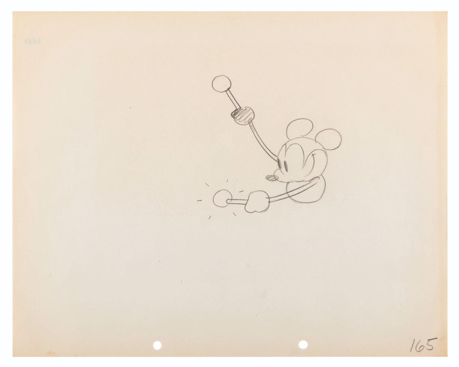 (Disney, 1928) An original production drawing of Mickey Mouse from "Steamboat Willie," the short that established Mickey as an international star and transformed Disney into the premier brand in entertainment. Accomplished in graphite, this drawing from the iconic short measures 3.75" x 4" on 9.5" x 12" animation paper. The art is in very good condition with light creases, discoloration from age, and minor spots, which do not affect the image.