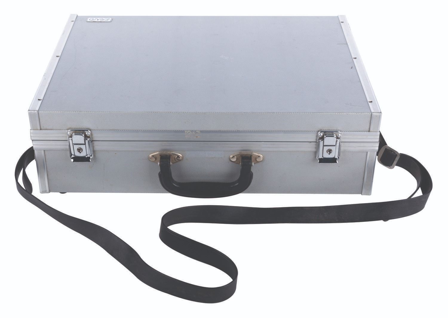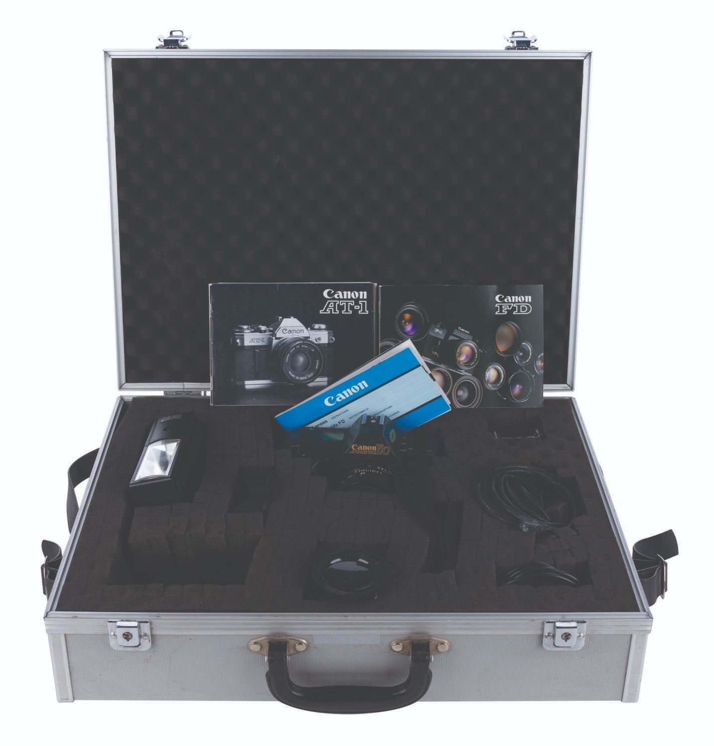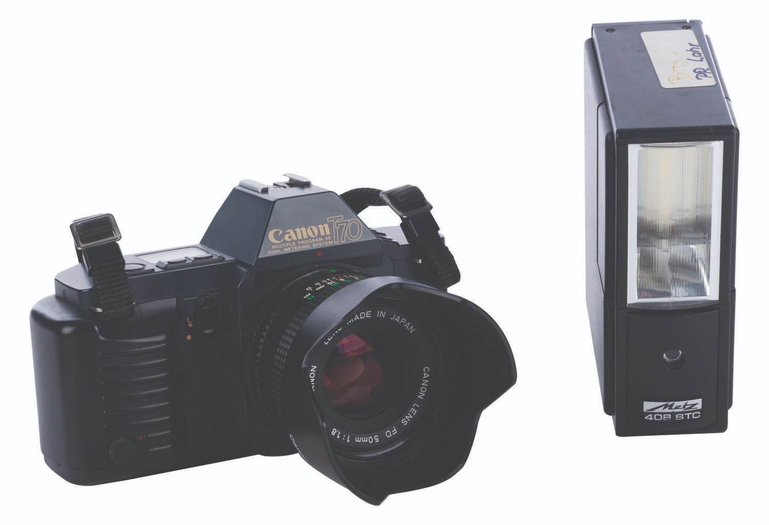 (TriStar, 1986) A Canon T70 35mm still camera used on the set of Jim Henson's 1986 musical fantasy Labyrinth, during the production of the film. The camera comes with a carrying case, flash, lens hood, and other attachments. The camera has been tested in good working condition, requiring (2) AA batteries (not included). The flash has not been tested, but appears in good condition, with slight wear to the power cable. The entire case measures 5.5"x13"x18", with all components in good production-used condition.