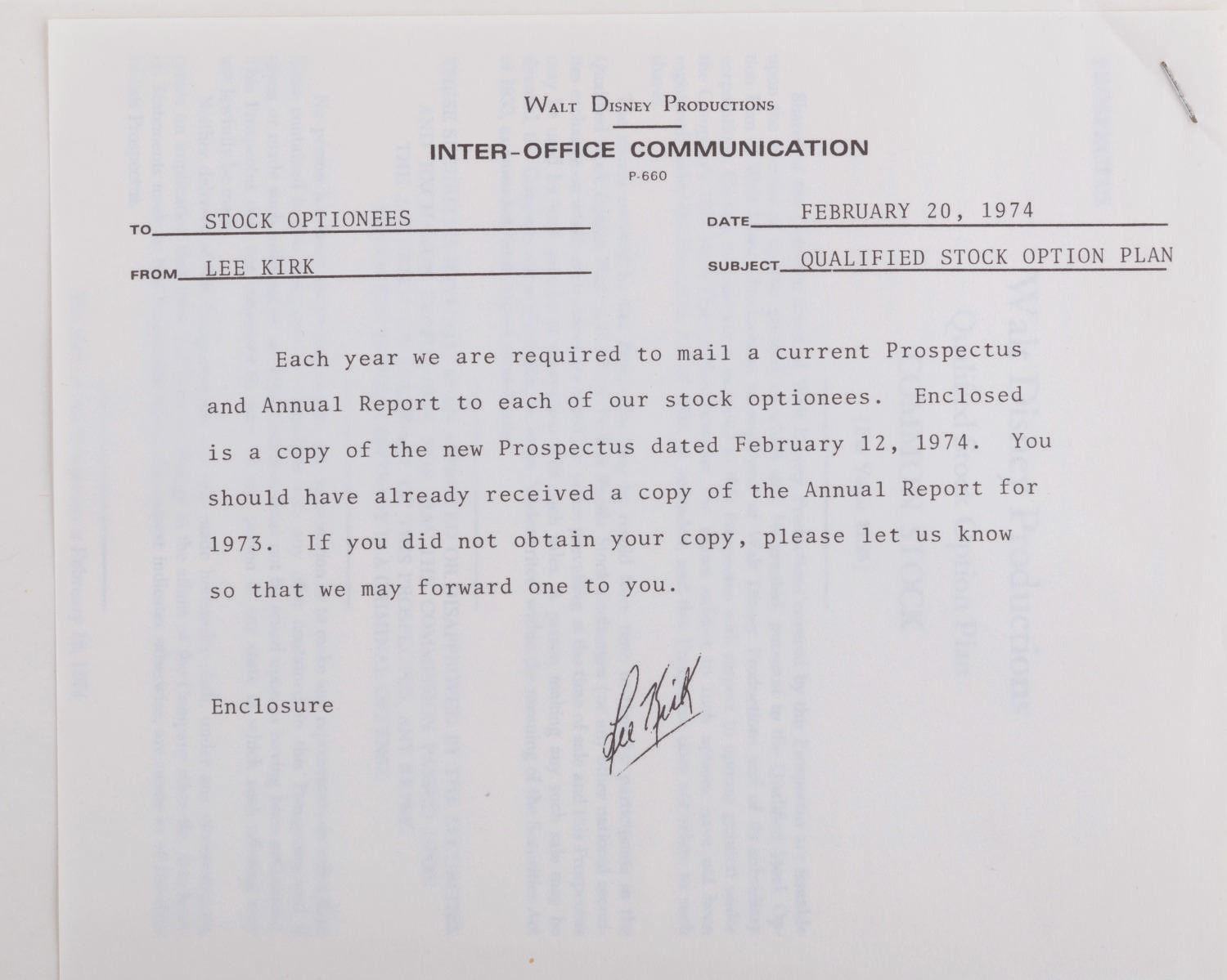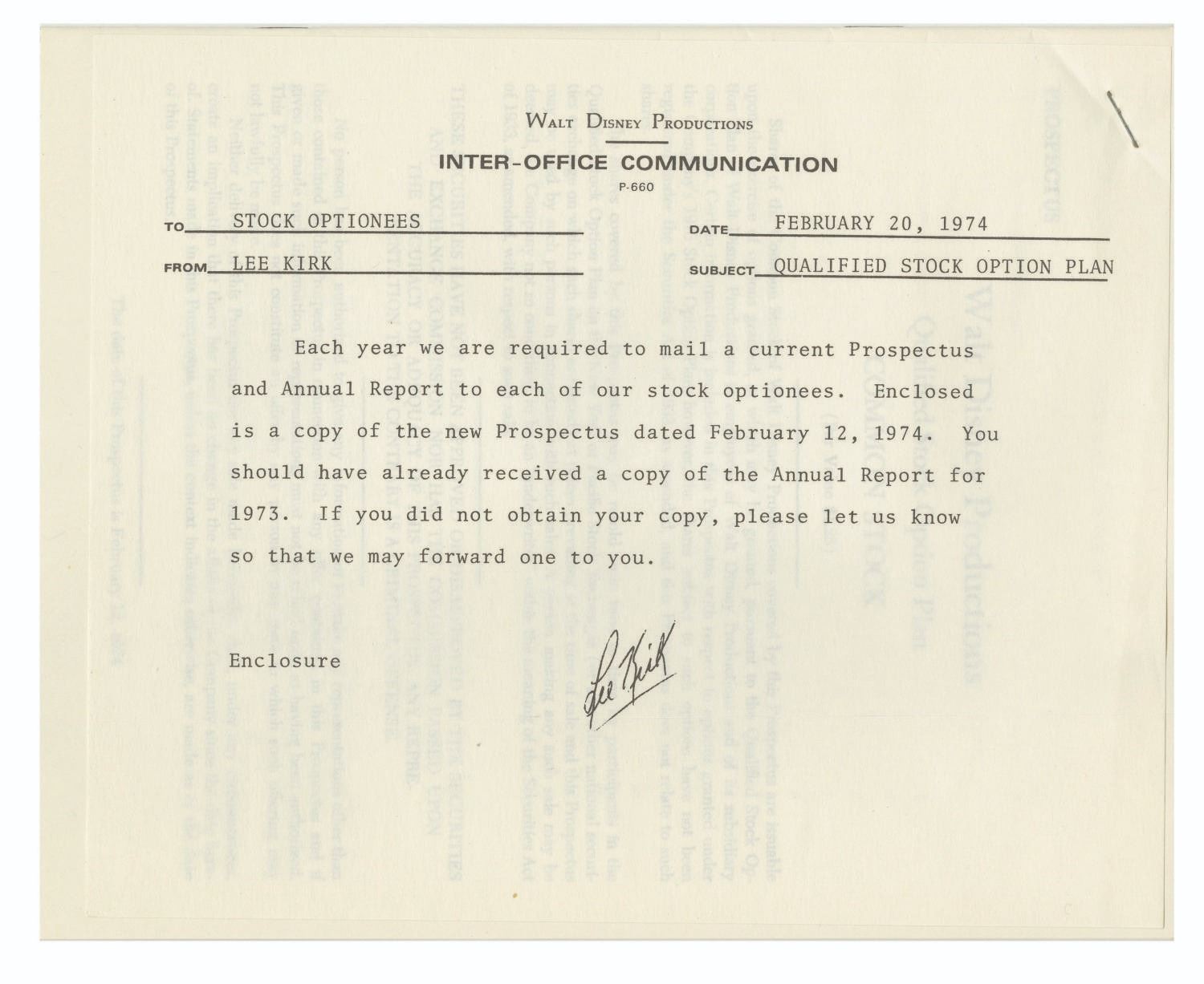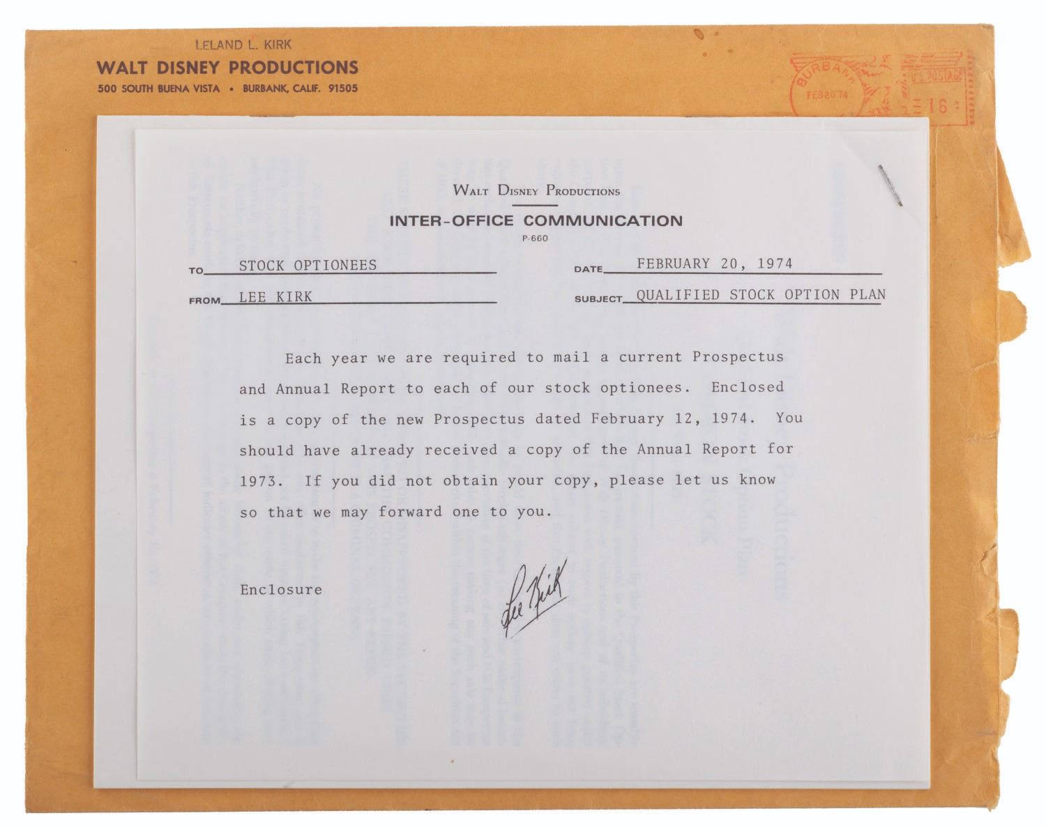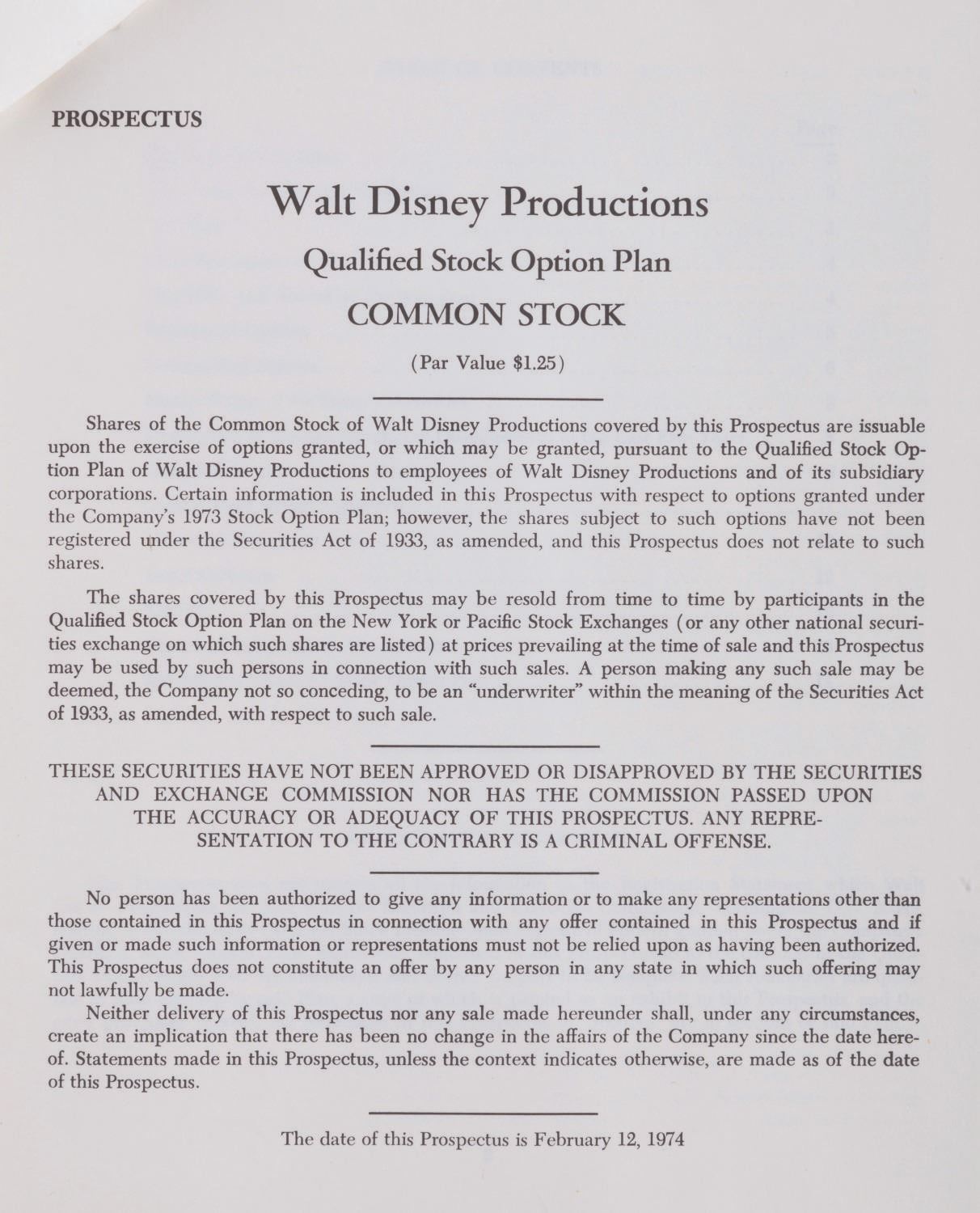 (Walt Disney Productions, 1974) A prospectus sent to stock optionees of Walt Disney Productions. The 18-page document details the investment offerings and plans available to employees and includes the original mailing envelope. The prospectus measures 9" x 7.25" and is in very good condition with minimal edge wear, although the envelope has moderate wear from handling and opening.