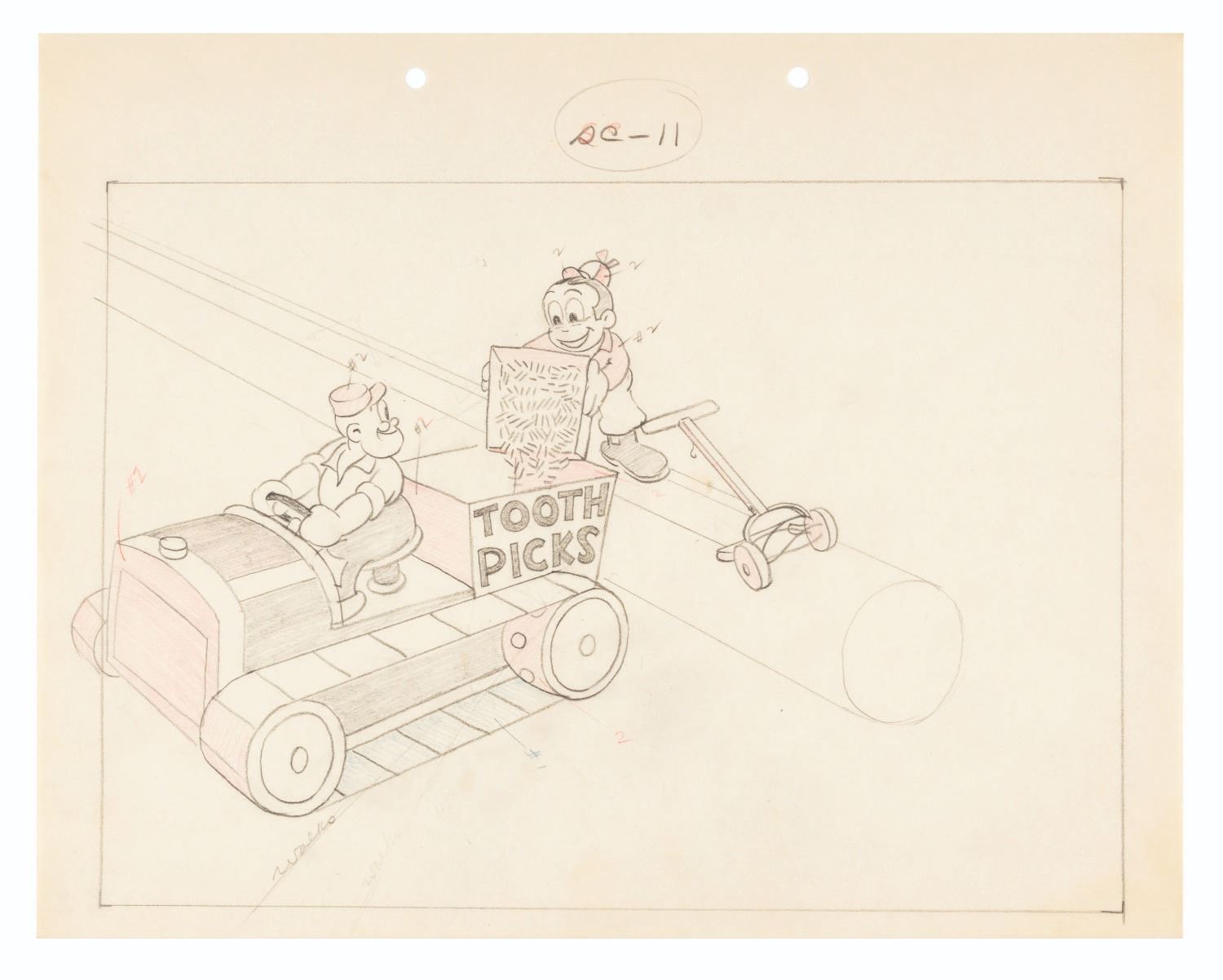 (Schlesigner, 1934) A story drawing of Buddy from the Merrie Melodies short “Buddy the Woodsman.” The graphite and colored pencil drawing includes color callouts for the ink and paint department. With an image size of 7.5” x 11” on 9.5” x 12” animation paper, the drawing is in very good condition with light creases and discoloration from age.