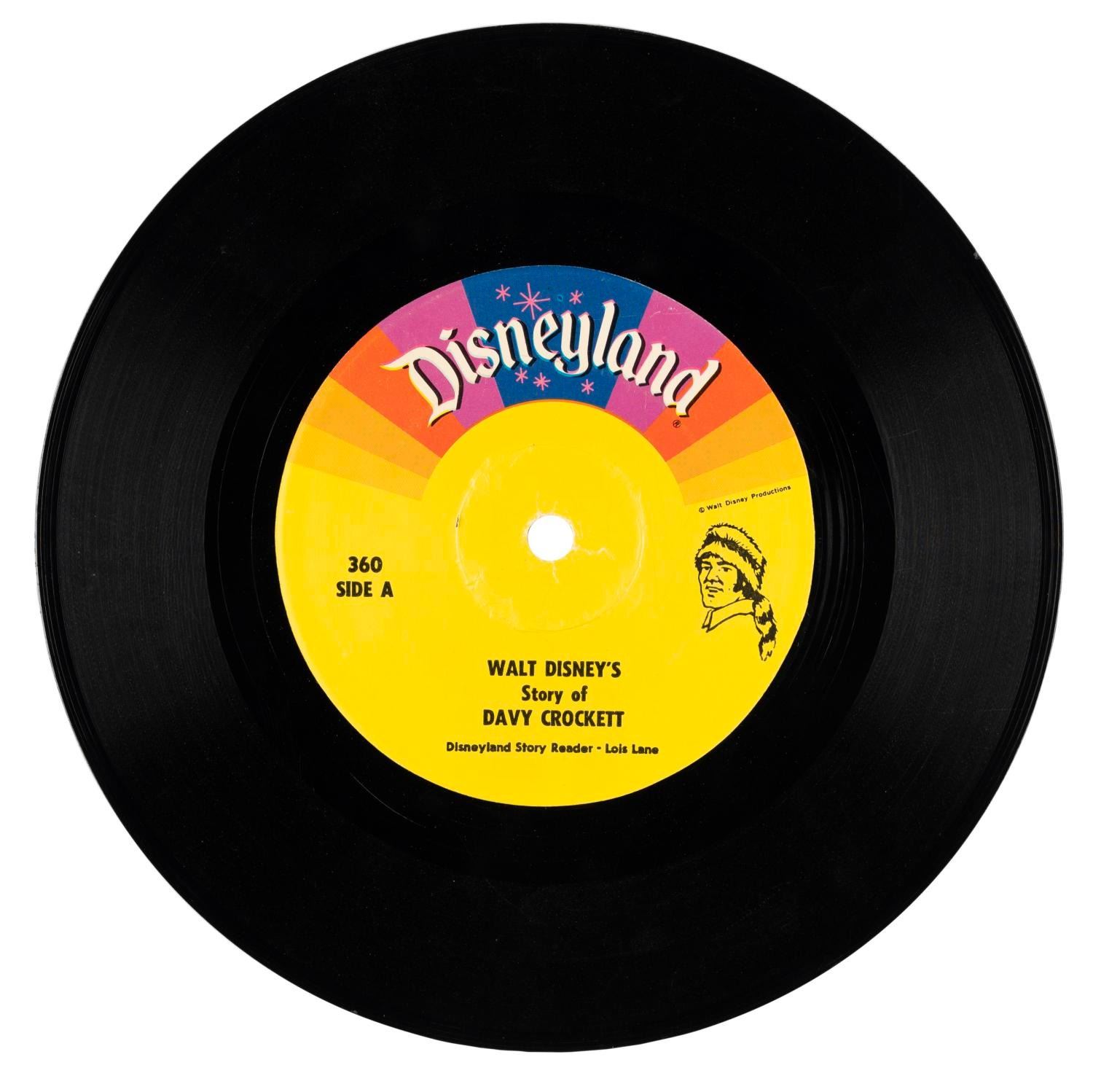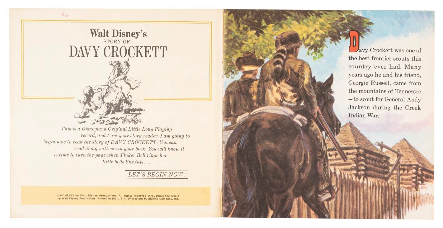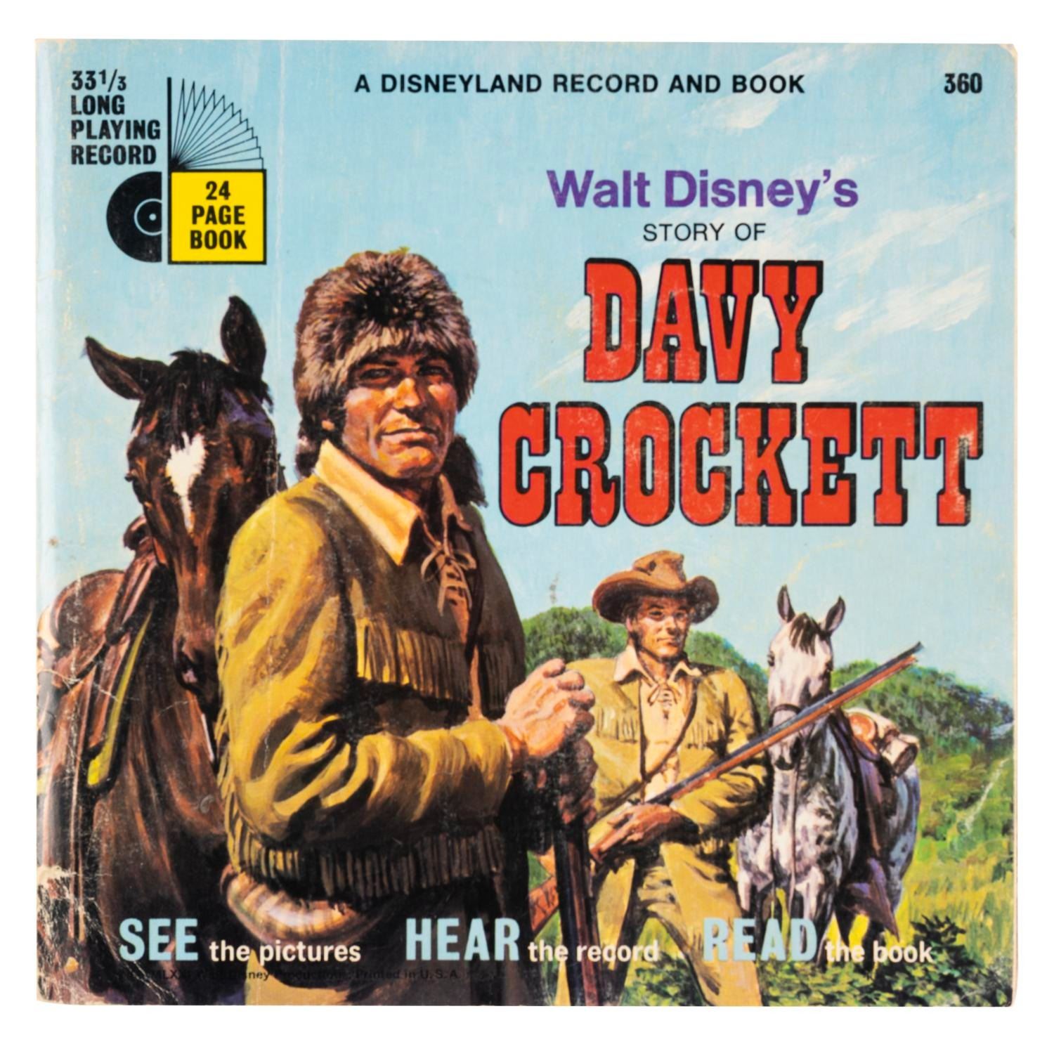 (Disney, 1982) A Story of Davy Crockett record with 24-page illustrated story book. The 6.75" record and 7.25" x 7" story book are in good condition with handling wear typical of use.